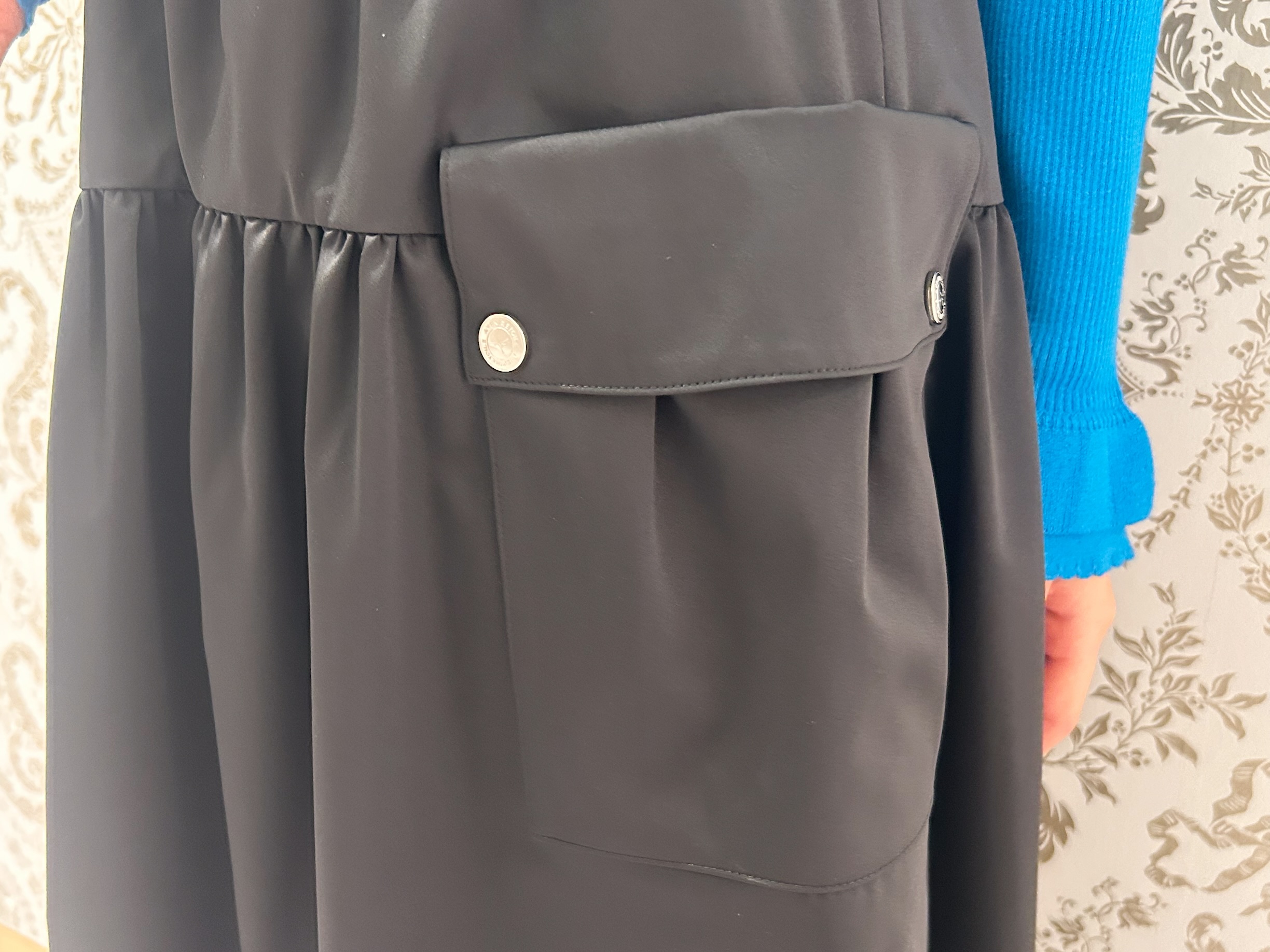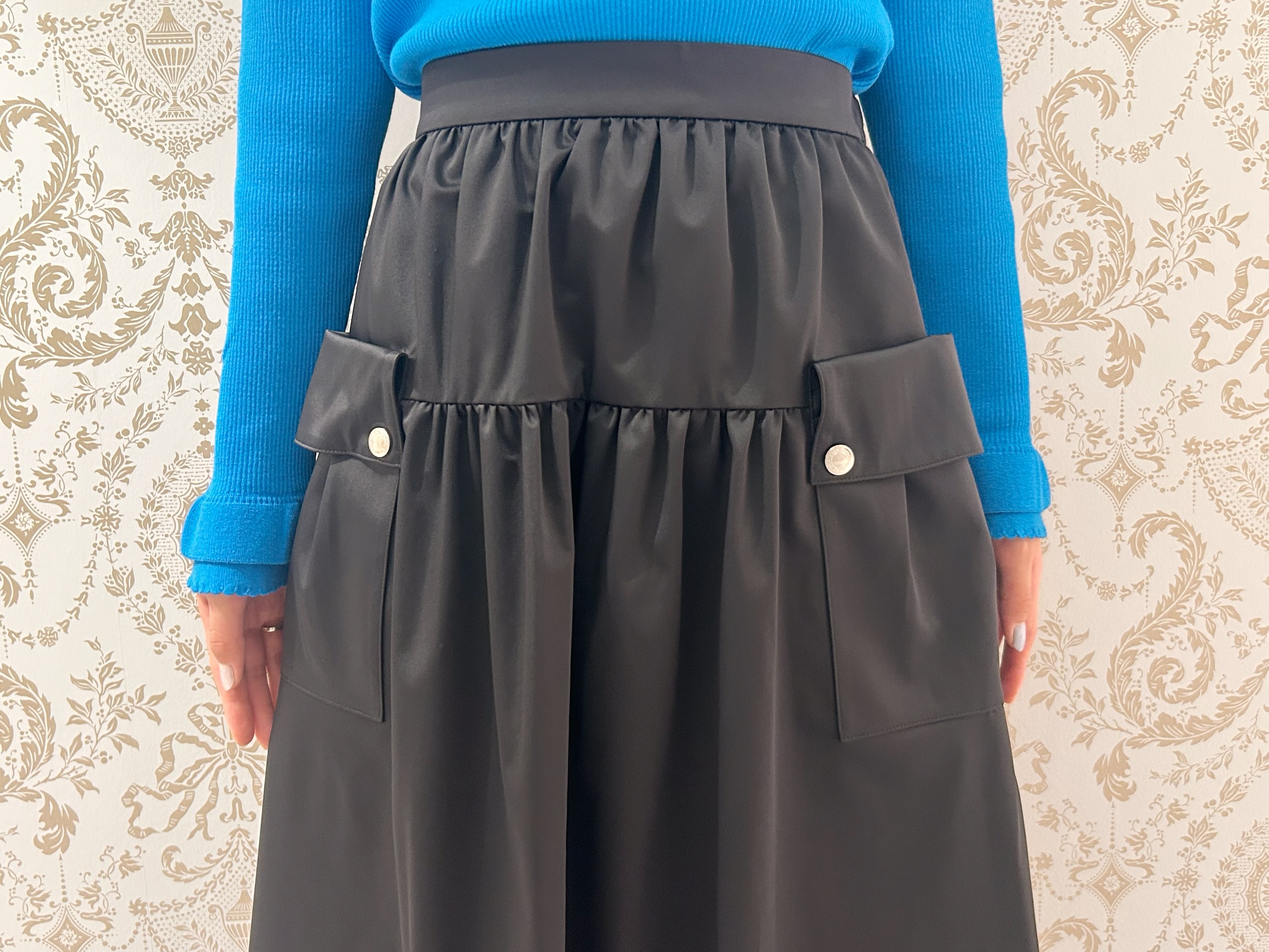 ウエストにギャザー切替の入ったフレアデザインが女性らしい印象を与えつつ、大きめのフラップポケットがモードな雰囲気をプラス。