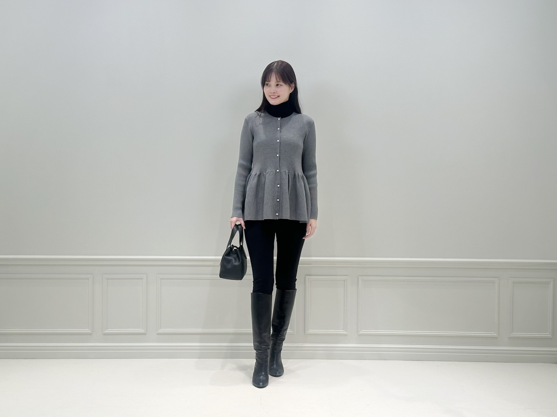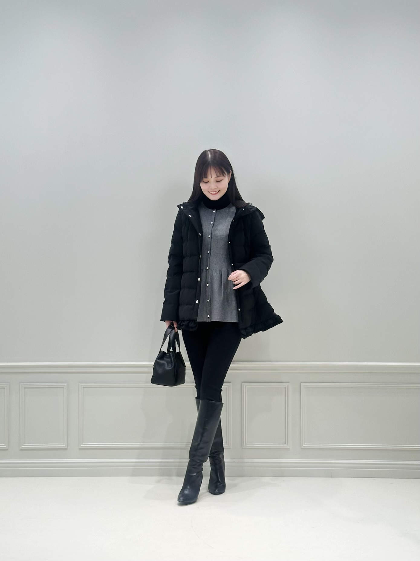 ペプラムシルエットが自然にスタイルアップを叶え、ダウンを脱いだ時にもきちんと感のある印象に。ボトムはストレッチレギンスパンツを合わせ、動きやすさと防寒性を両立しました。