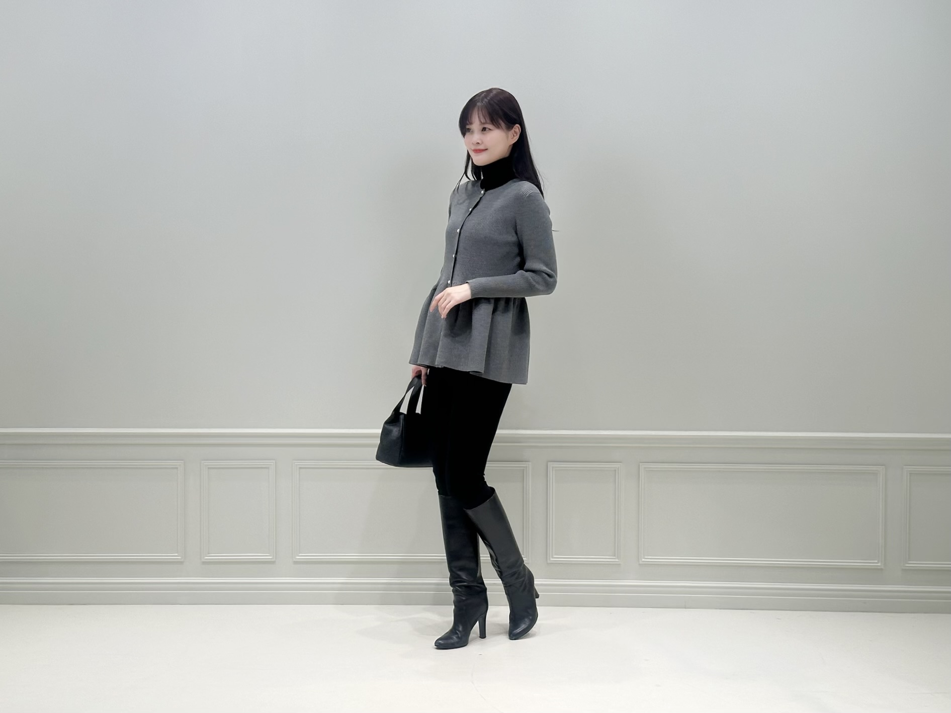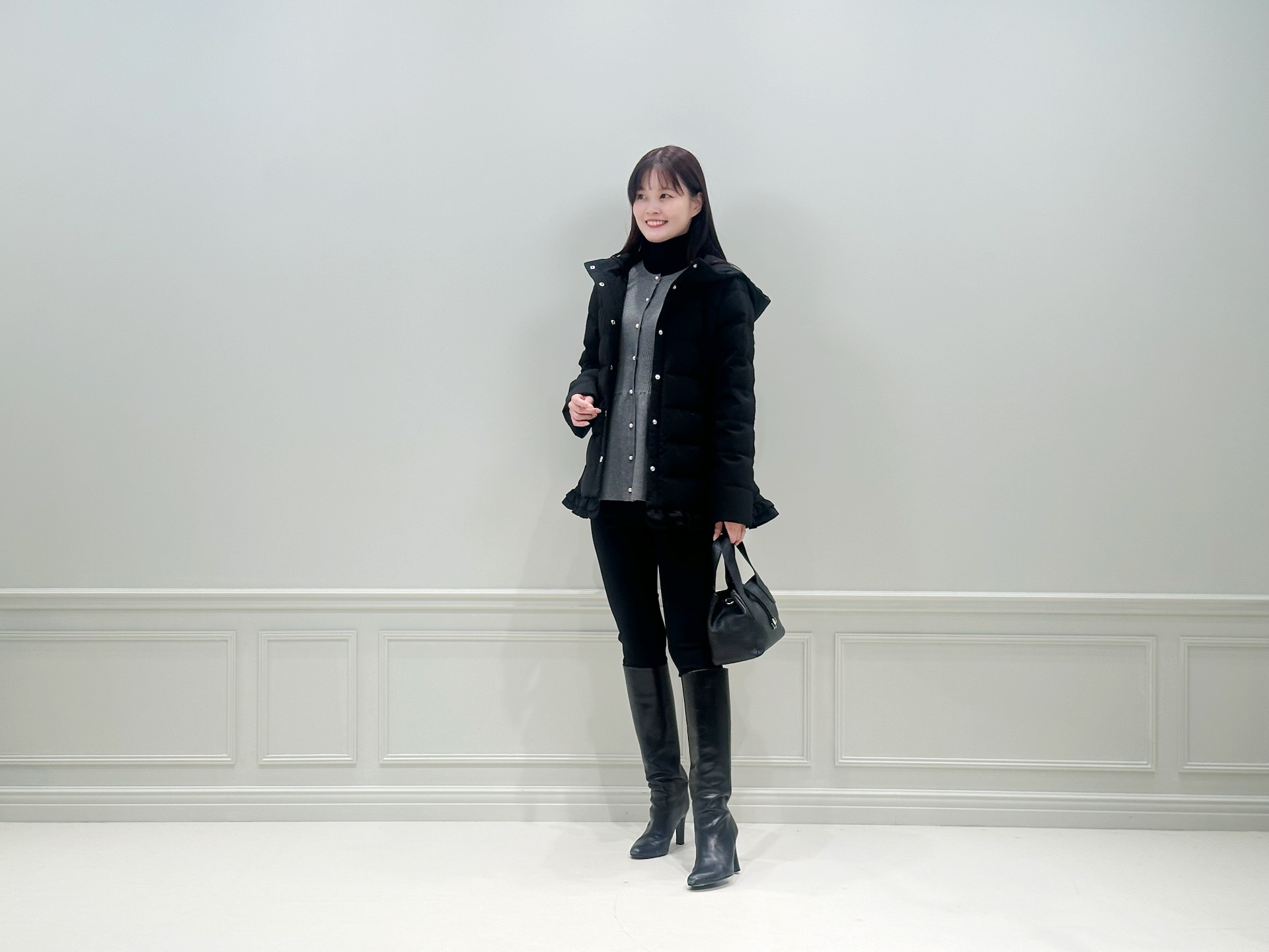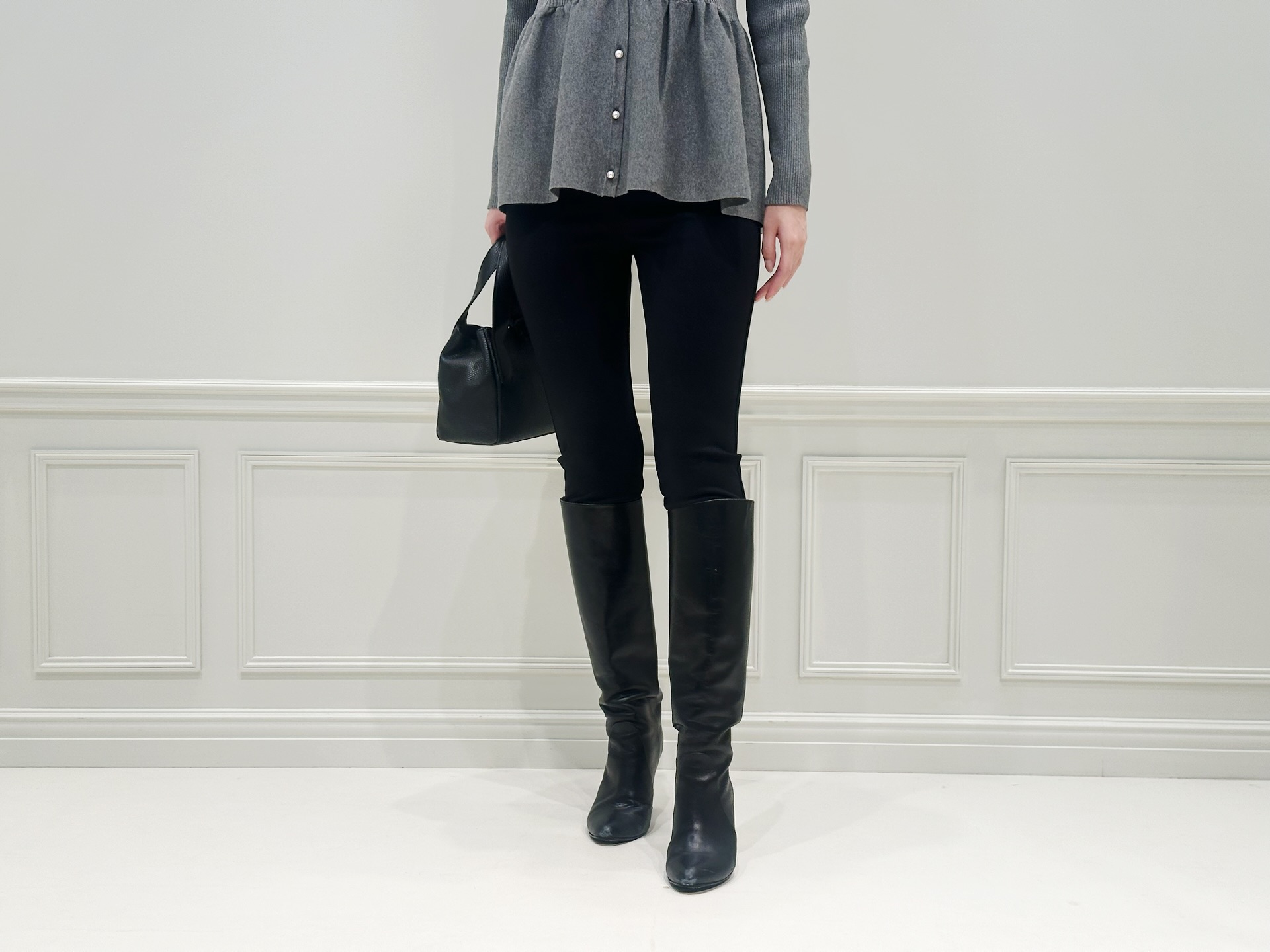 ボトムにはストレッチ性のあるレギンスパンツを合わせ、ロングブーツで足元までしっかりと防寒しました。全体をブラック×グレーでまとめることで、甘さを程よく抑えた大人の冬スタイルに仕上げています!