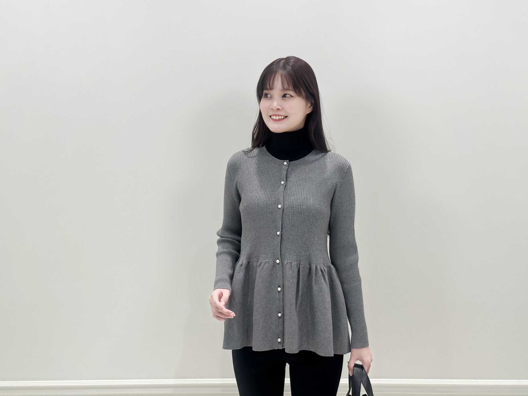 ダウンの中のコーデは、パールボタンペプラムニットプルオーバーにタートルネックリブニットを重ねて着用。首元までしっかりと暖かく、レイヤードすることで奥行きのあるスタイリングが完成します。