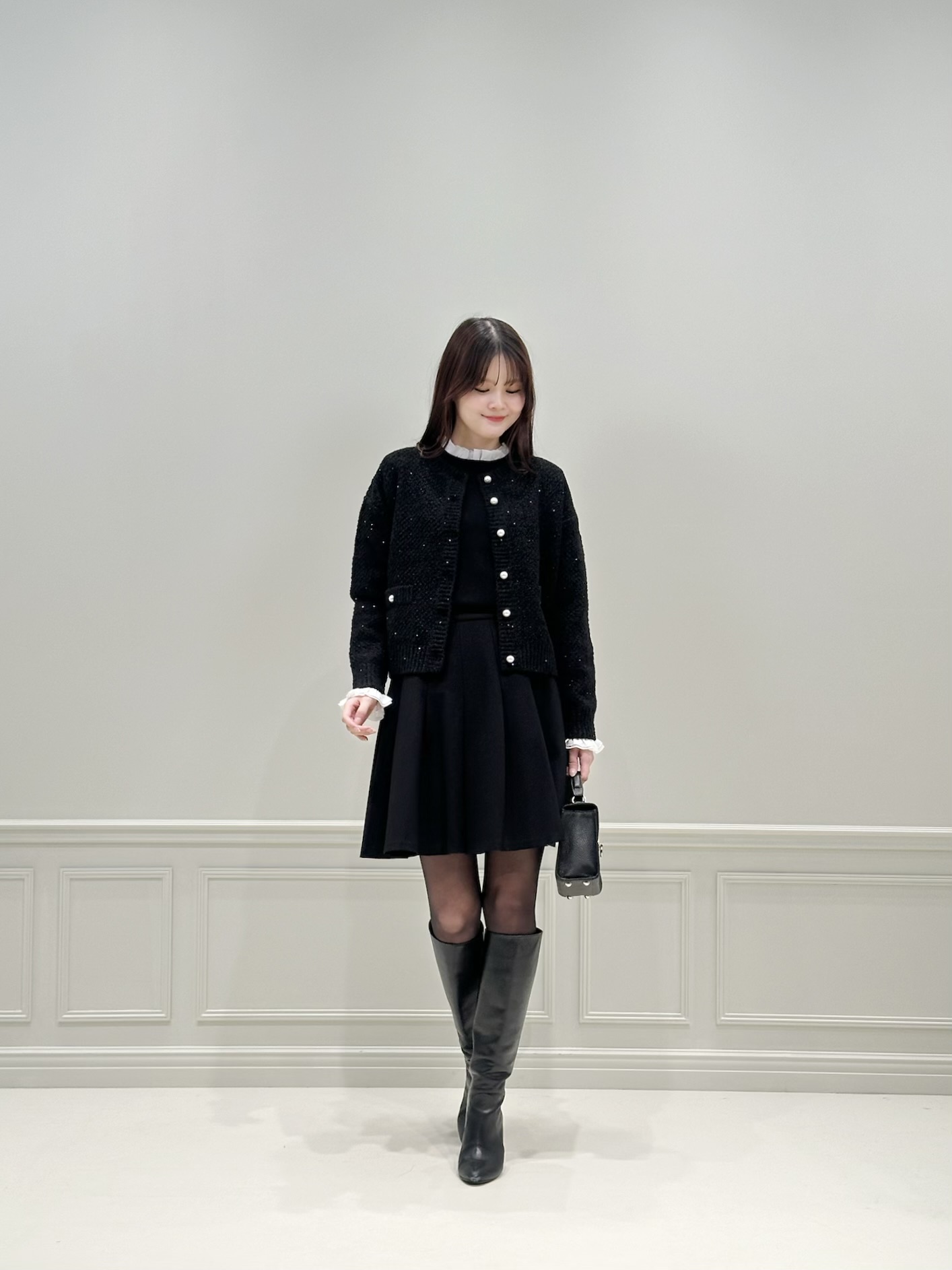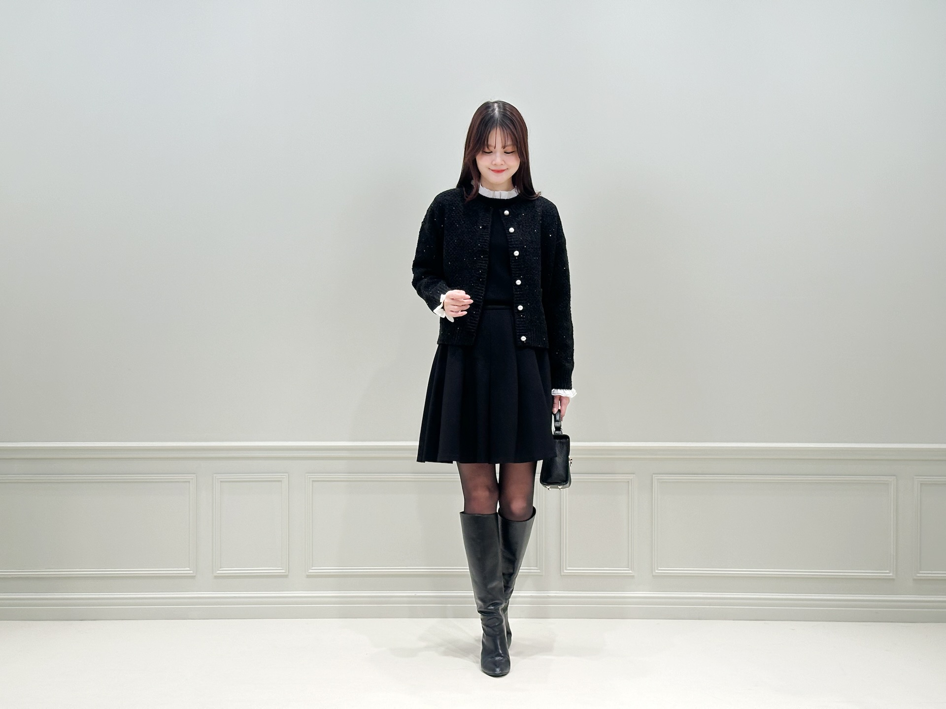 全体に細かく散りばめられたスパンコールが、動くたびにさりげなく煌めきます。重く見えがちな冬ブラックを、一気に華やかに。
