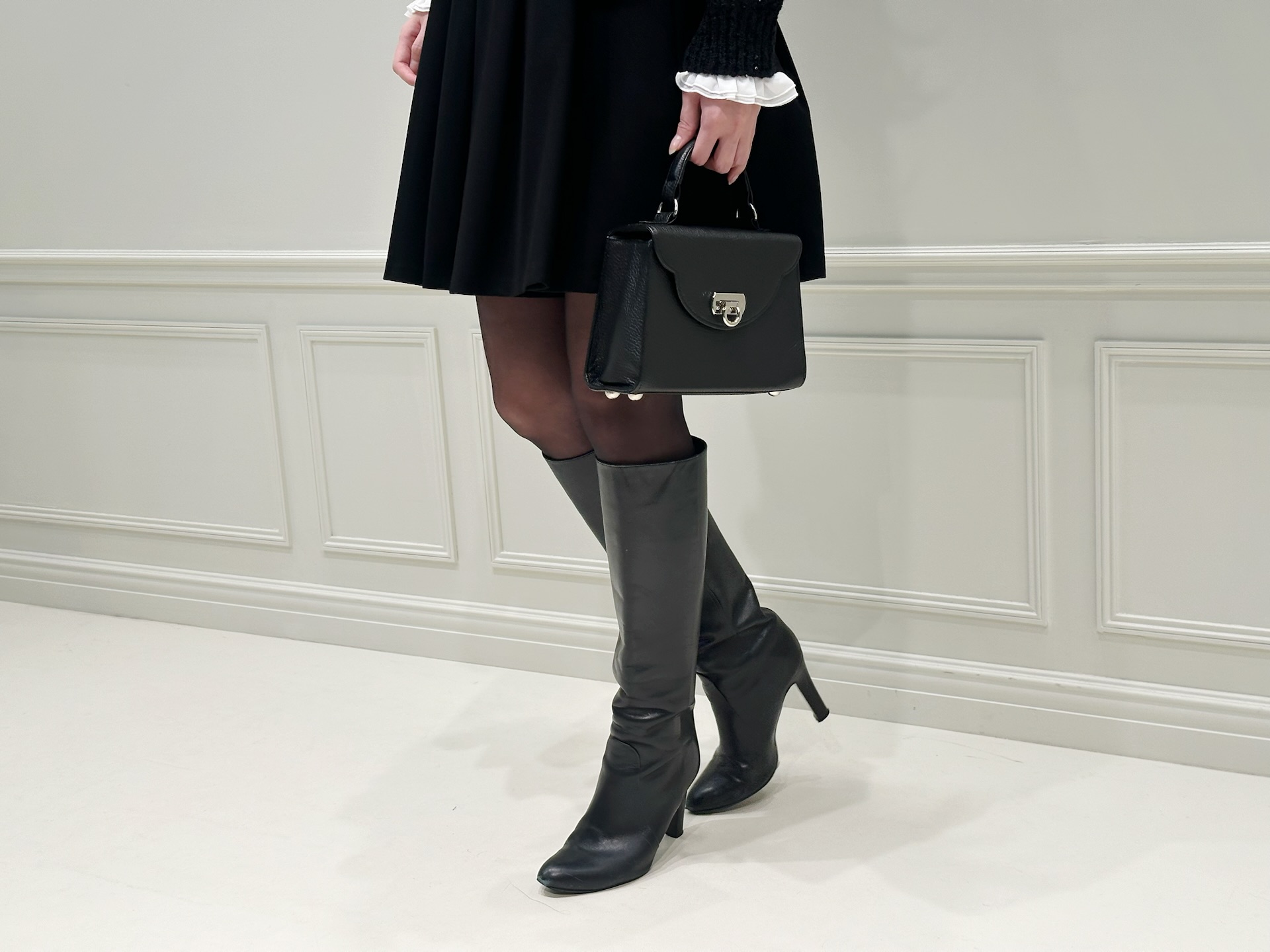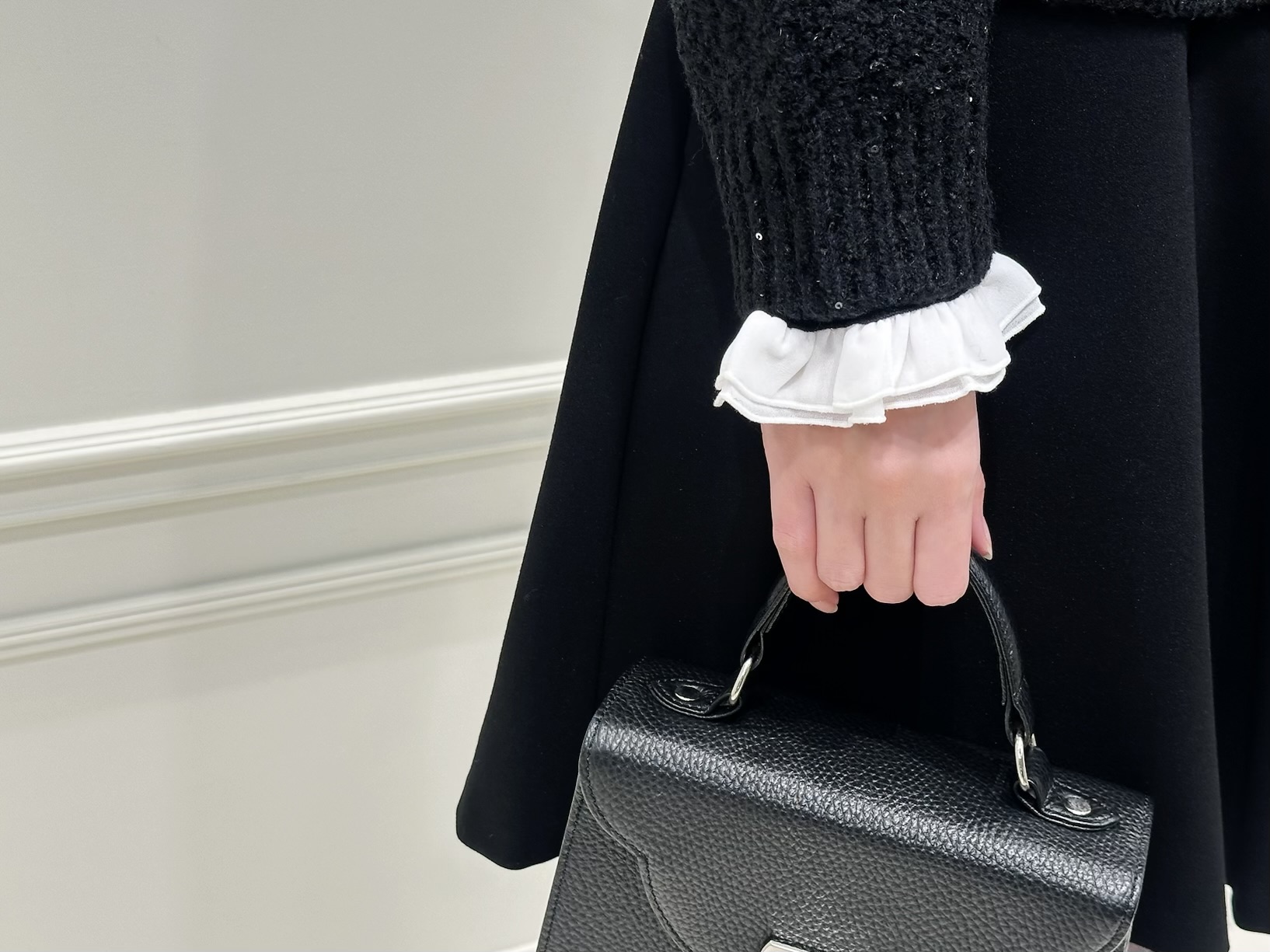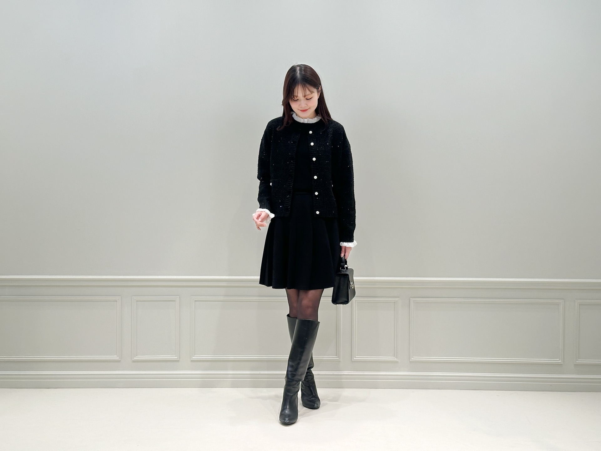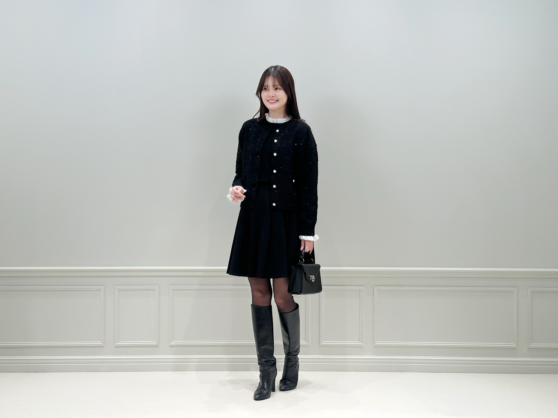 全体は黒で統一しているのに、ひとつひとつのディテールが華やかだから、落ち着きの中に“可愛い”がちゃんとあるスタイルに仕上がります。