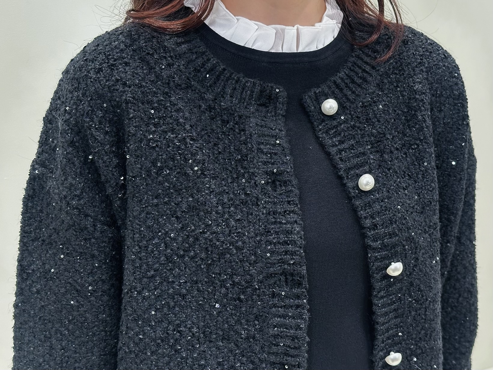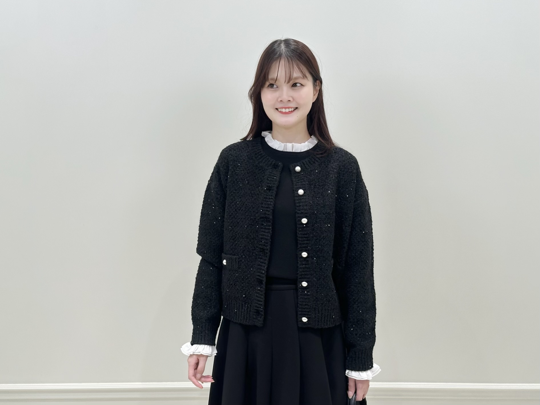 襟元と袖口からシフォンフリルが少し覗くだけで、一気に華やか。上からパールボタンとスパンコールが重なることで、黒のワントーンでも奥行きときらめきが生まれます!