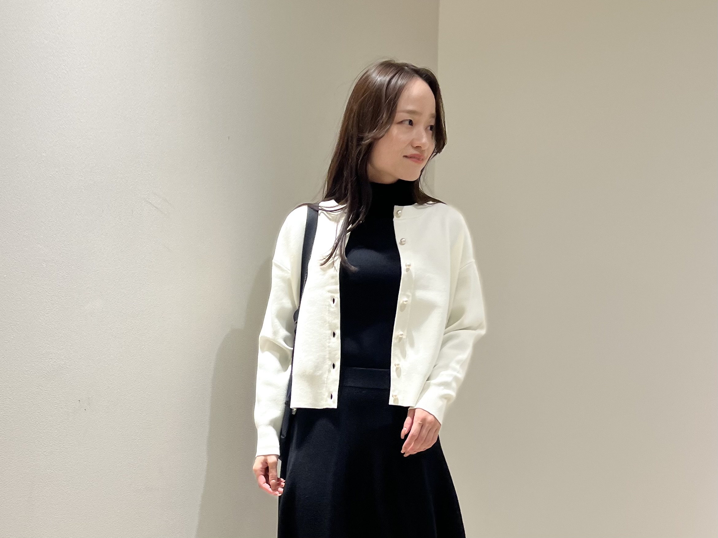 今日は、m,i,d定番のリブタートルネックと、羽織ものに厚手のニットカーディガンを合わせました。リブタートルはAVENIRETOILEのアイテムとも相性がよく、1枚あると必ず使えます。