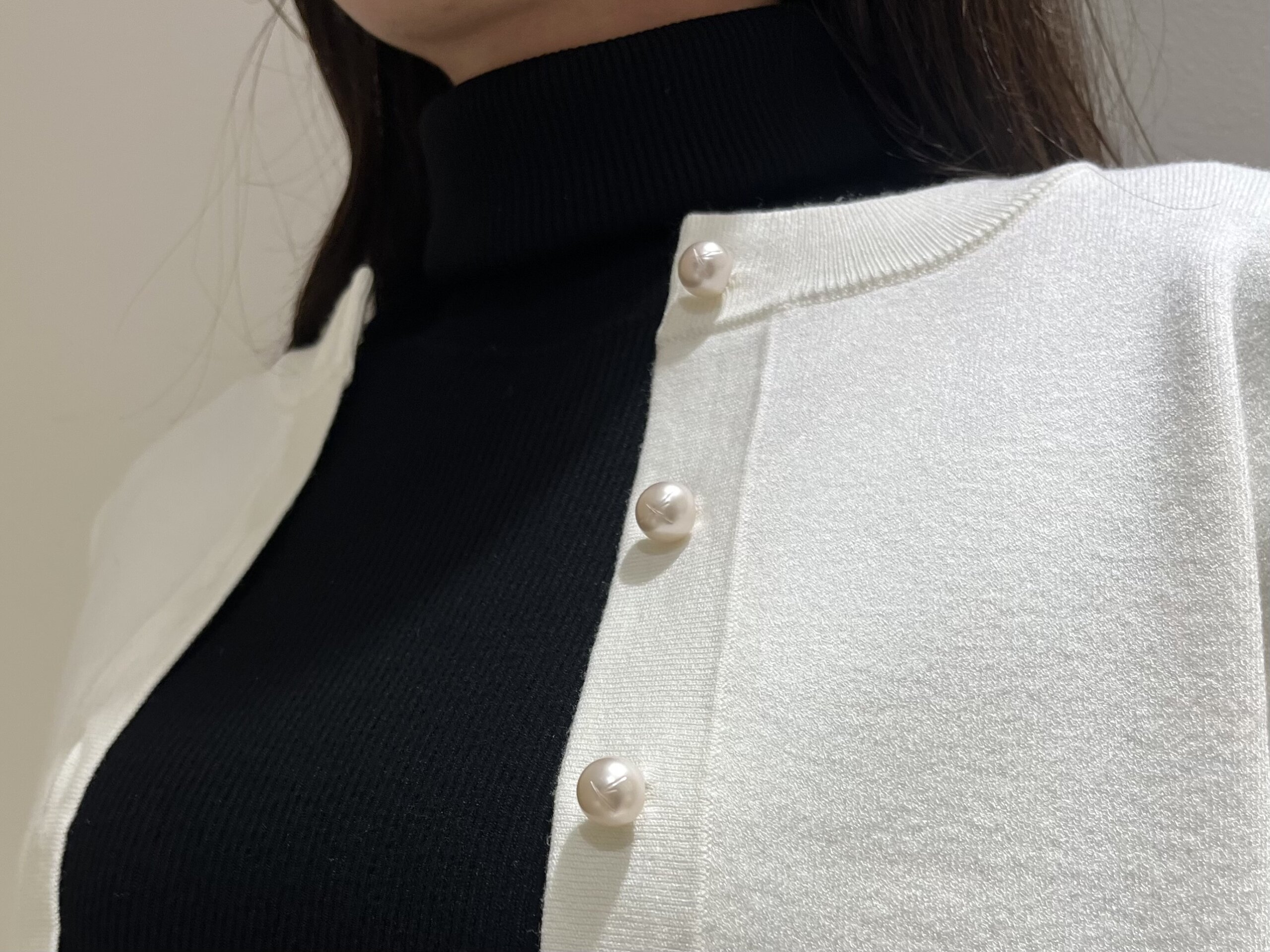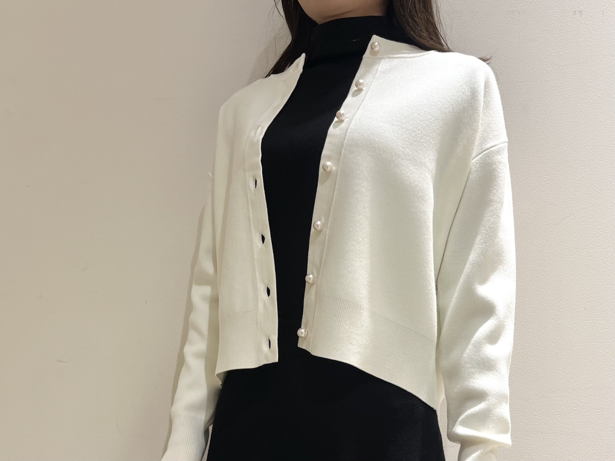 カーディガンはやや厚みがある素材で、長袖のニットと合わせて着ることで保温感がUP!程よいゆとりのある身幅なので、インナーに長袖ニットを着てももたつかないのが嬉しいポイントです。