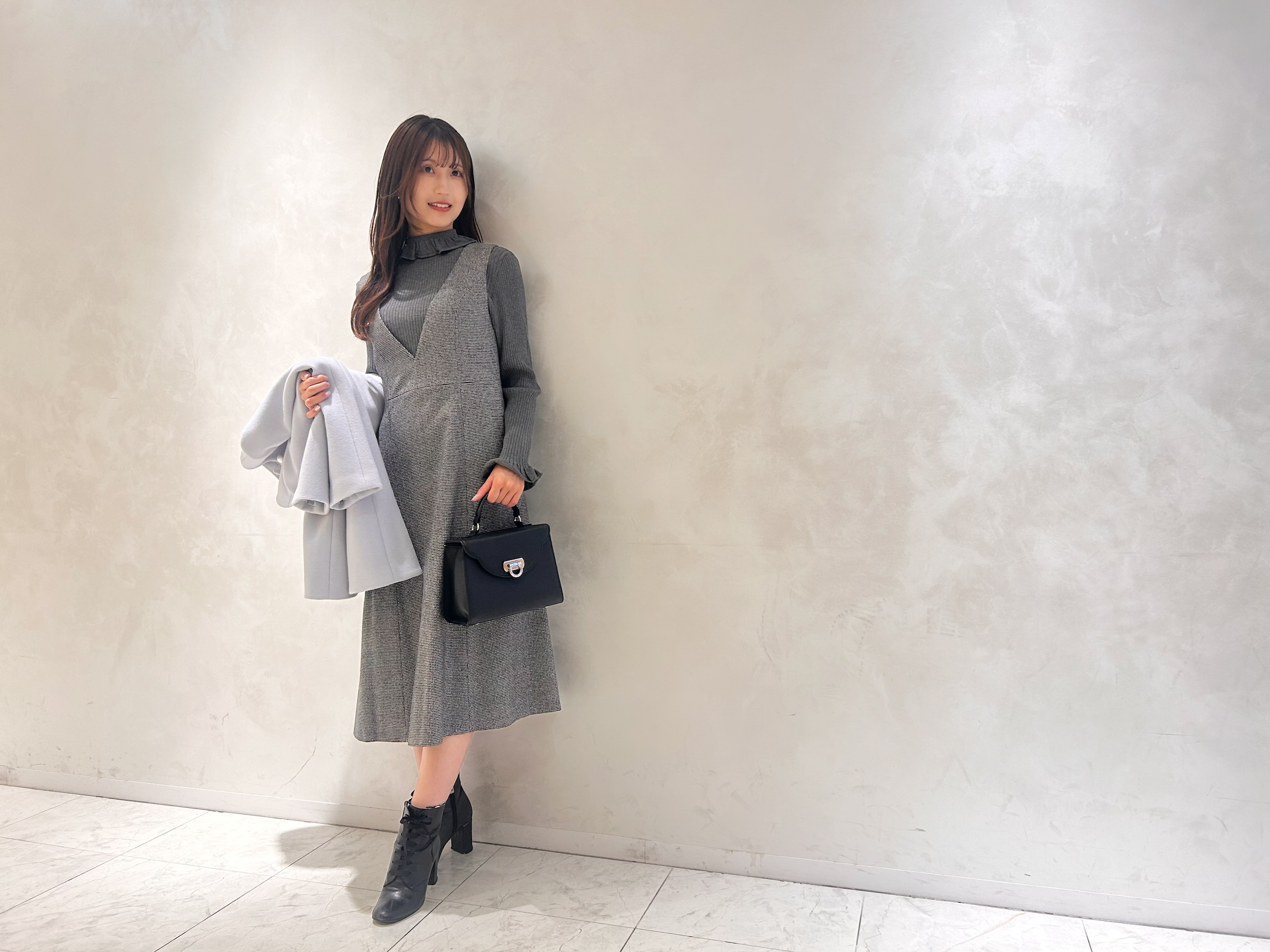 やわらかなグレーのワンピースに、明るいトーンのコートを合わせた女性らしい着こなし。