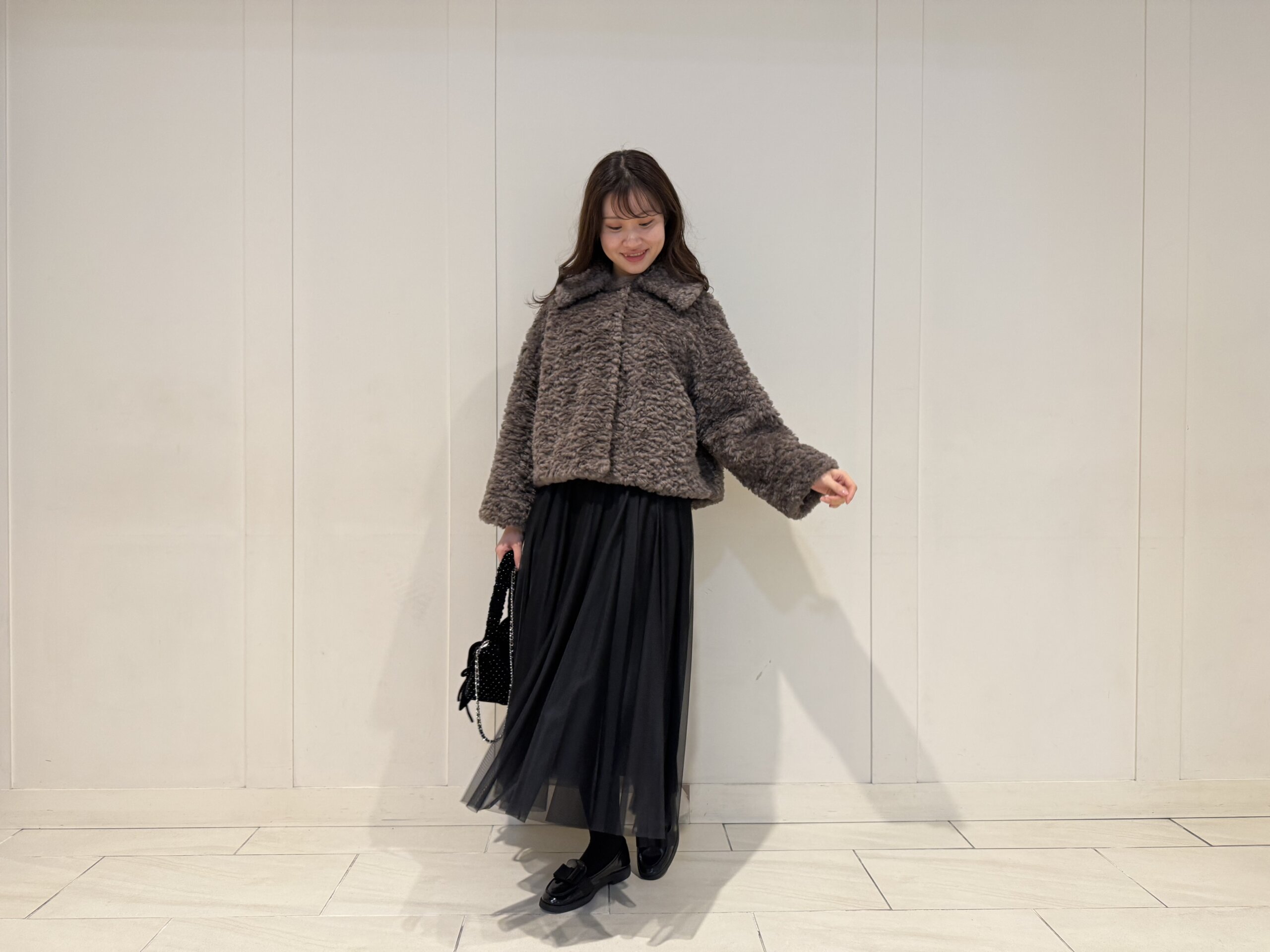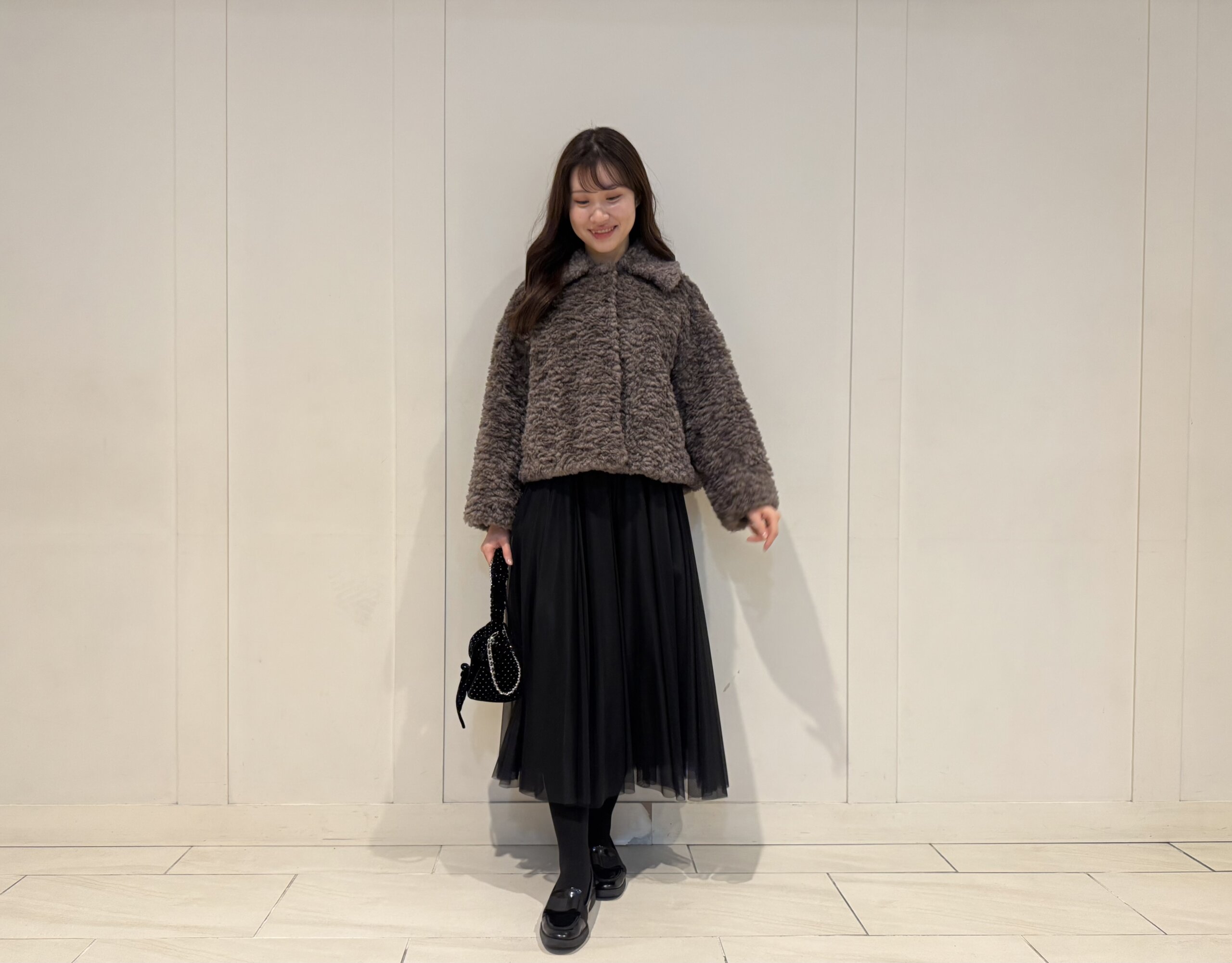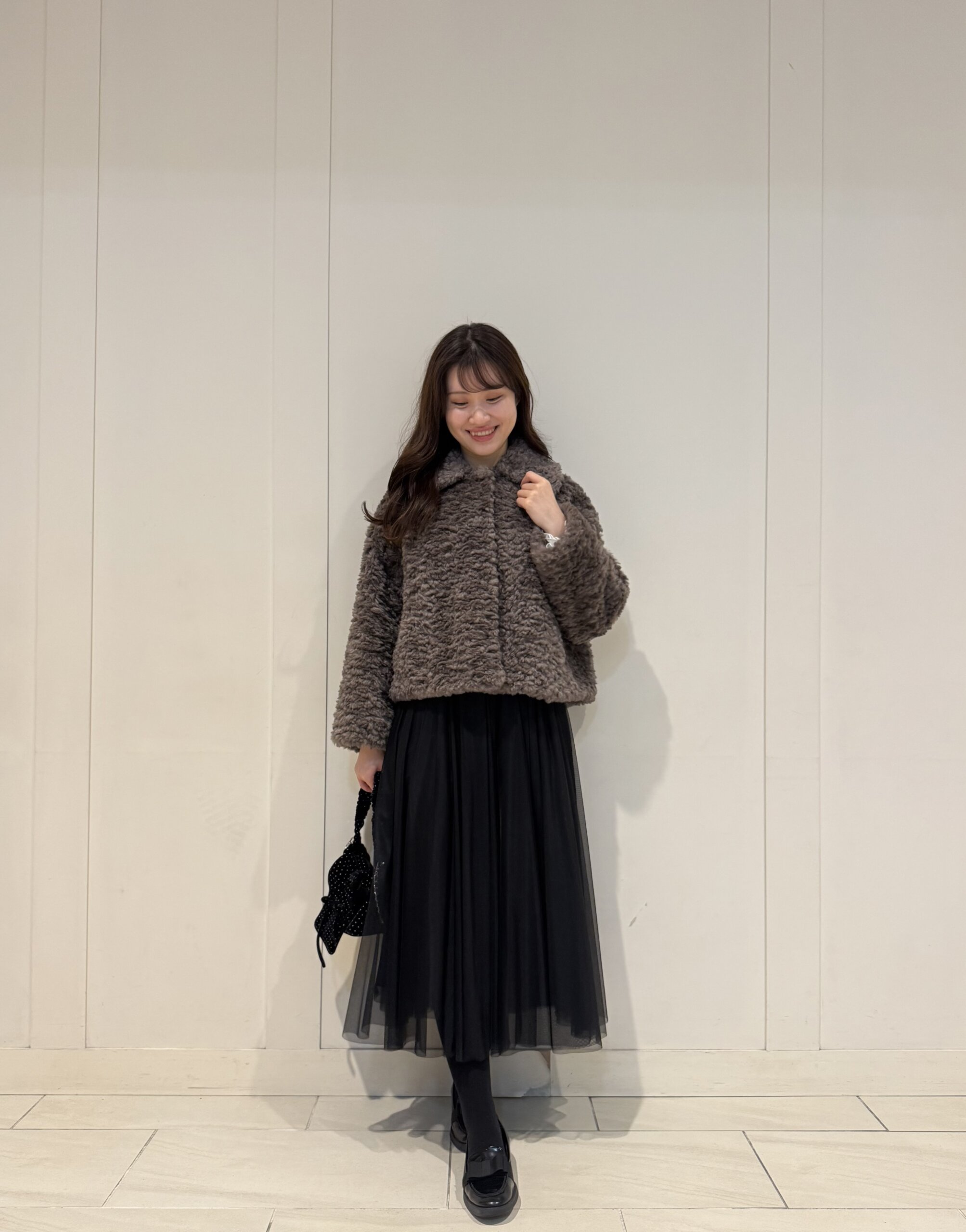 そんな本日は、ふわもこボアコートとお気に入りニット×チュールスカートを合わせた、暖かさも洒落感も兼ね備えた冬気分高まるコーディネートに。