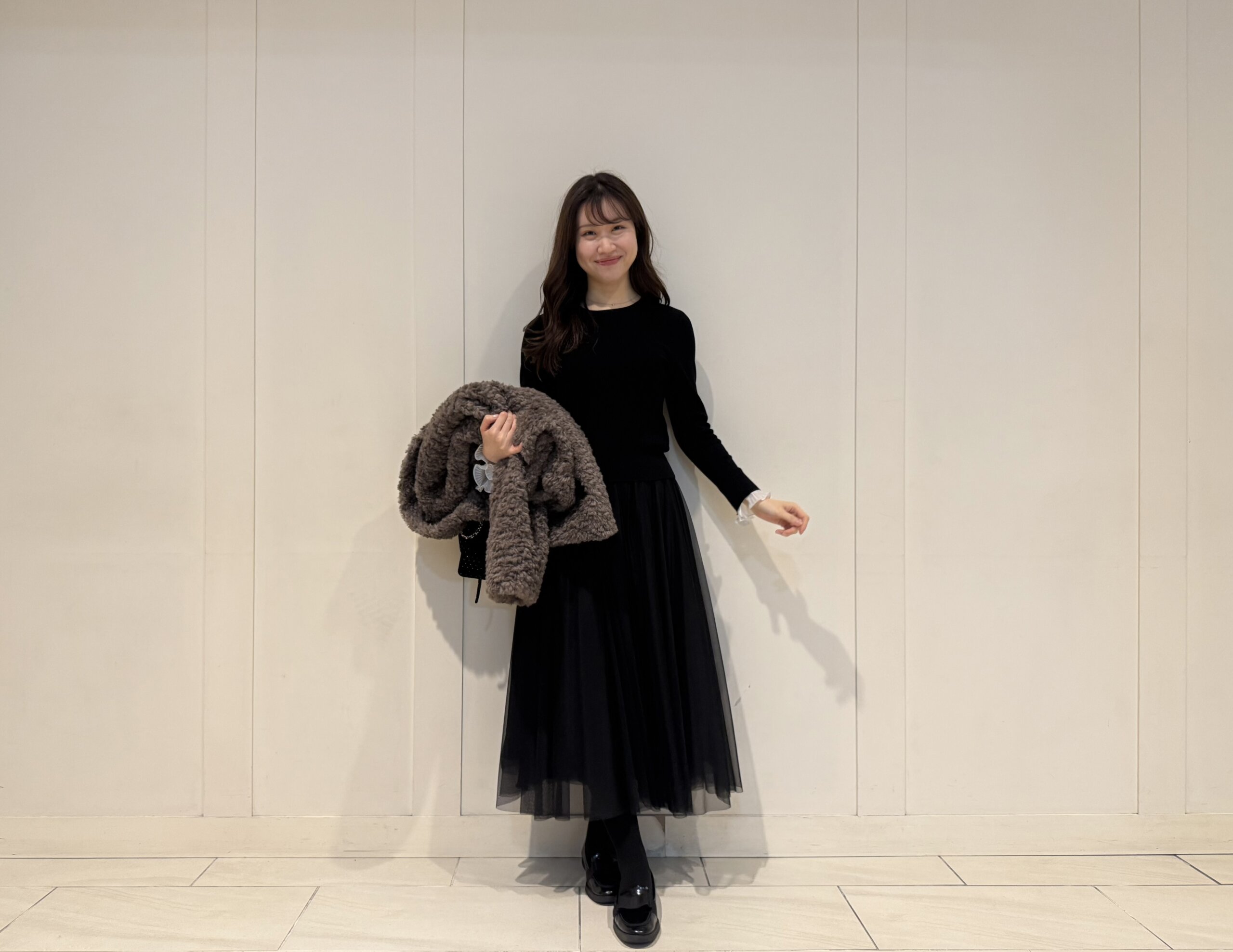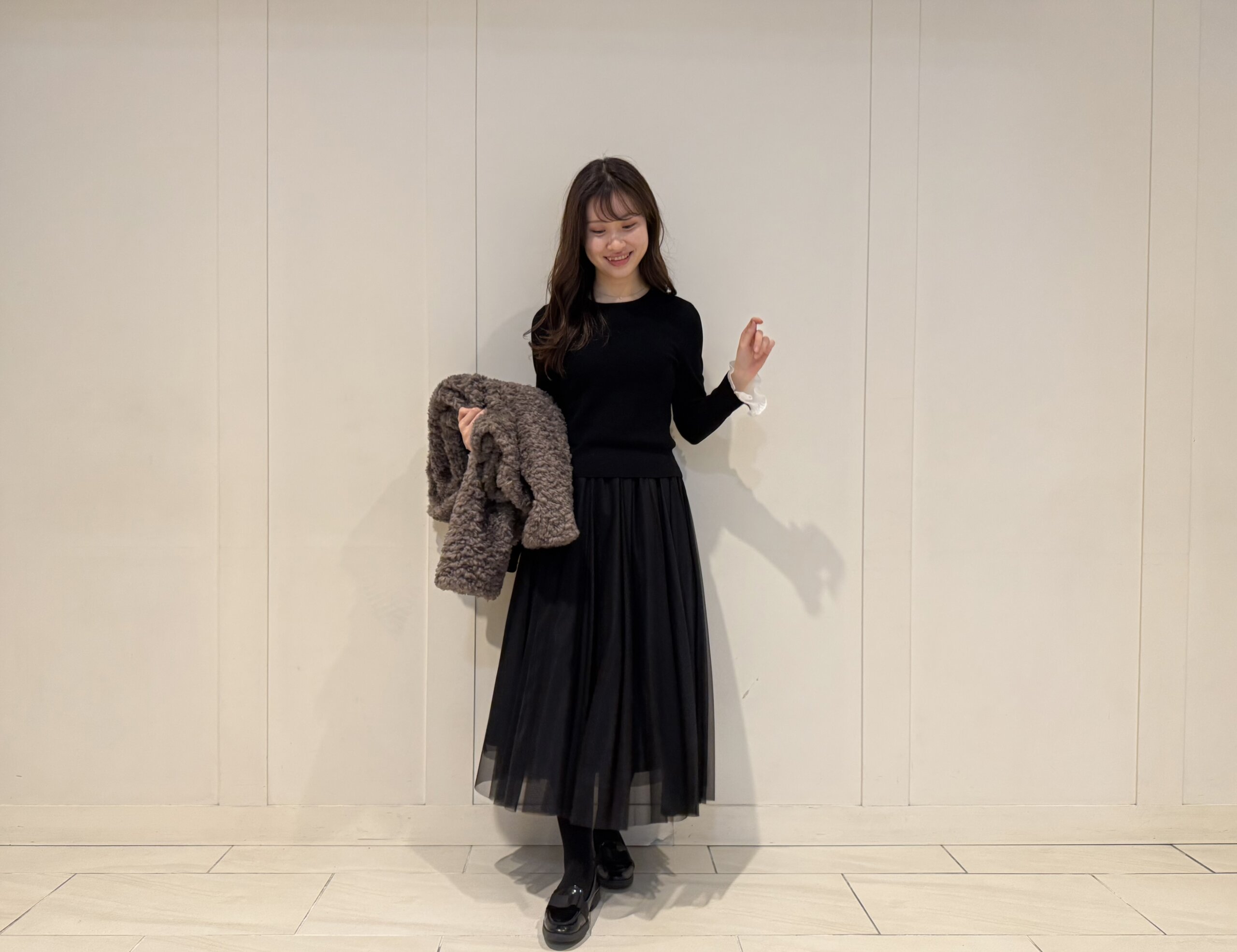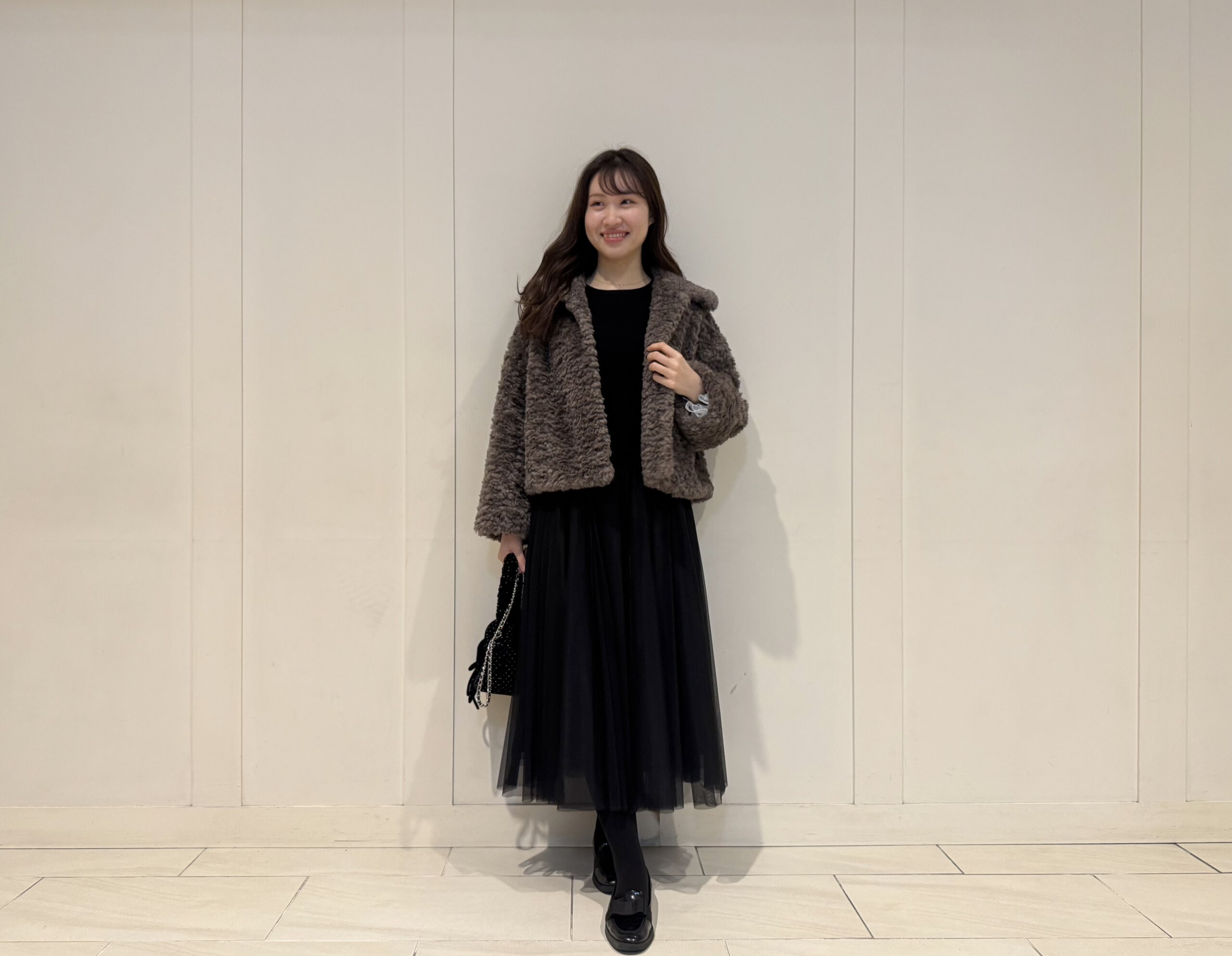 そんな本日は、ふわもこボアコートとお気に入りニット×チュールスカートを合わせた、暖かさも洒落感も兼ね備えた冬気分高まるコーディネートに。