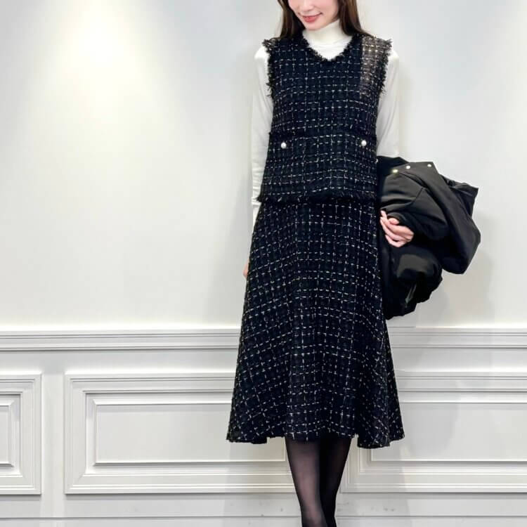 また、スカートのウエスト部分のお作りがすっきりみえるますため、シルエットもキレイめに映えます。
