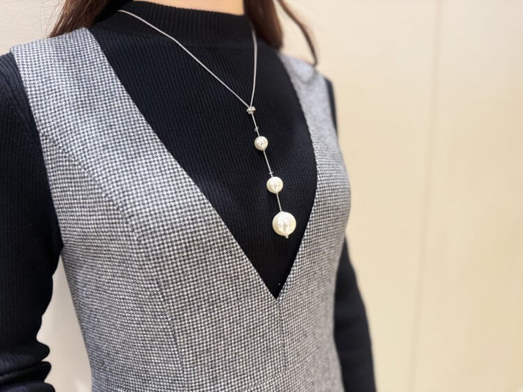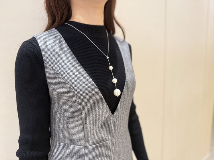 フリルやパールのアクセサリーをプラスすることで、ほんのりフェミニンで上品な着こなしが完成します。
