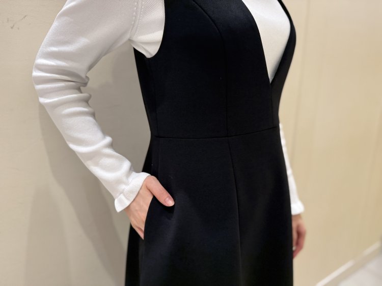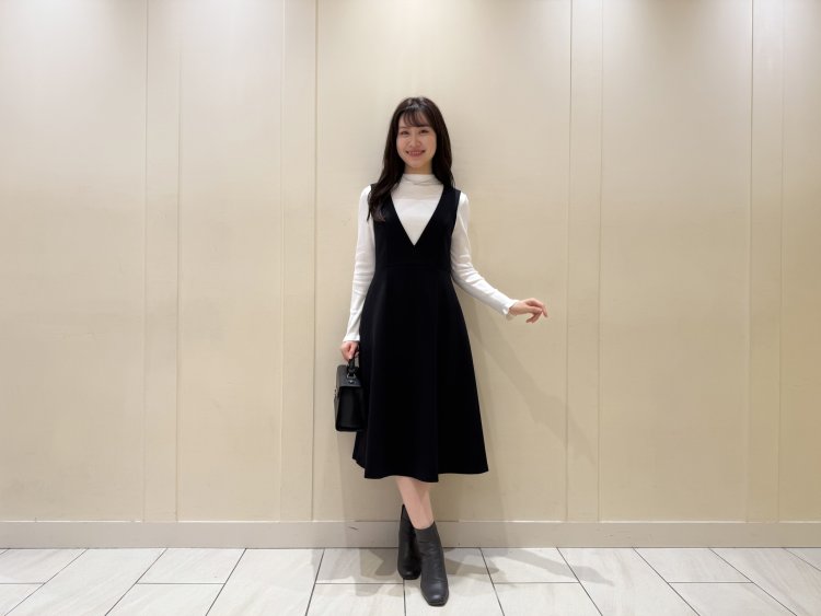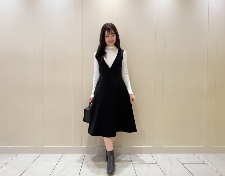 インナーには、すっきりとしたブラックのジャンパースカートを合わせて、コートのふんわり感を引き立てたスタイリングに。