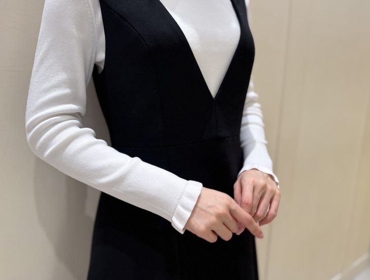 深めのVネックがフェイスラインをすっきりと魅せてくれる効果も◎。ホワイトのインナーをレイヤードすることでコントラストが生まれ、より上品で洗練された印象を叶えてくれます。