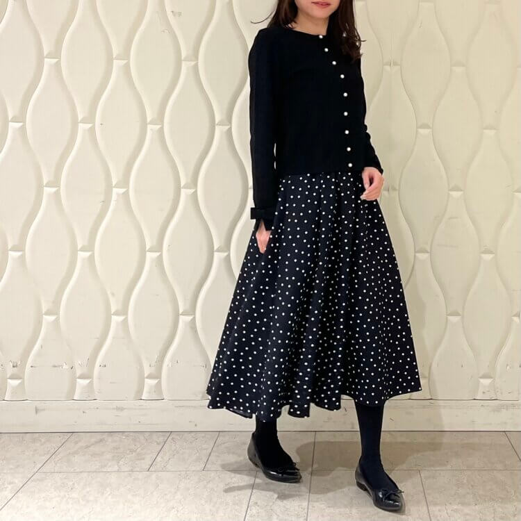 どちらもシンプルなデザインですが、ニットのフリルとスカートのタックそれぞれのデザインが引き立つ組み合わせになります。