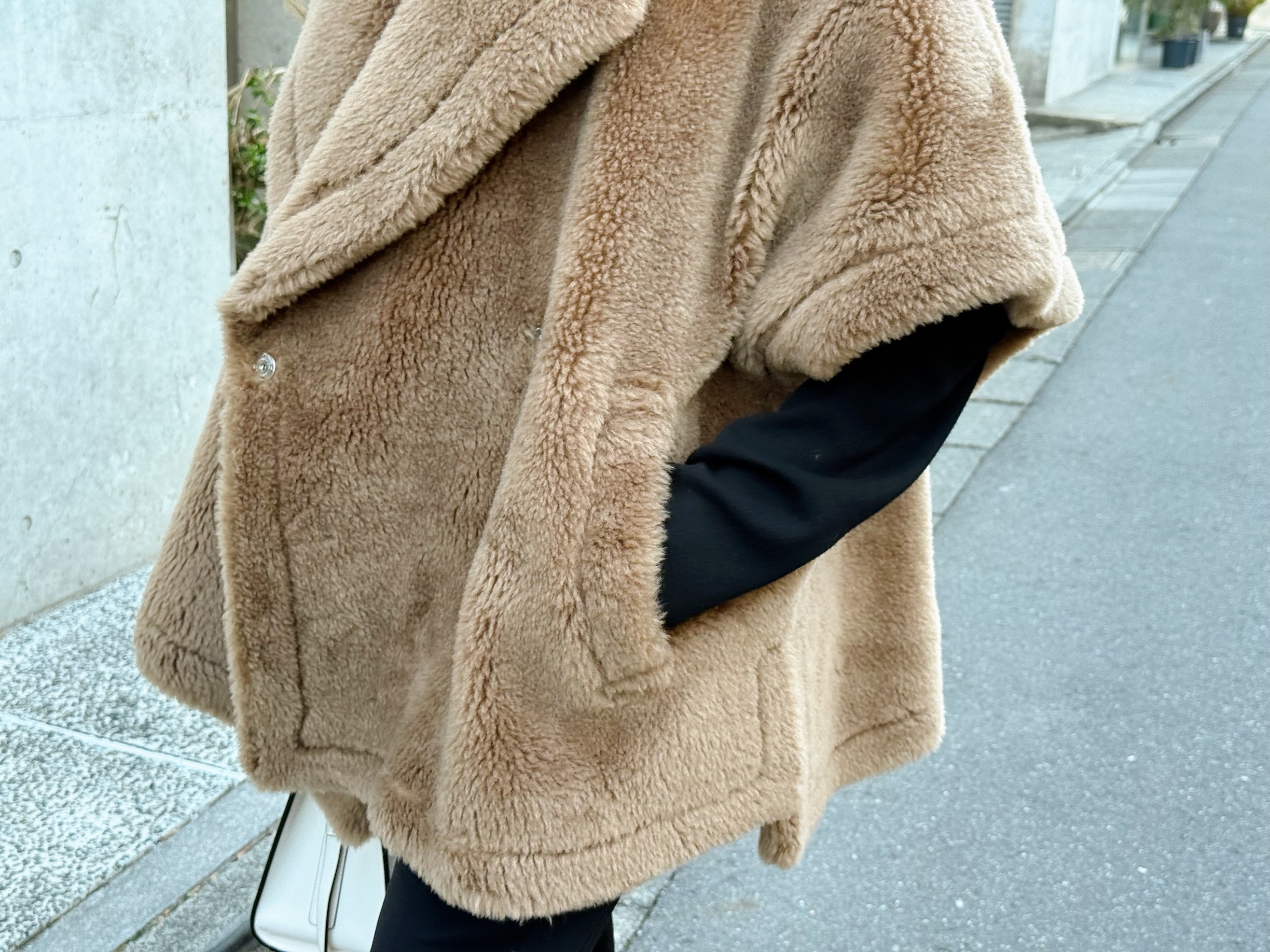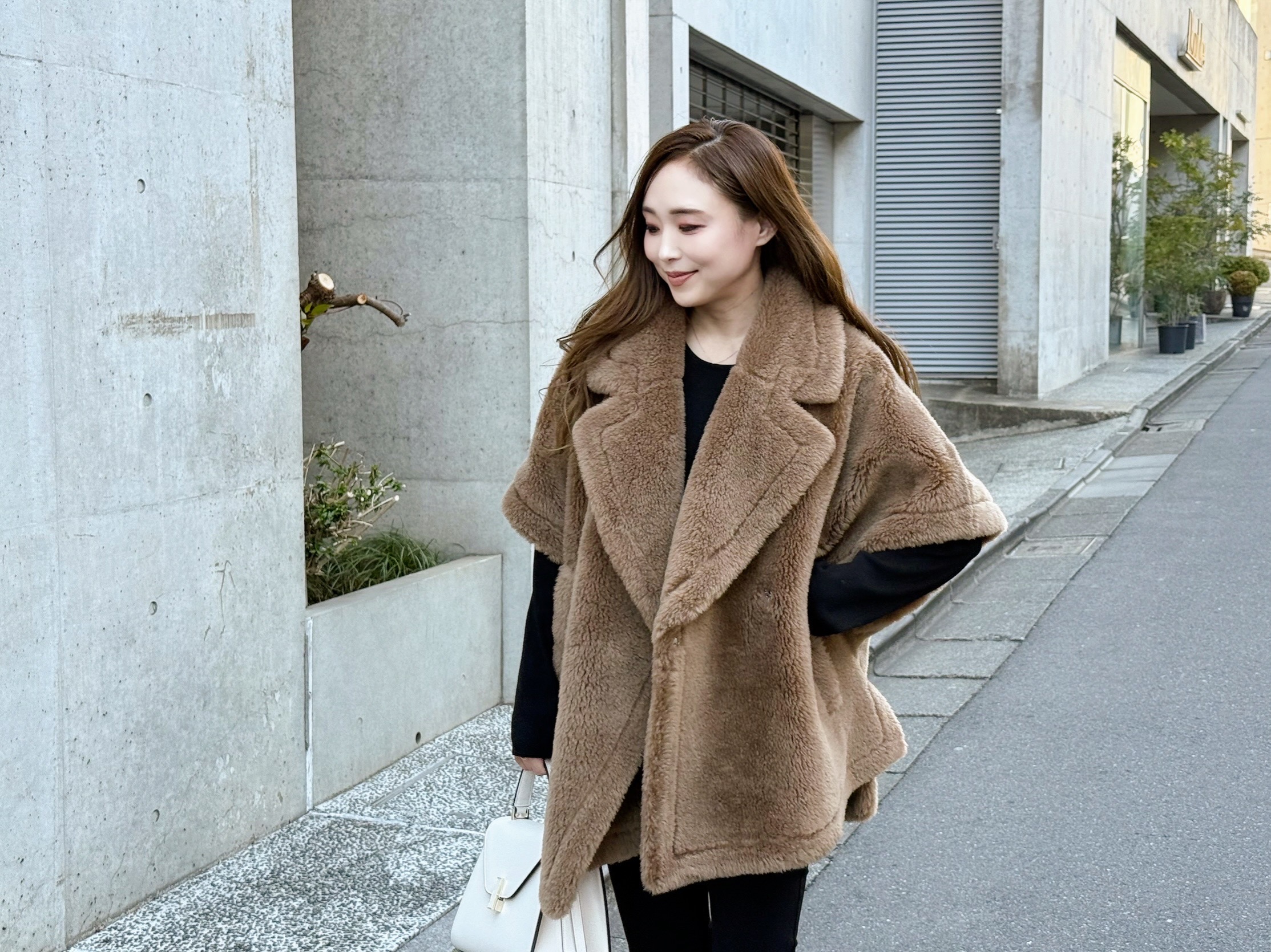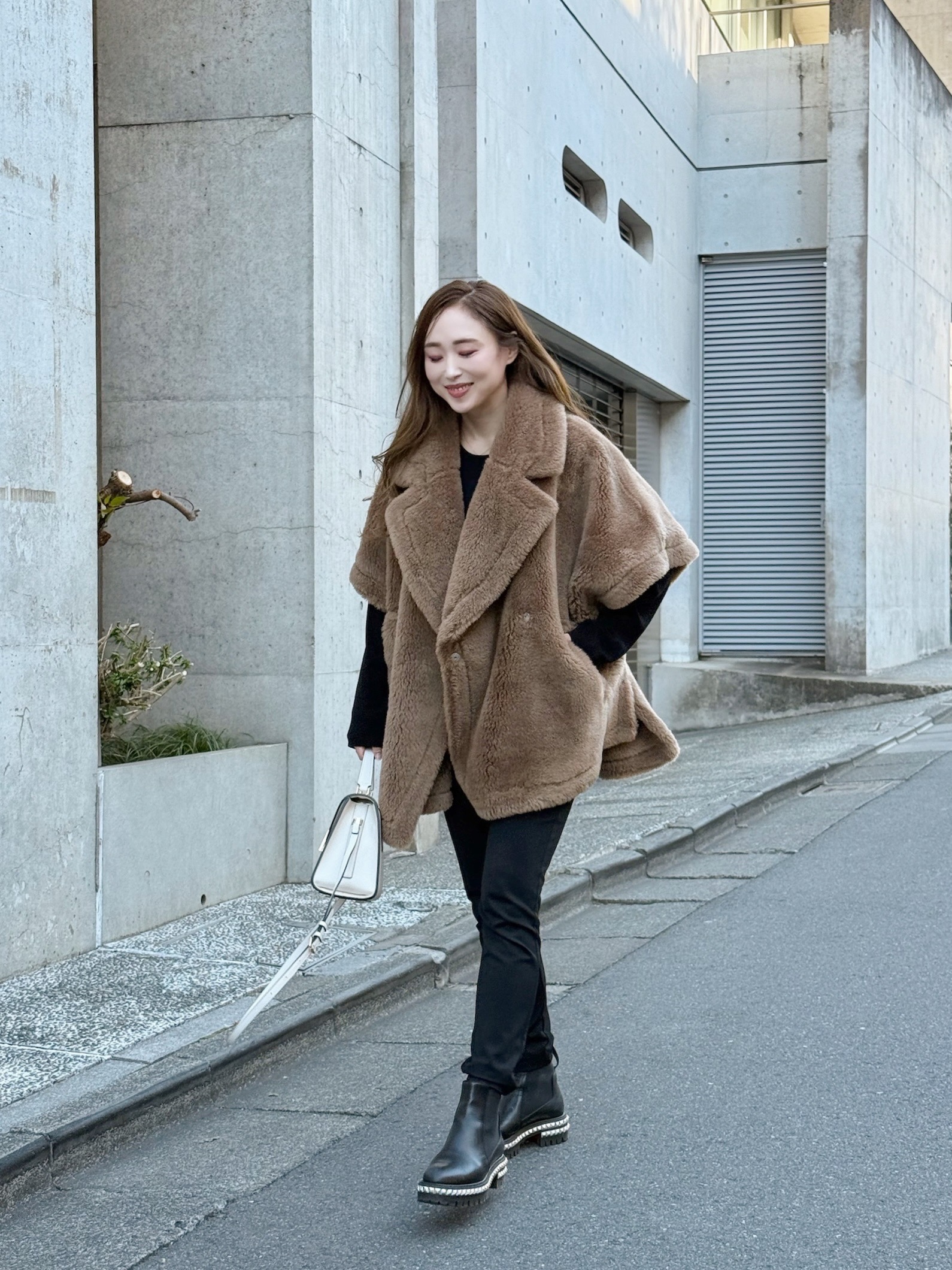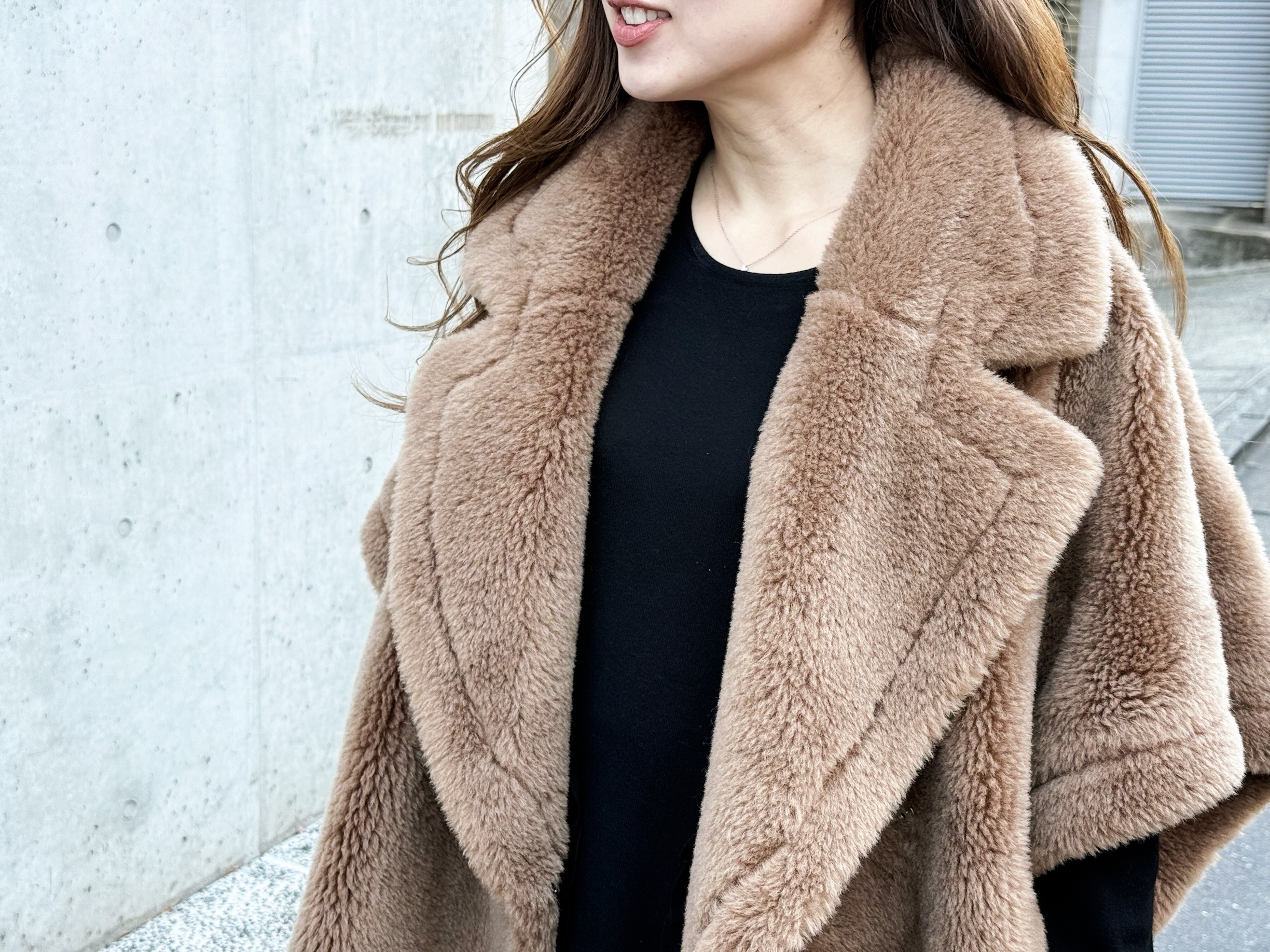 また、キャメルのモコモコアウターを際立たせるのに、上下ともにブラックでまとめています。ちょっと派手めなアウターも、しっかりと主役になるように引き算・引き算でスタイリングすれば落ち着きのある印象にまとまります。
