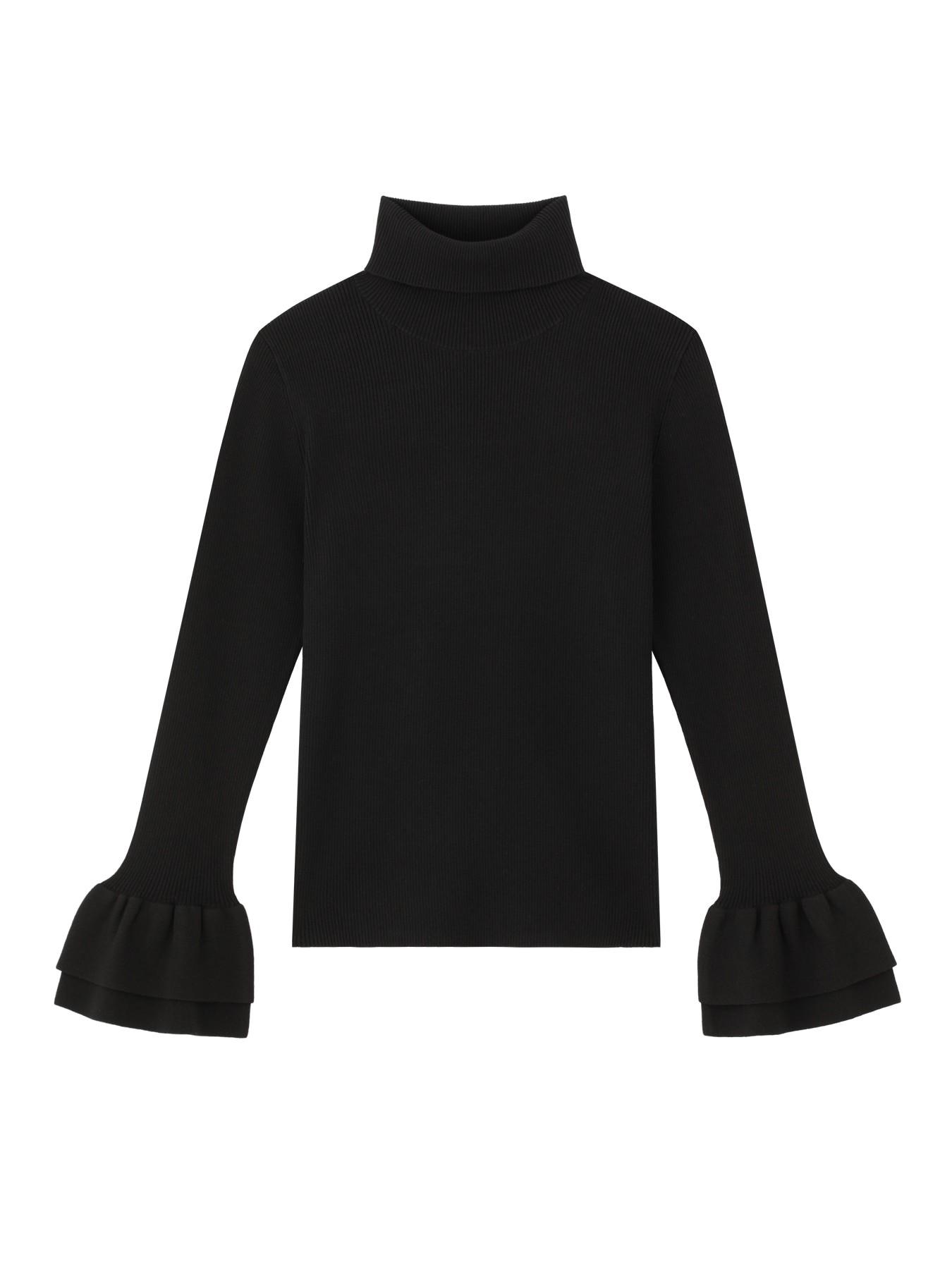女性らしさをぐっと引き立てる、ティアードカフのフリルデザインが魅力のタートルネックリブニット