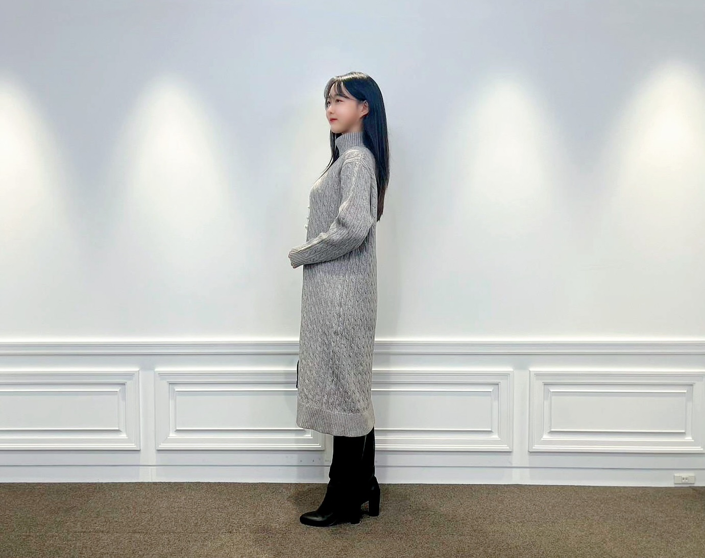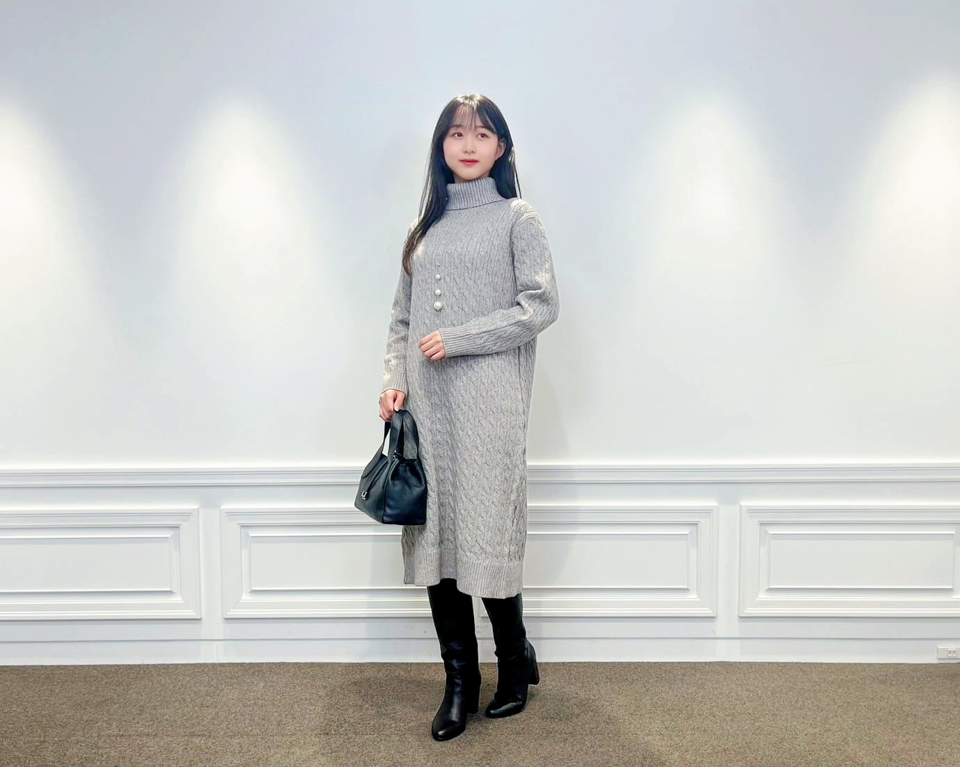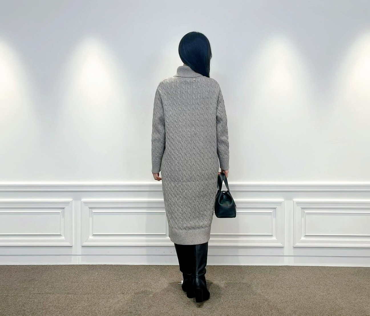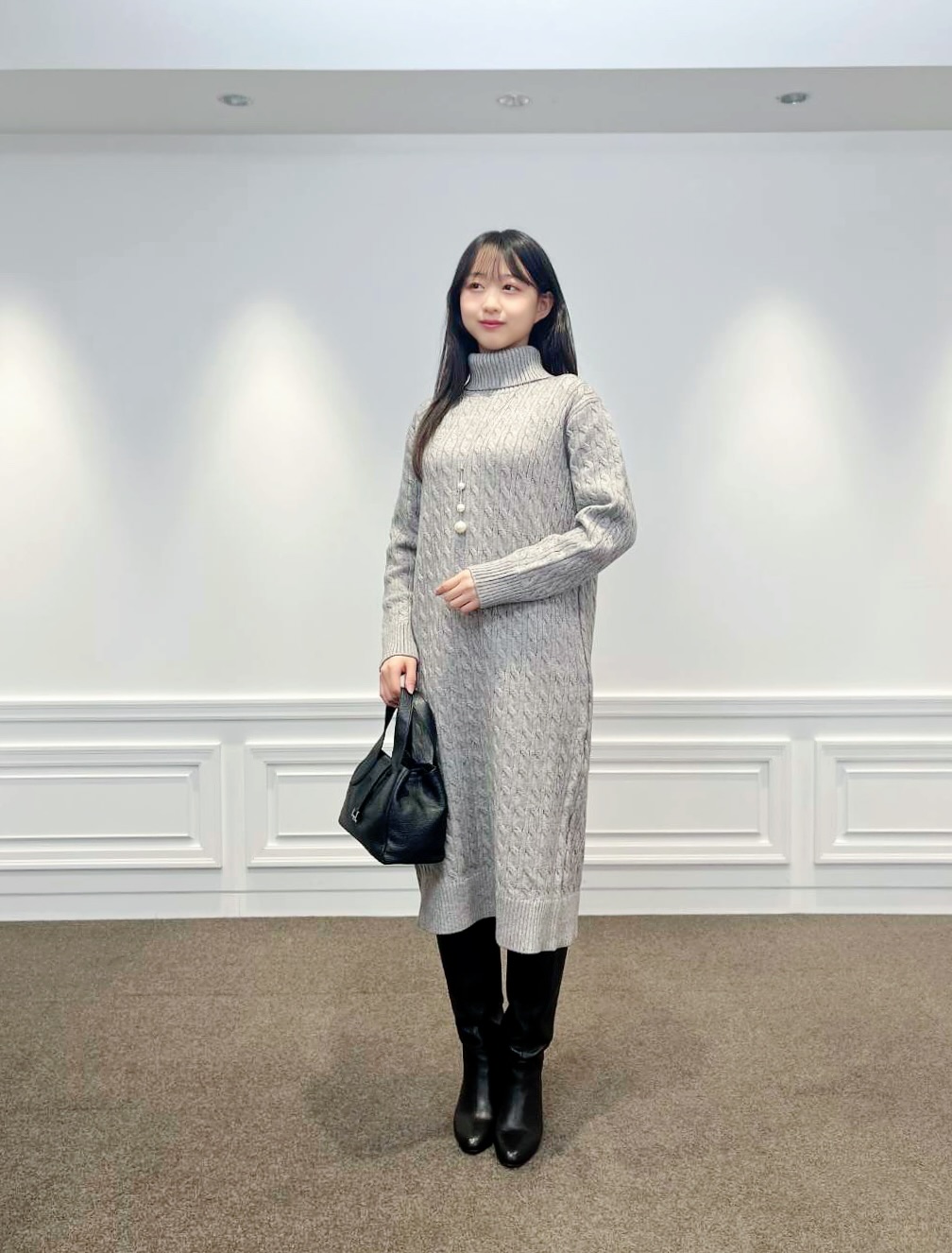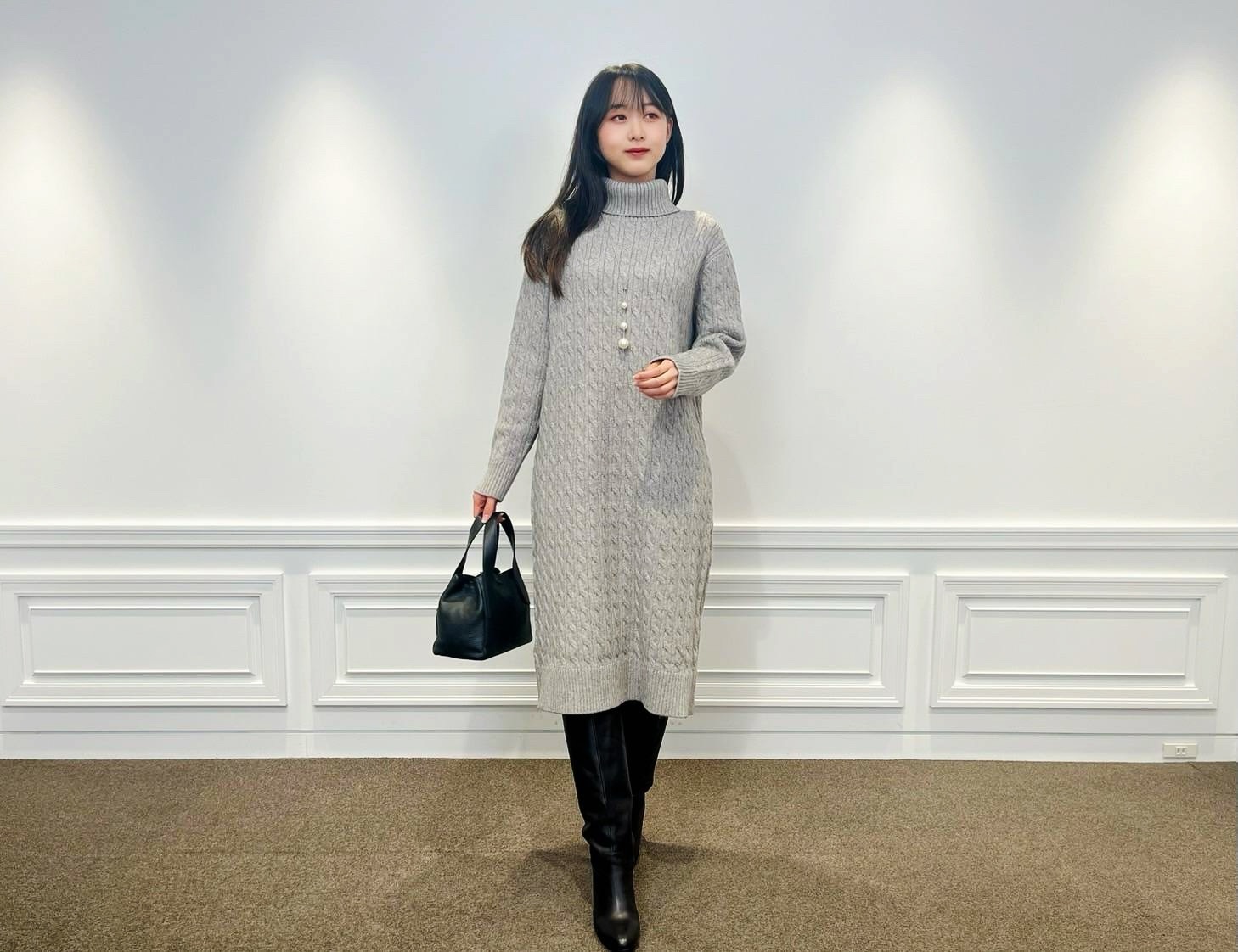 冬の休日にぴったりな、リラックス感と上品さを兼ね備えたニットコーデをご紹介します。ケーブル編みの表情豊かなワンピースに、今季トレンドのロングブーツを合わせて、