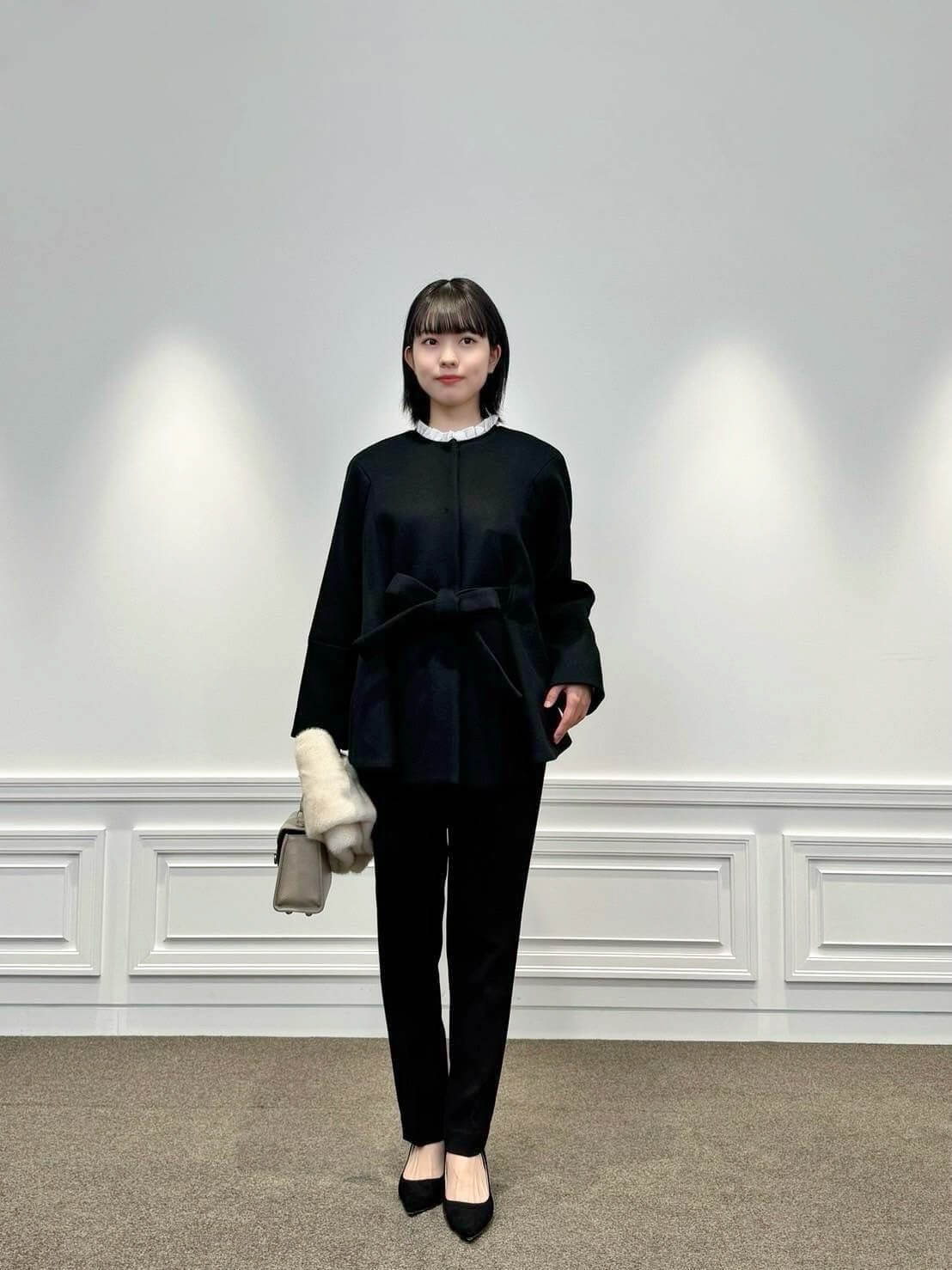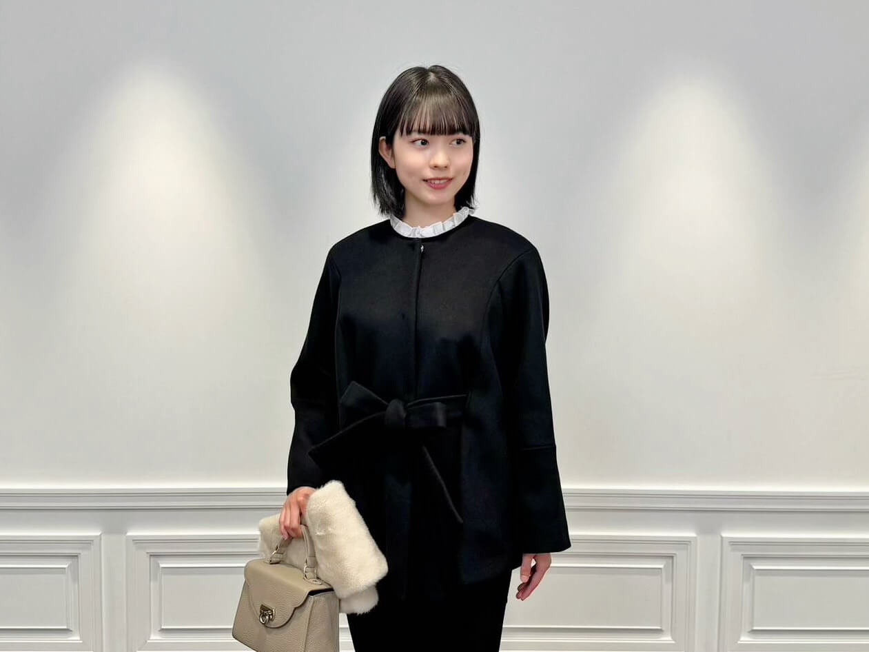 トップスは、共布のリボンがポイントになった上質なショートコート。