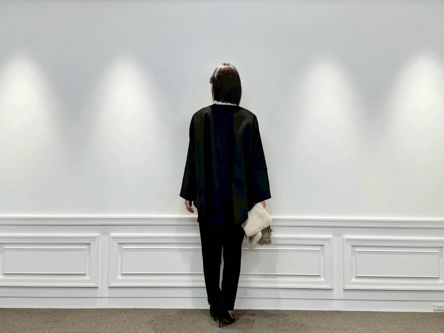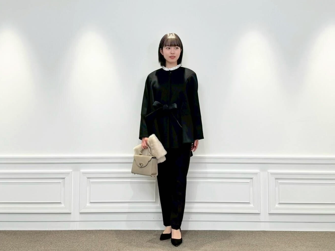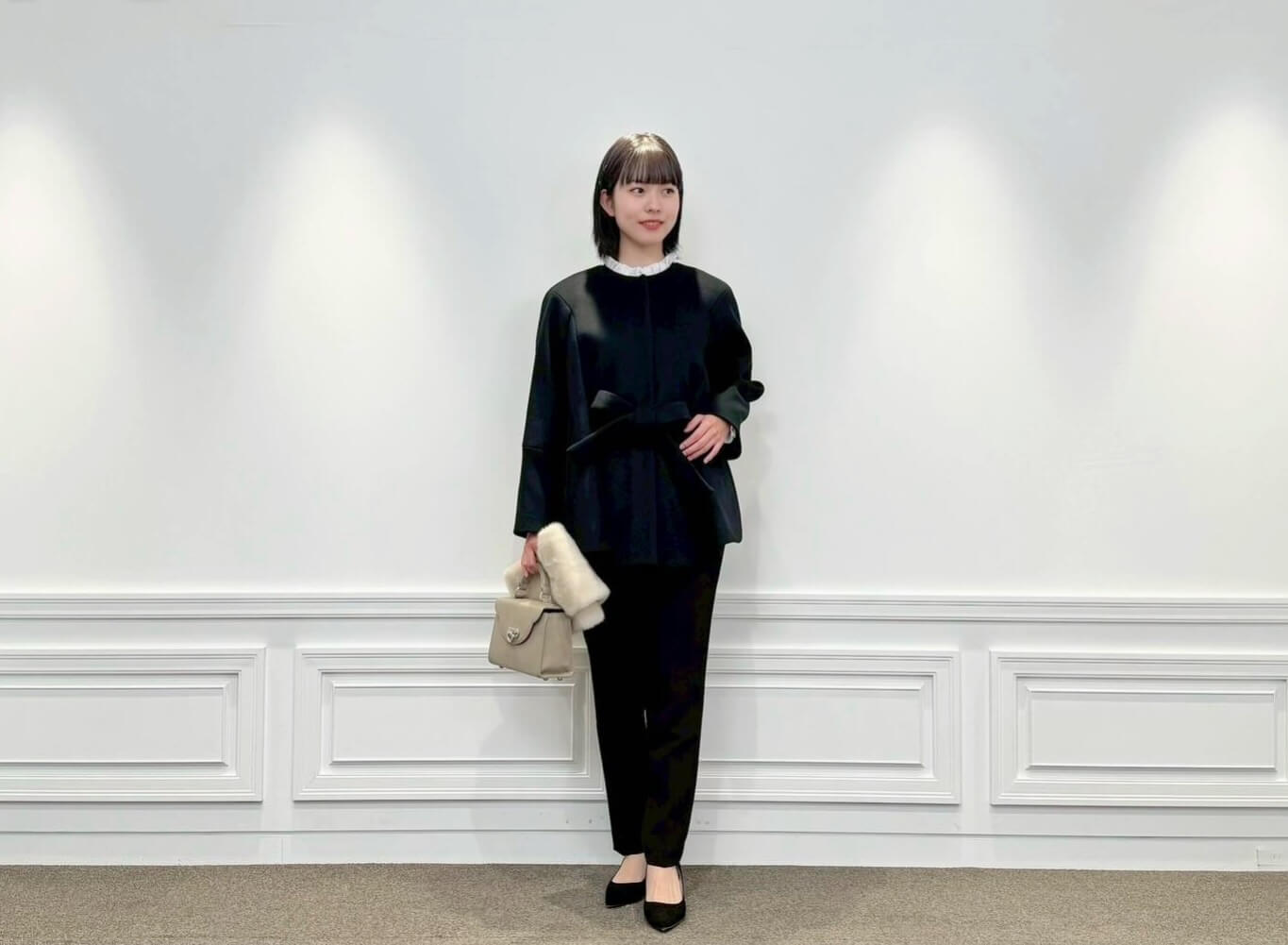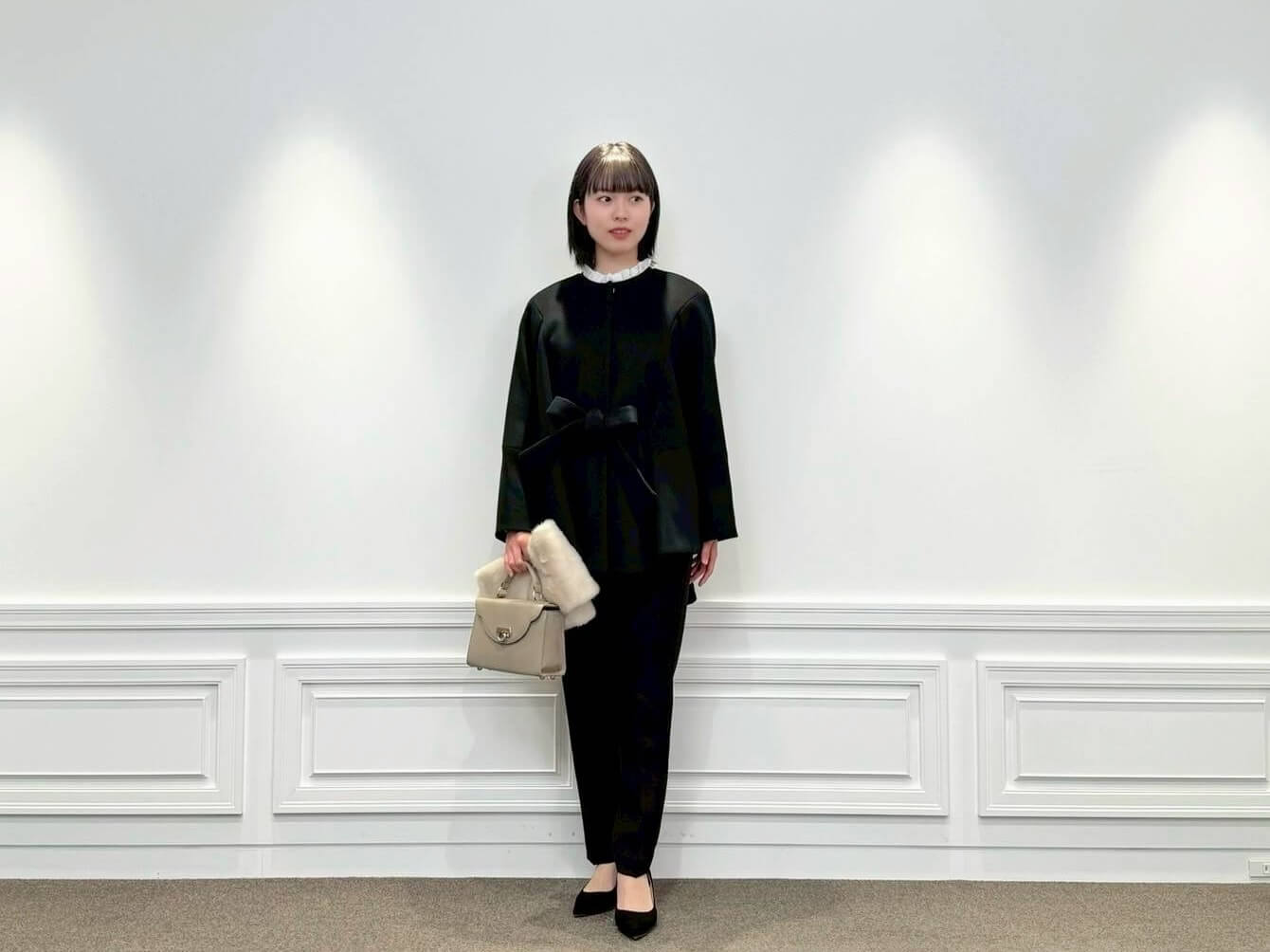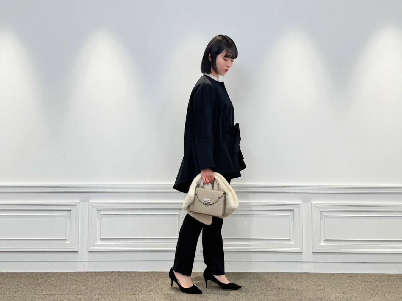 バッグとファー小物は淡いベージュを選び、全体のトーンをやわらかくまとめました。