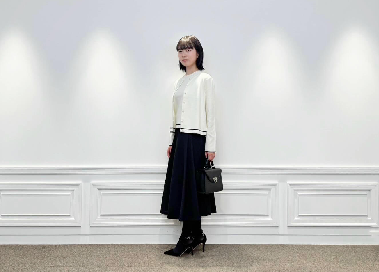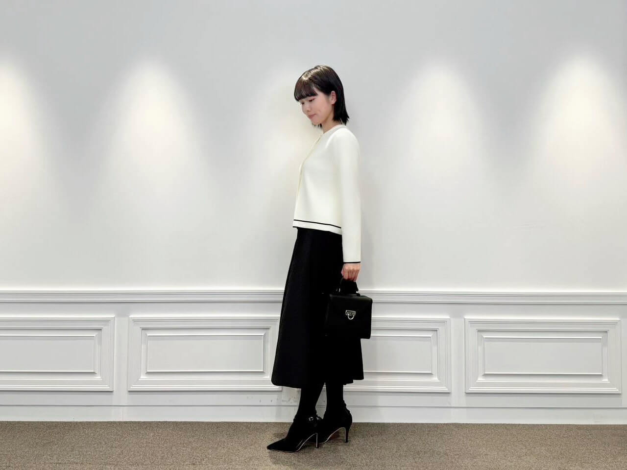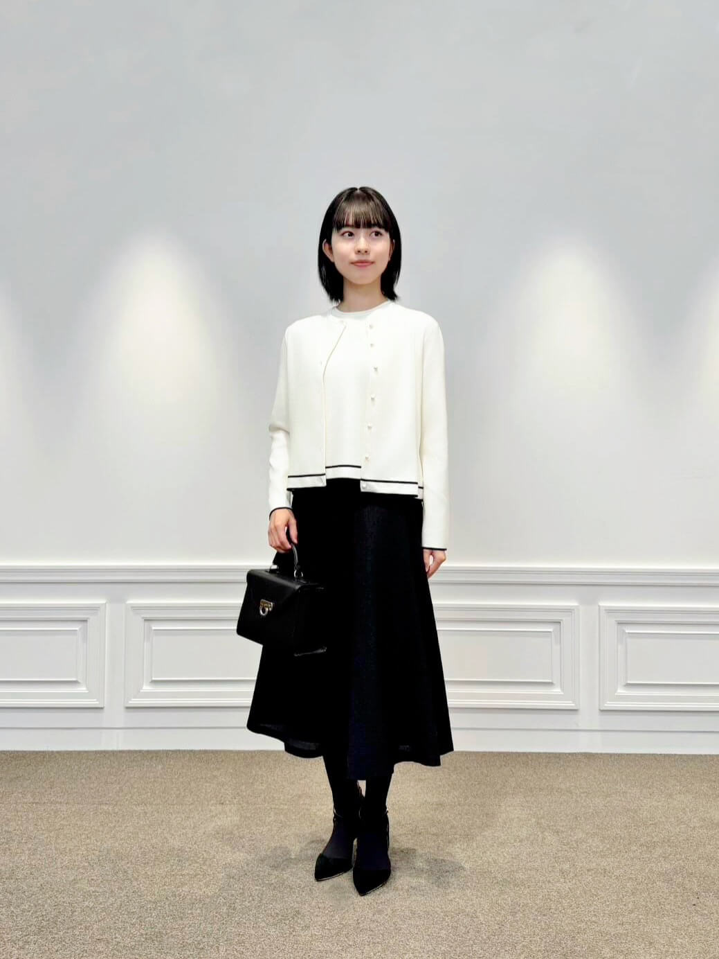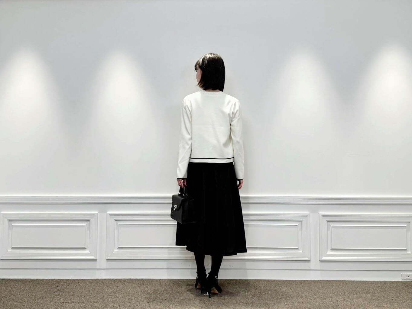 上品なパールボタンが並ぶニットアンサンブルに、軽やかなオーガンジージャガードスカートを合わせ、食事やお出かけなど、少し特別なシーンにも映える華やかさを演出しました。ホワイト×ブラックのコントラストが、シンプルながらも洗練された印象を与えてくれる一着です。