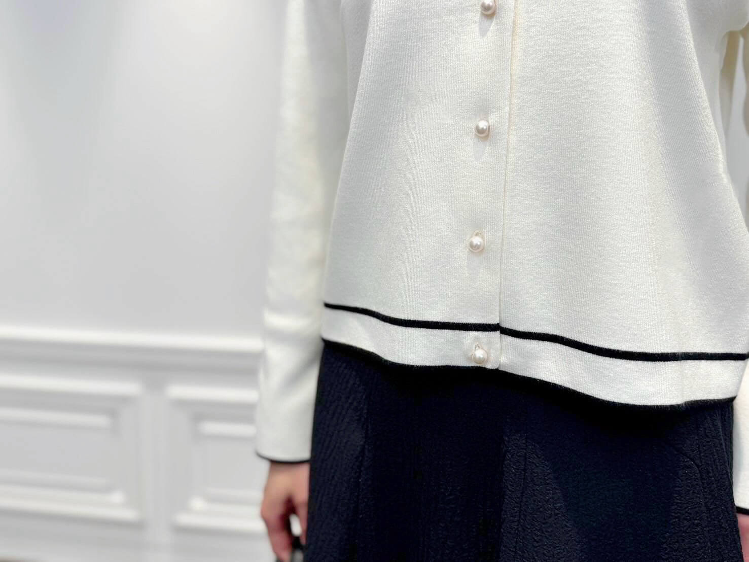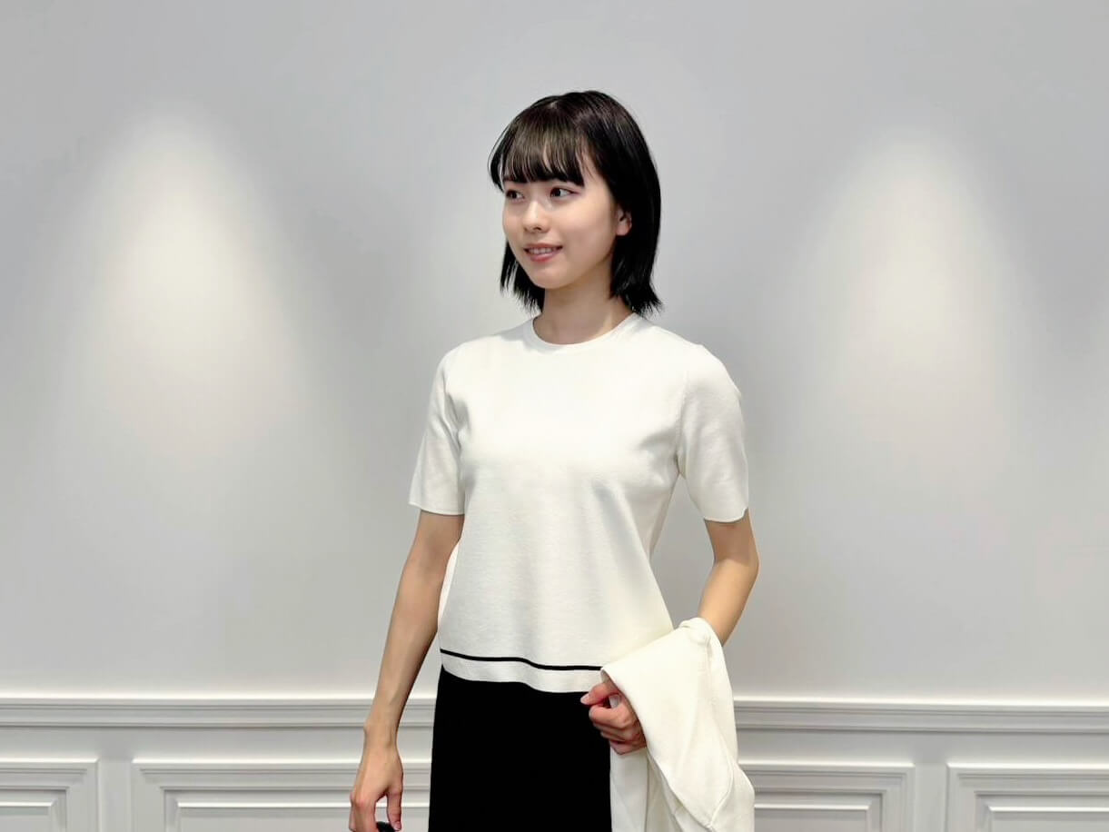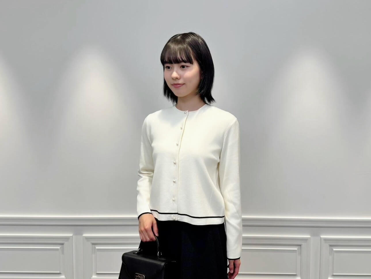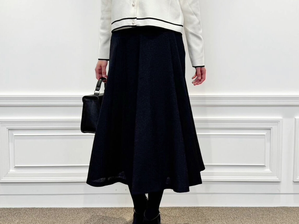 上品なパールボタンが並ぶニットアンサンブルに、軽やかなオーガンジージャガードスカートを合わせ、食事やお出かけなど、少し特別なシーンにも映える華やかさを演出しました。ホワイト×ブラックのコントラストが、シンプルながらも洗練された印象を与えてくれる一着です。