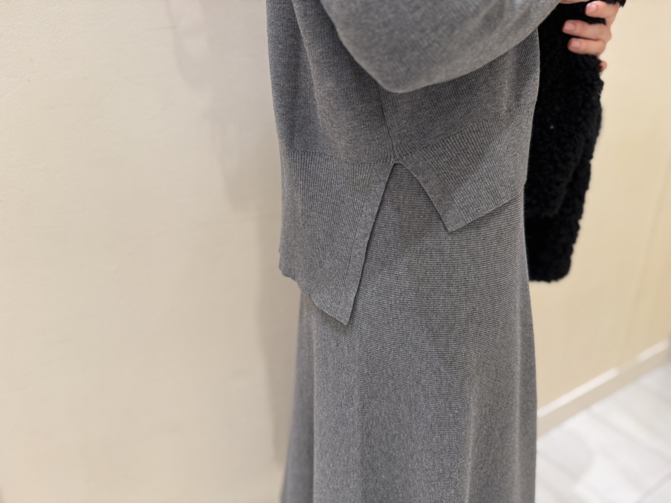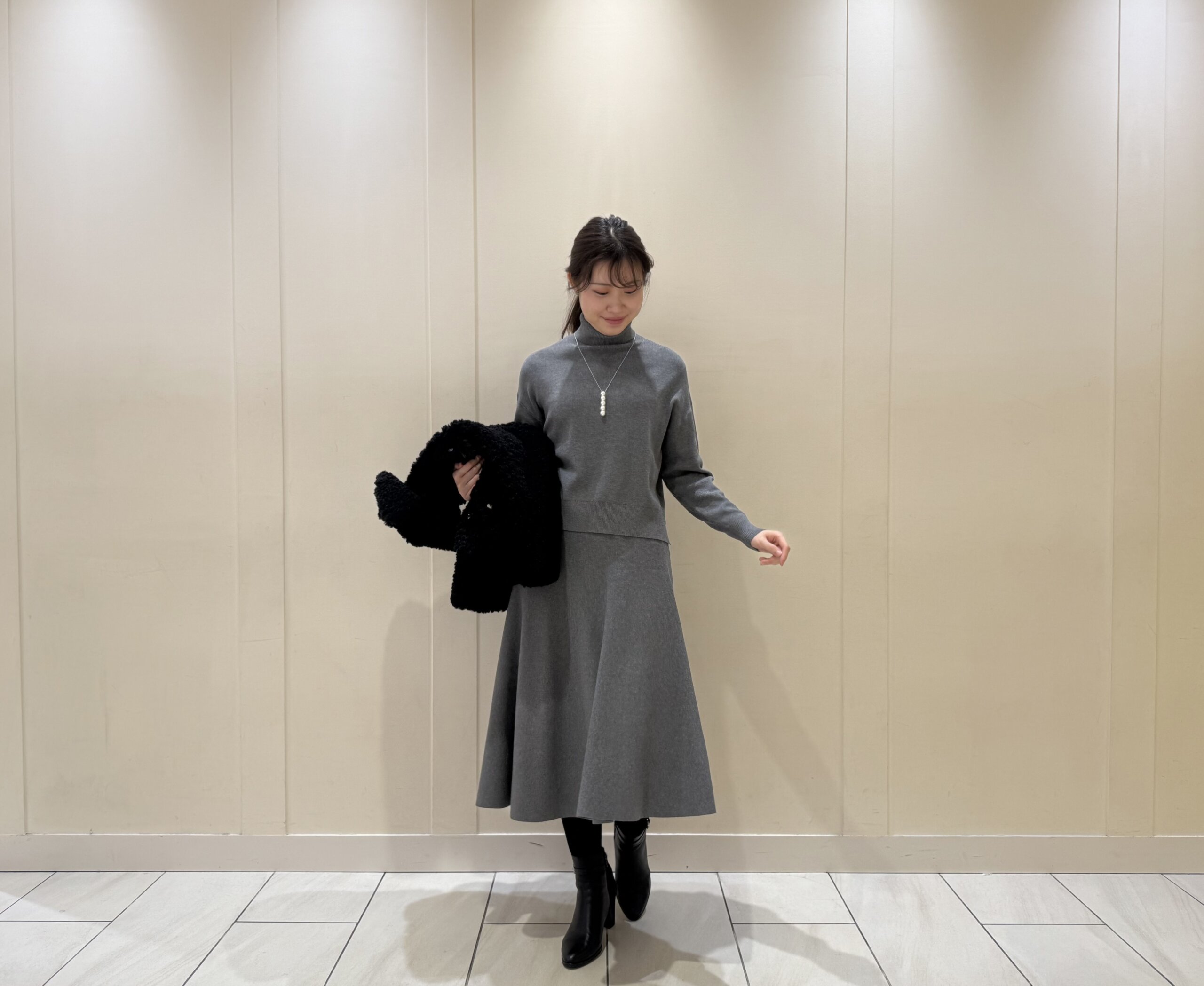 インナーには、グレーのニットトップス&フレアスカートのニットセットアップを合わせて上品な印象に。