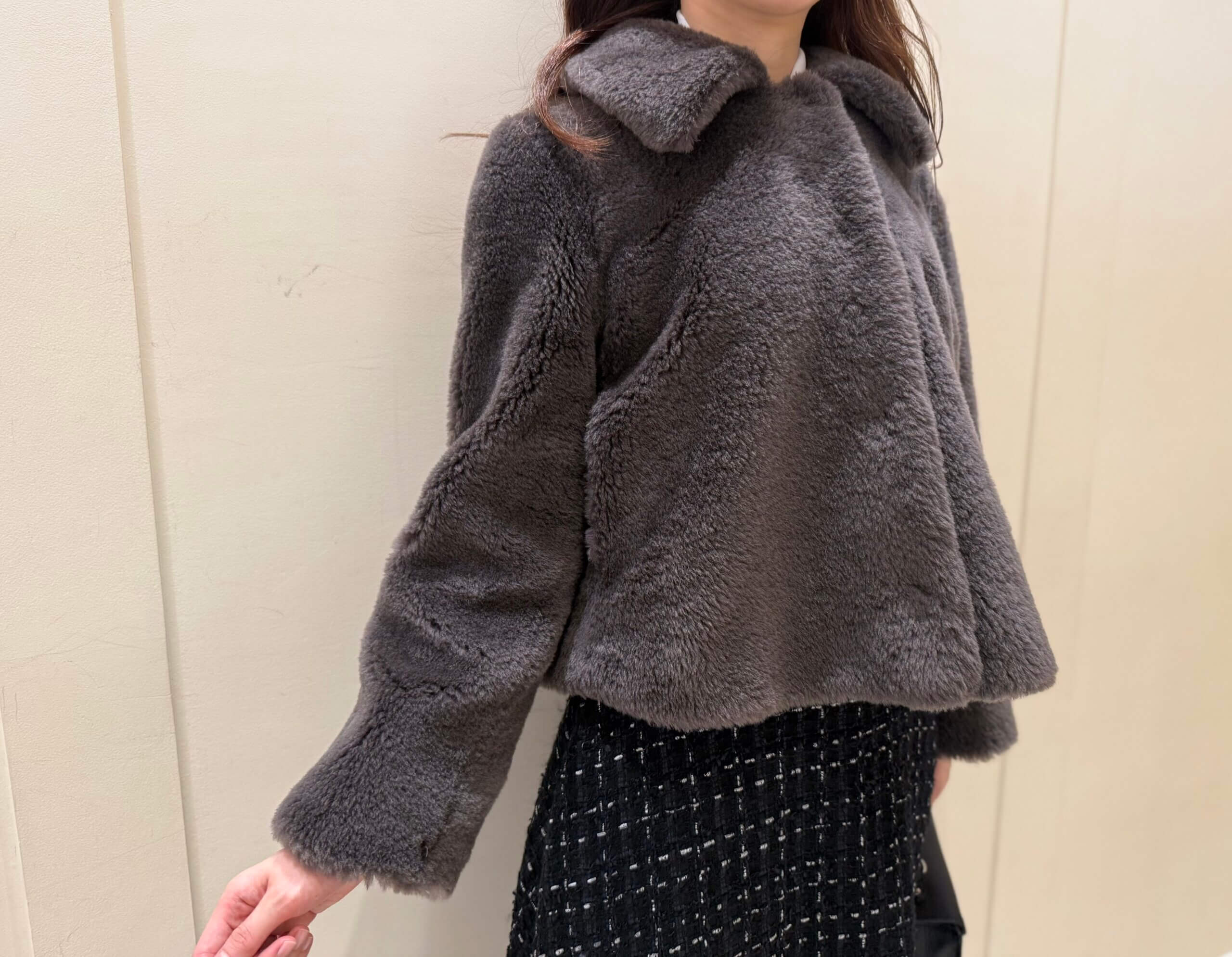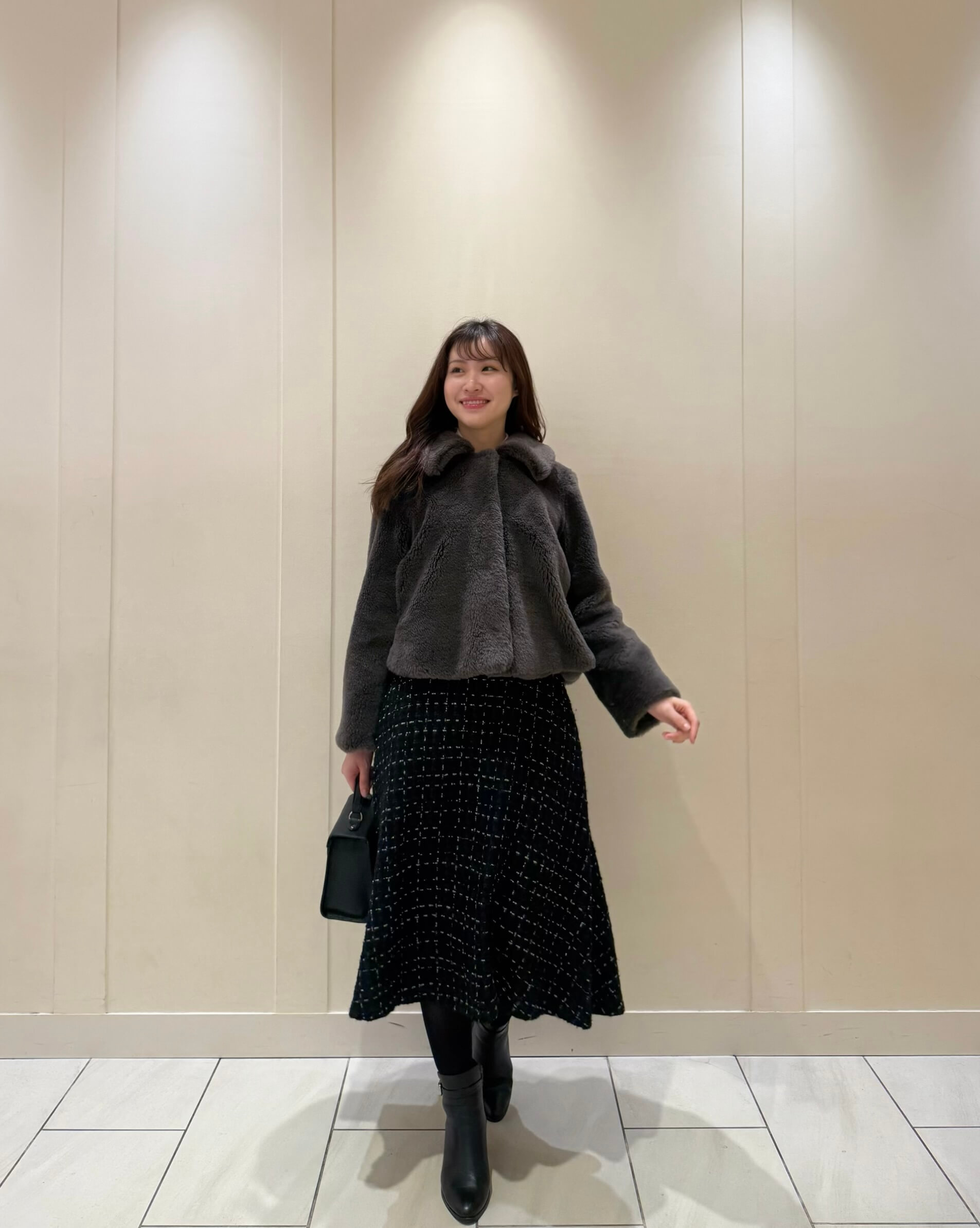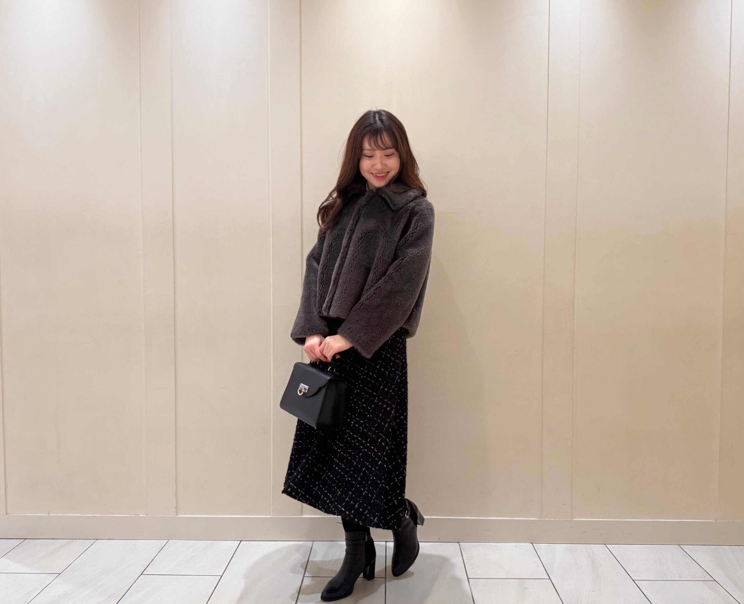 ボアの上質な質感とツイードの煌めき、ボウタイニットの上品さが、ホリデーシーズンを盛り上げてくれるコーデ。