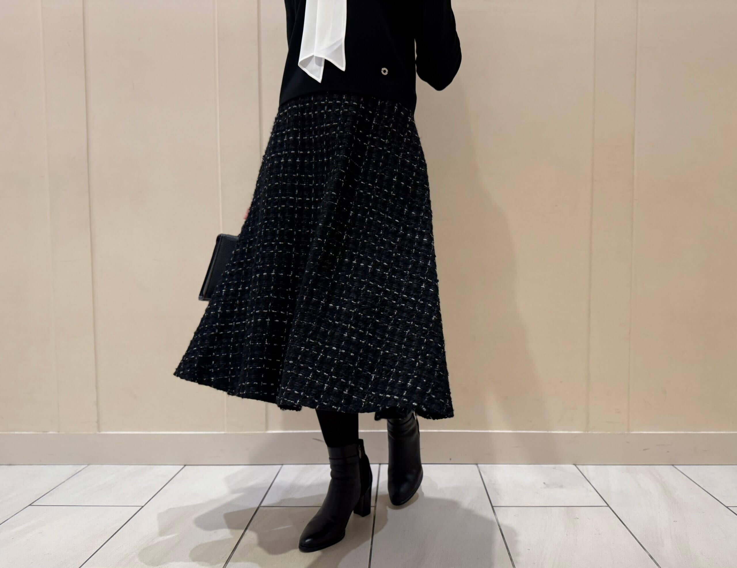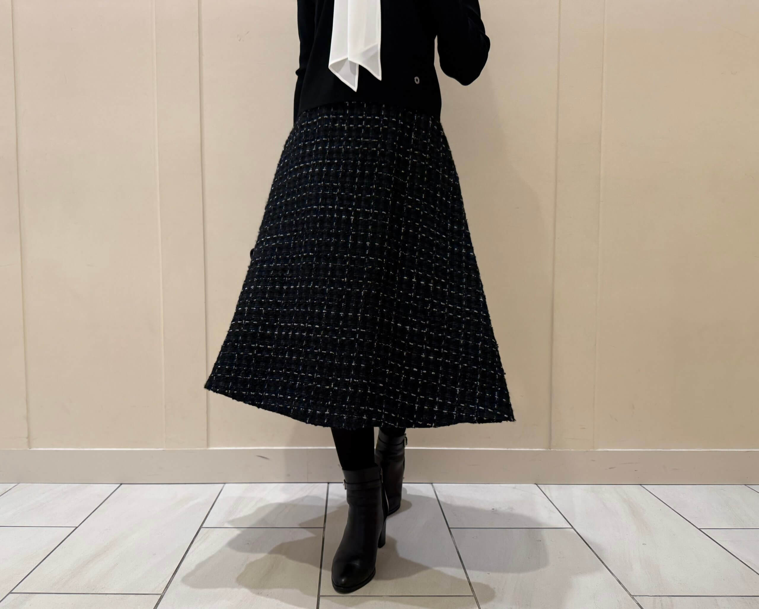 そんな上品ニットには、シーズンムード漂うツイードスカートを合わせて、フェミニンかつ華やかなスタイリングに。