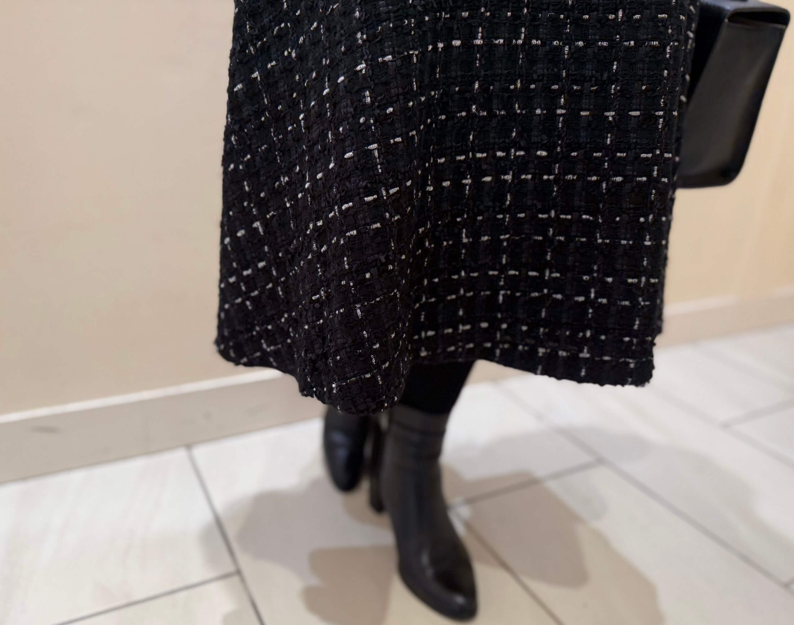 BLACK地にWHITEとSILVERの糸を織り交ぜた表情豊かなオリジナルツイード素材が、歩くたびにさりげなく輝きます。