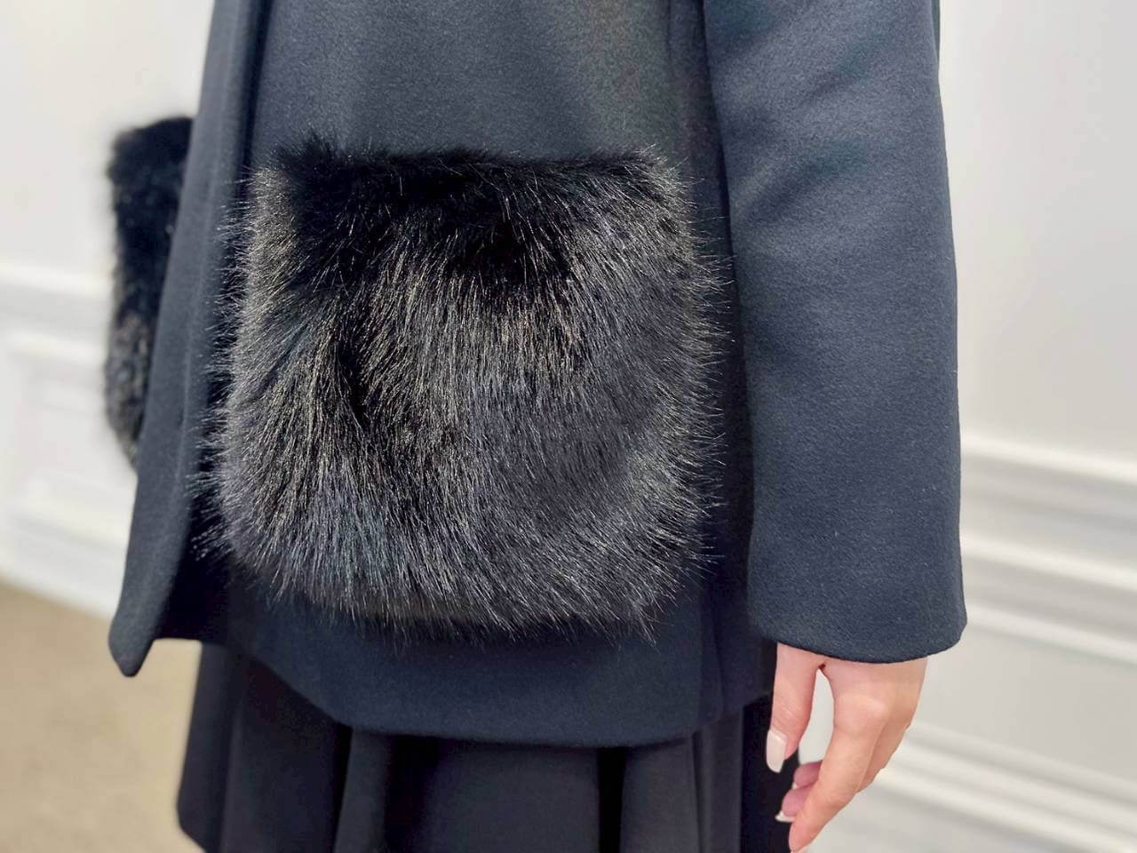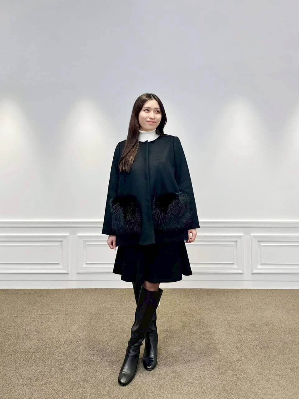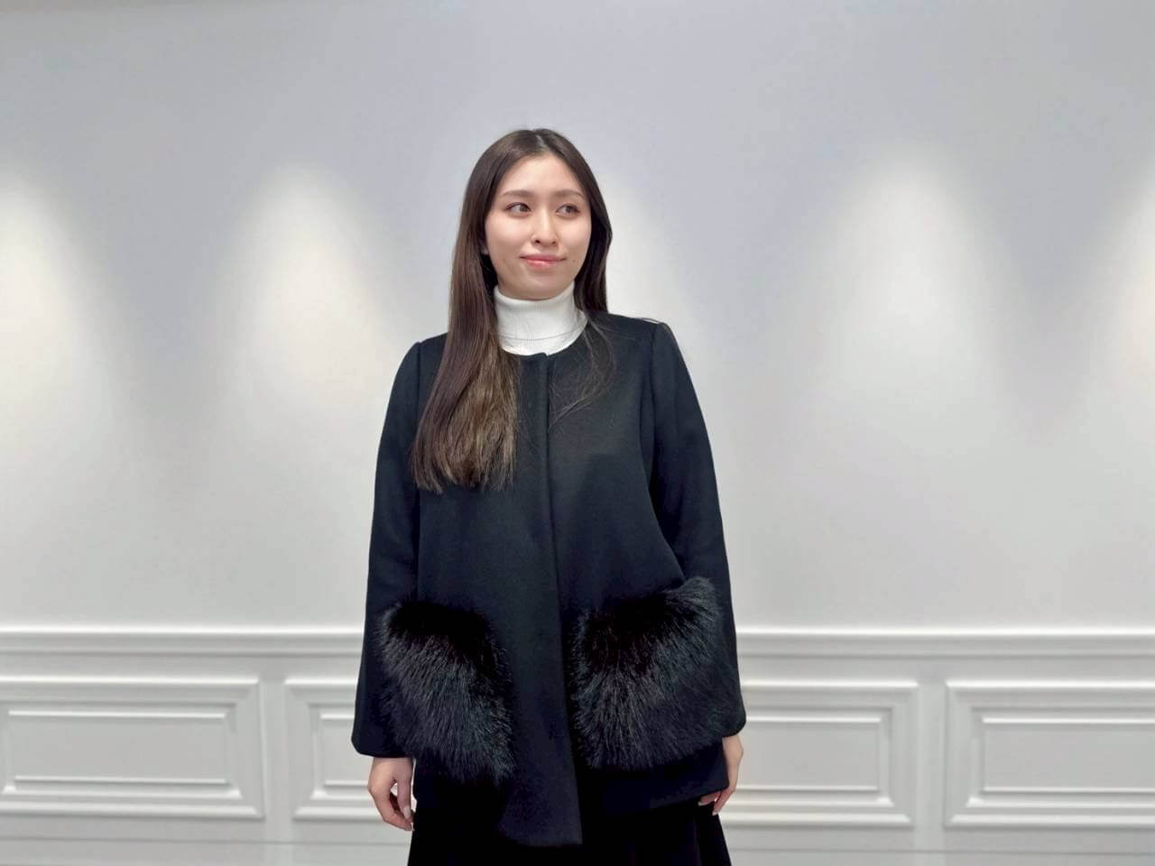 大きめのファーポケットは視線を引き寄せるポイント。上品なツヤとボリュームが、シンプルなフォルムにエレガントな華やぎをプラスしてくれます。ミドル丈のバランスがよく、パンツ・スカートどちらにも自然と馴染み、冬のアウターとして頼もしさ抜群です。