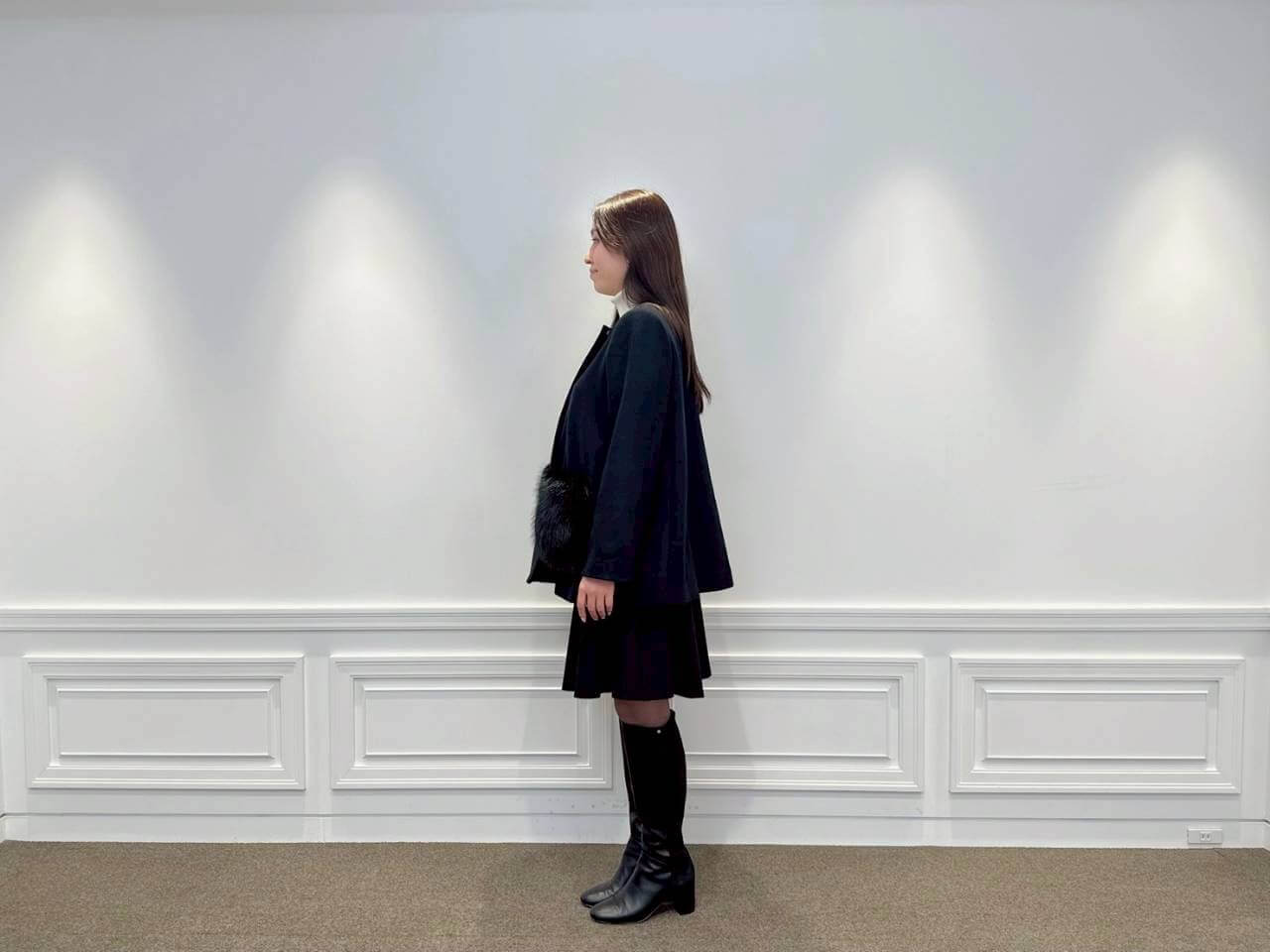 インナーにはネックビジュータートルネックニットを合わせて、顔まわりに明るさを。ブラックアウターと相性良く、さりげない華やかさが全体のバランスを品よくまとめてくれます。