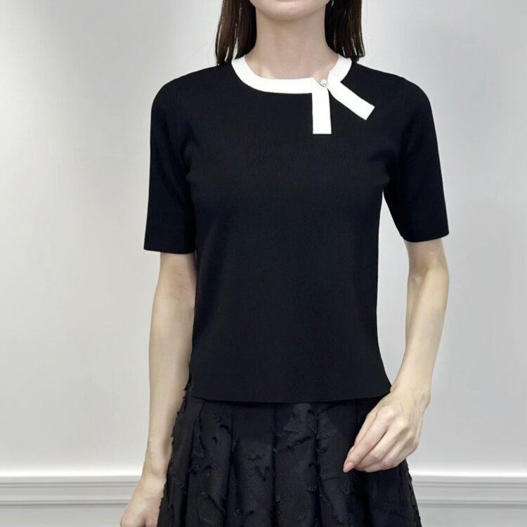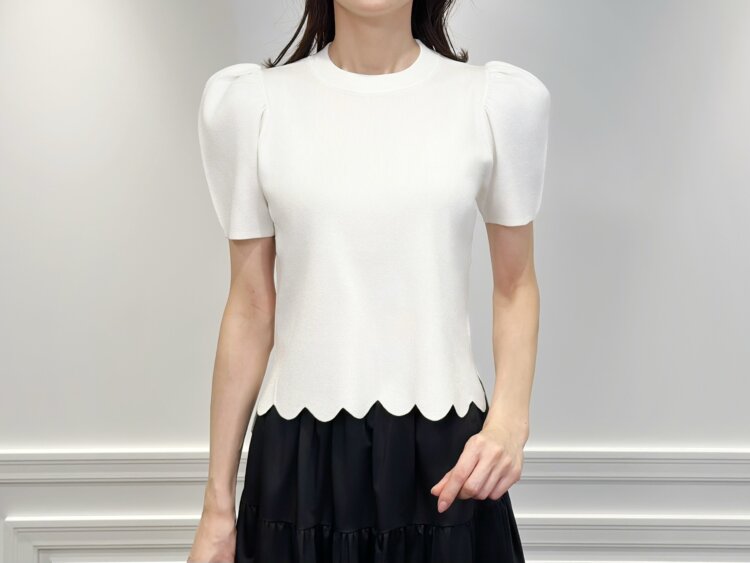 コーデ全体を見た時にパーンと印象的なリボン。近くで見るとパールも施されているところもポイントです。ダブルクロスの素材を使用しているのでホワイトのリボンもパキッとしすぎず、柔らかい雰囲気を感じます。この上からジャケットなどを羽織って綺麗にきまります。