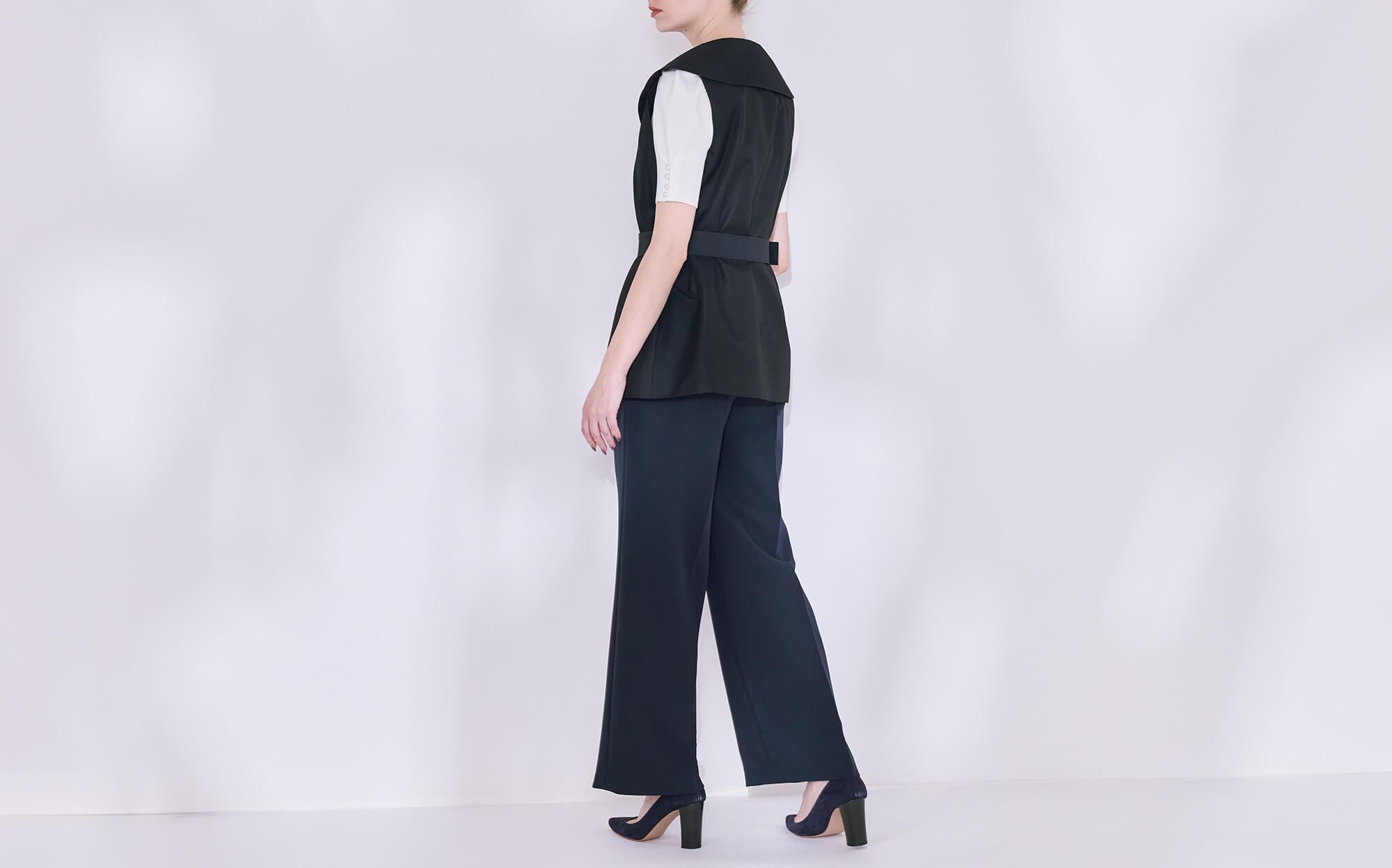 ネイビーのビッグカラーベルテッドジレは、装いに端正な存在感を添えてくれる一着。印象的なビッグカラーが肩まわりに優雅なラインを描き、シンプルなスタイリングにも自然と奥行きを生み出します。ウエストベルトでシルエットを整えることで、すっきりとした女性らしいバランスに。