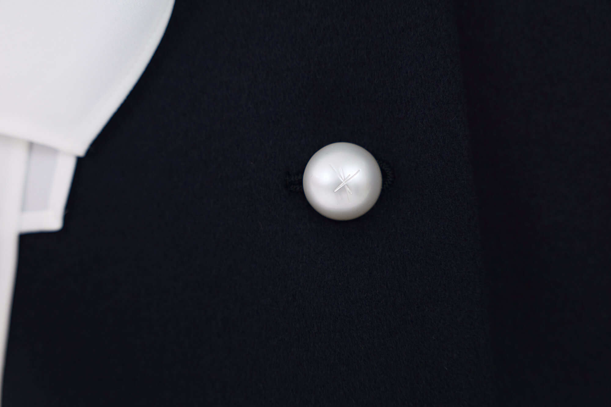 フロントの大粒パールボタンがクラス感を放ち、シンプルな中に女性らしい華やかさを添えます。