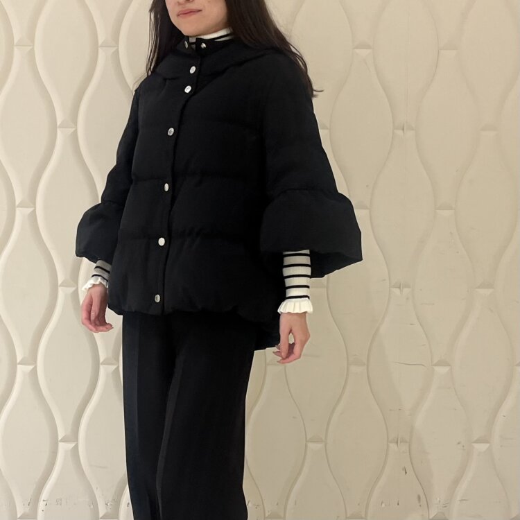インナーにはタートルネックを合わせて上品にお召しいただくのがオススメ♪ワンピース自体がシンプルなお作りなのでボーダーラインの入ったニットなどで合わせていただいても素敵に仕上がります。