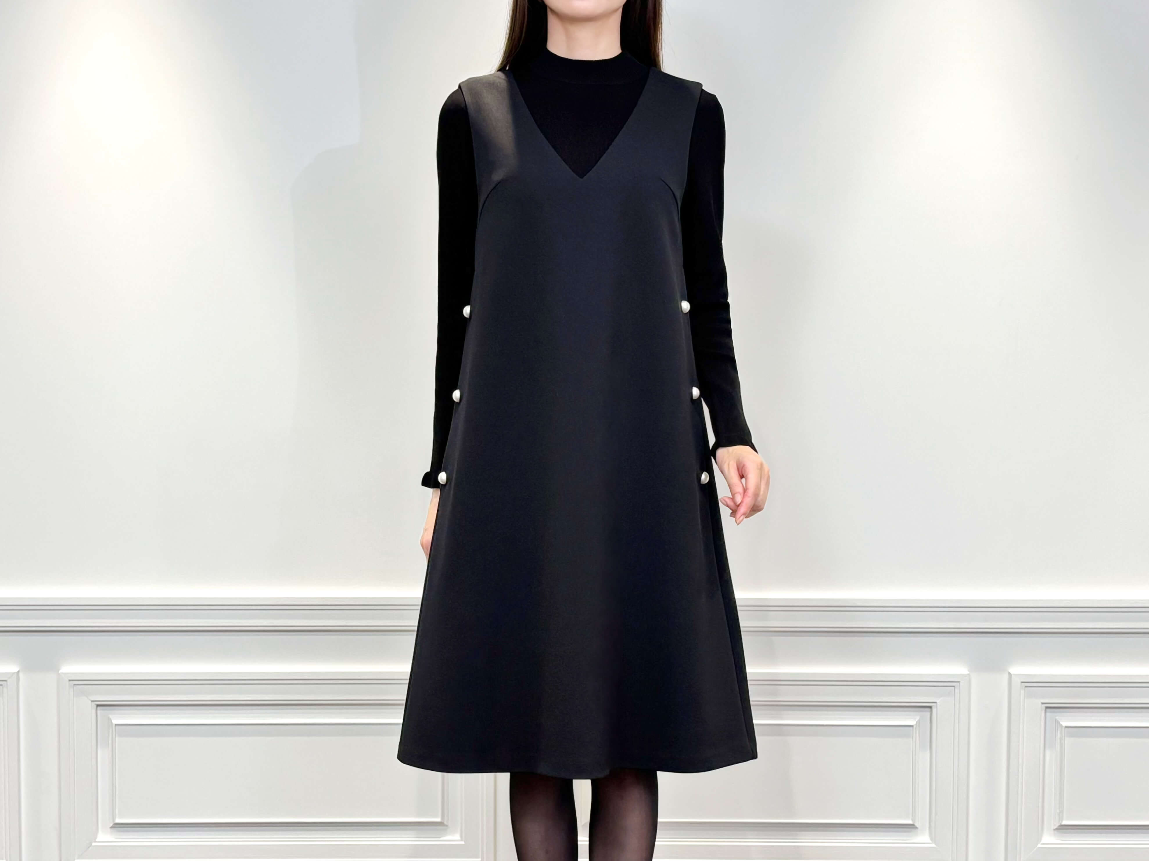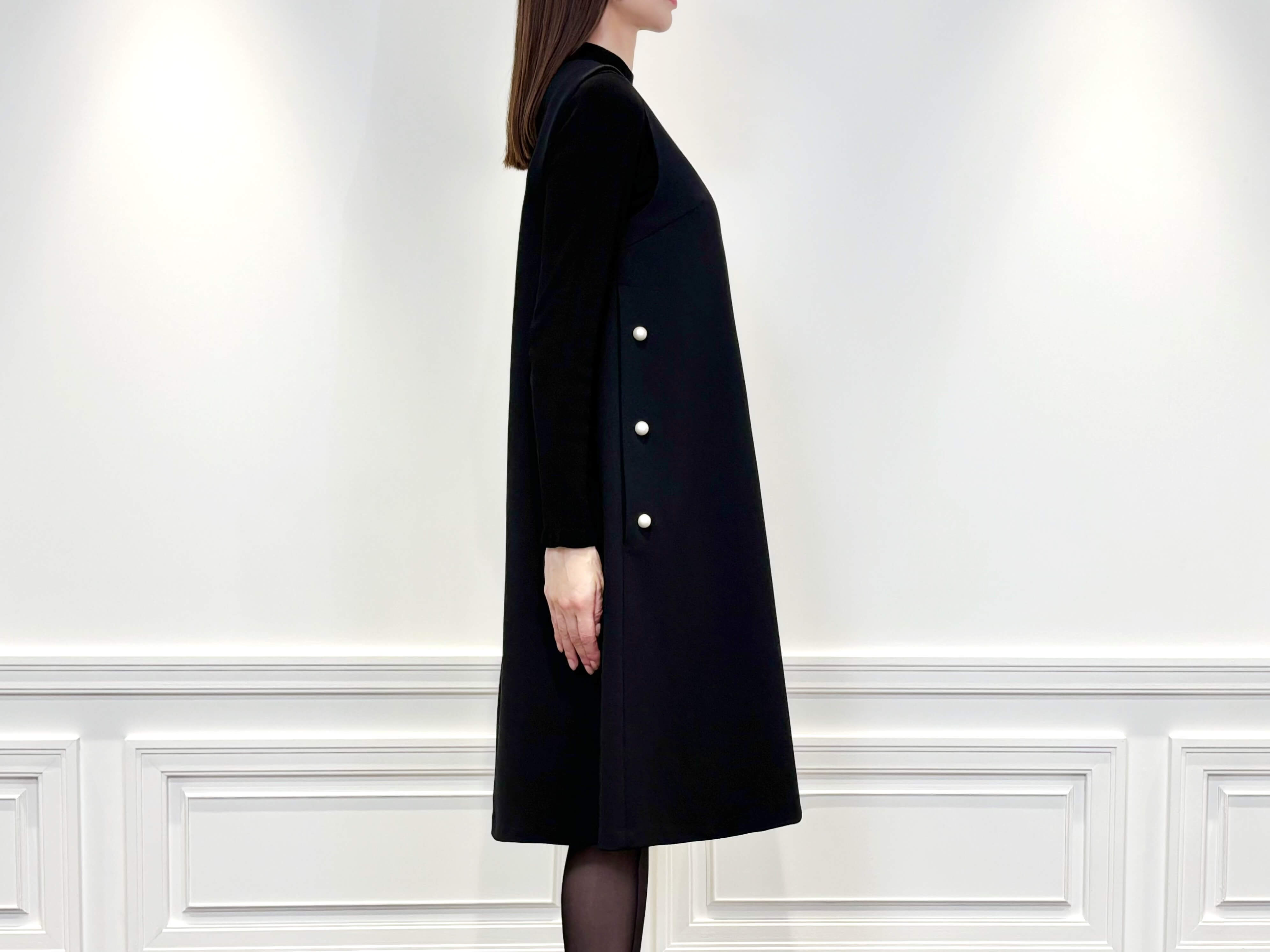 サイドにあしらわれたパールボタンがポイントの、柔らかな落ち感が美しいジャンパースカート。
