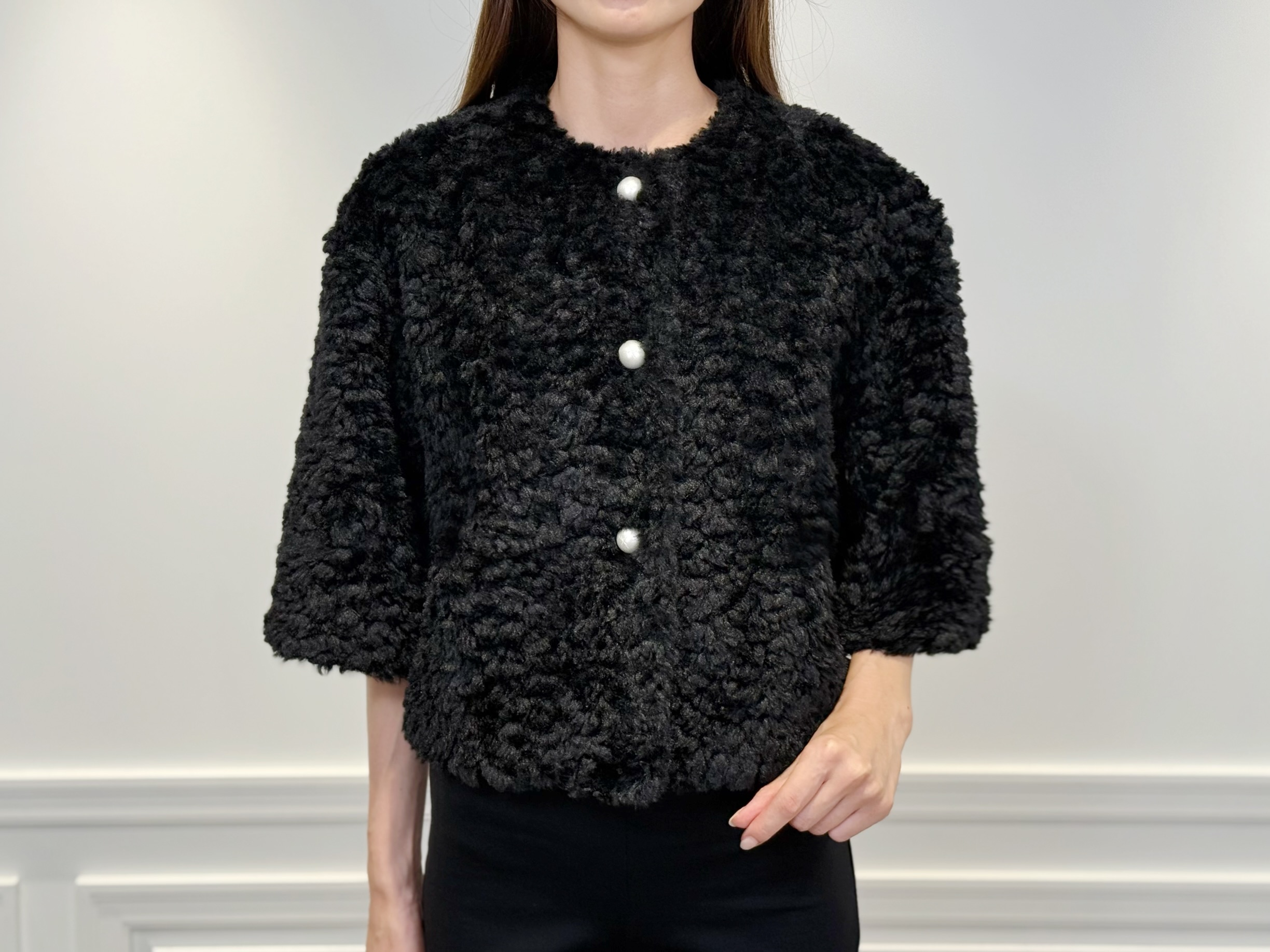 ふんわりとしたカールファーがコート全体に柔らかな立体感と女性らしい華やぎを添える一着。