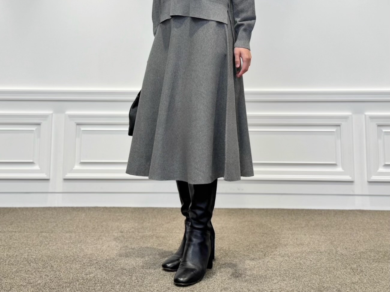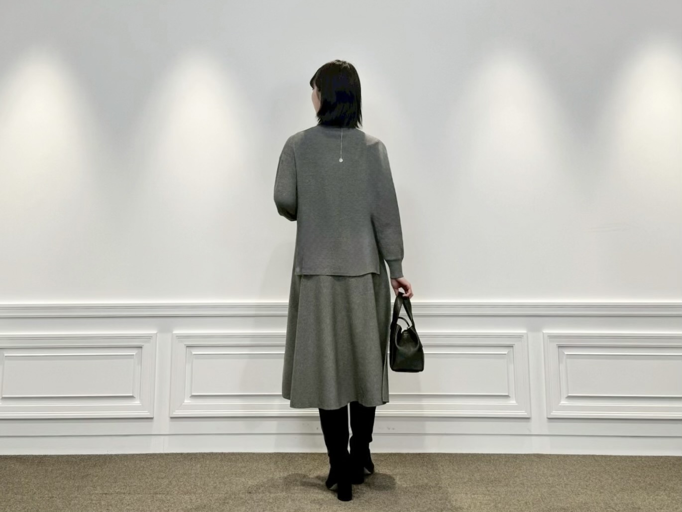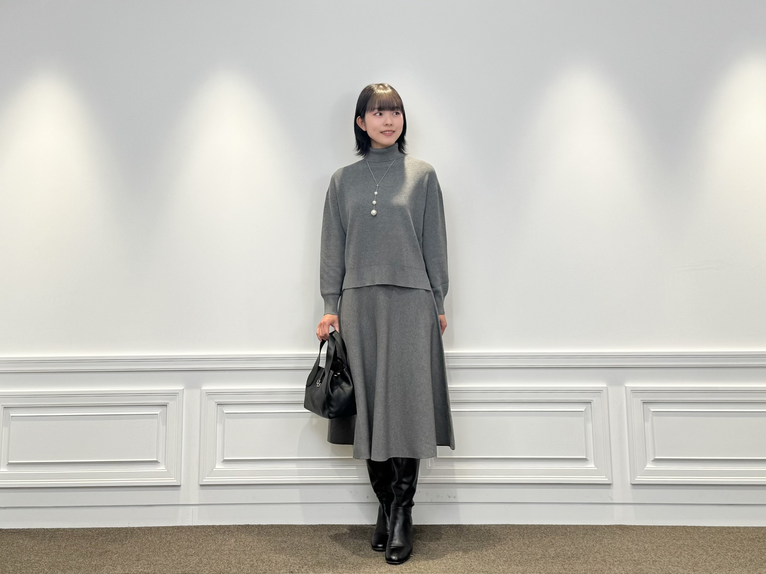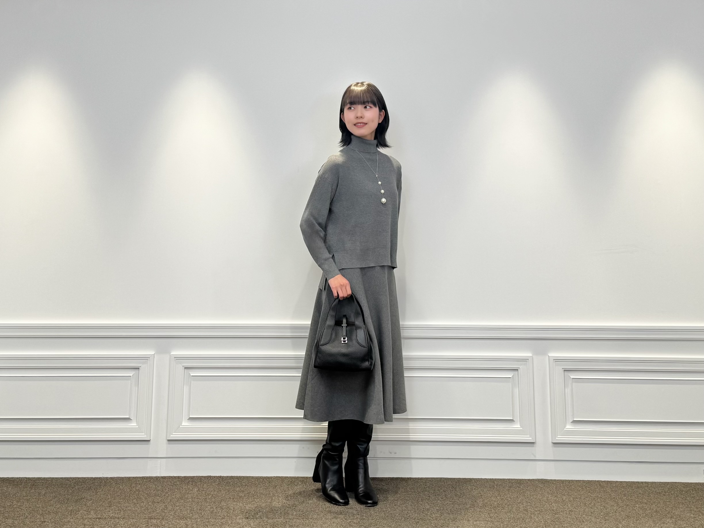 バッグは2WAY仕様のレザーハンドバッグで、通勤にもぴったりなサイズ感と上質な見た目が◎。足元はブラックのロングブーツで引き締めて、きちんと感を忘れずにまとめました。