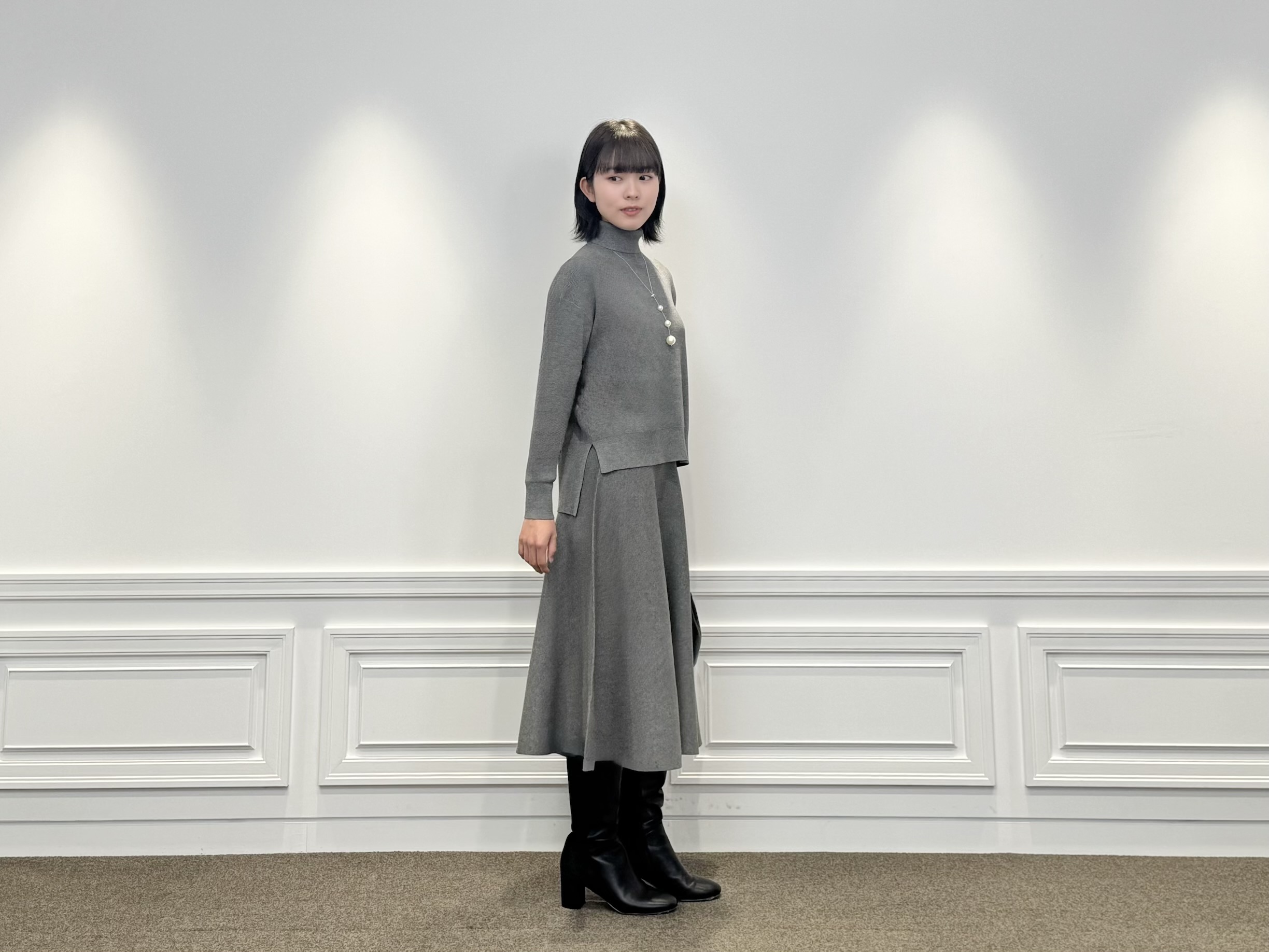 お仕事帰りの予定も安心。グレーの上品セットアップで魅せる冬のきれいめコーデ