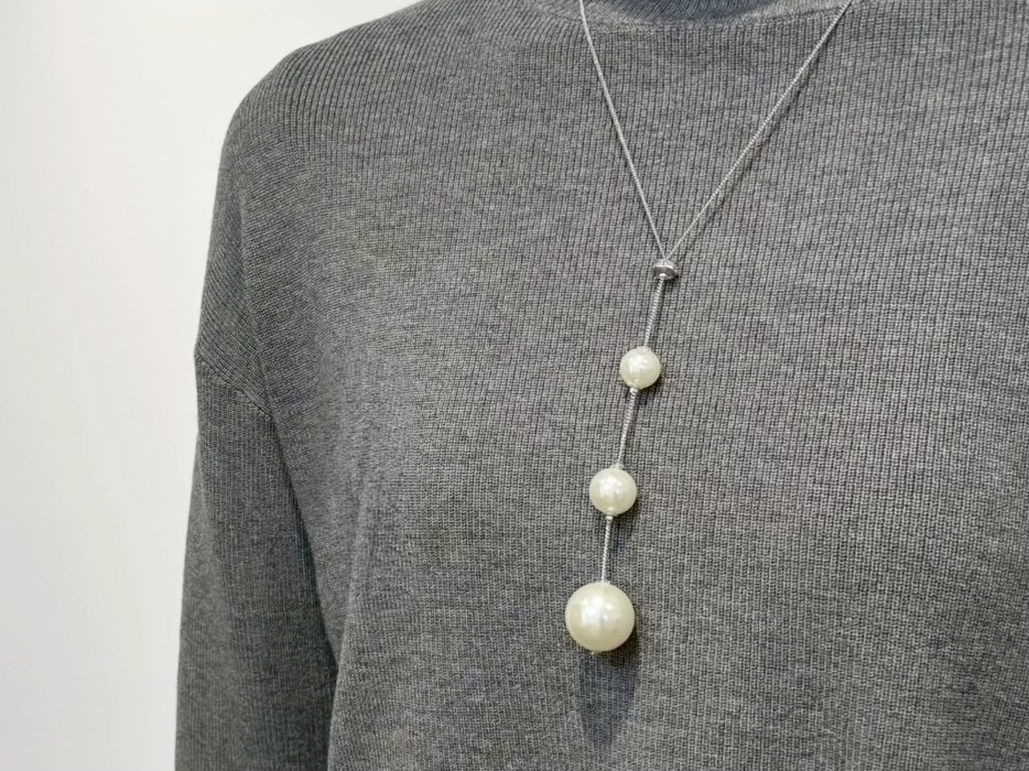 ネックレスは3つの異なる大きさのパールが連なったロングタイプをチョイス。縦のラインを強調することでスタイルアップ効果もあり、着こなしにアクセントを与えてくれます。