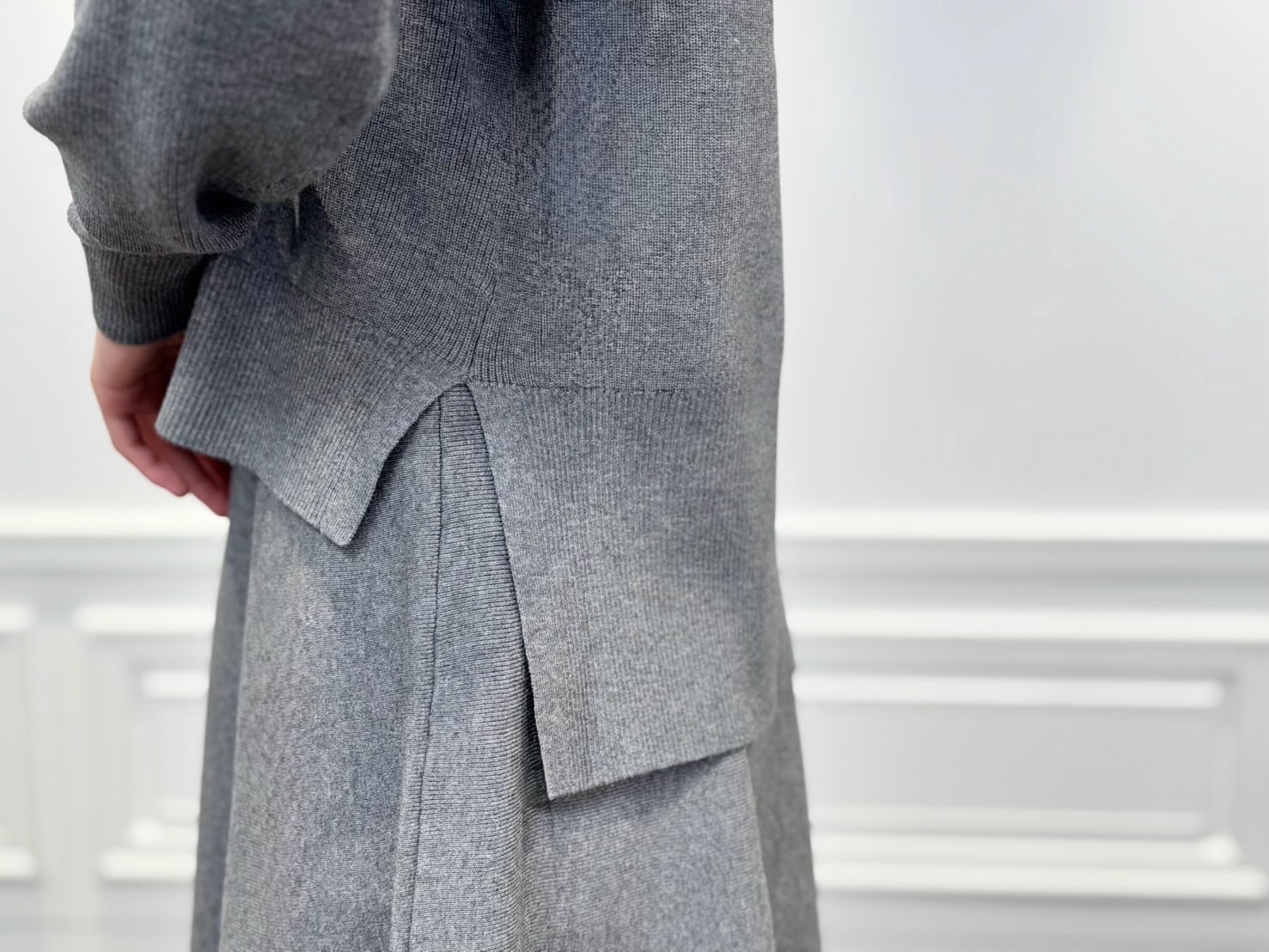 「今日は仕事の後に予定があるけれど、着替えずにスマートに移動したい」そんな日におすすめしたいのが、グレーのハイネックニットとスカートのセットアップコーデ。上質な素材感とゆとりのあるシルエットが、オンにもオフにもマッチする万能スタイルです。ワントーンで仕上げることで、上品さと今っぽさを両立できるグレーのセットアップ。予定がある日も自信を持って過ごせる、そんな一着です。