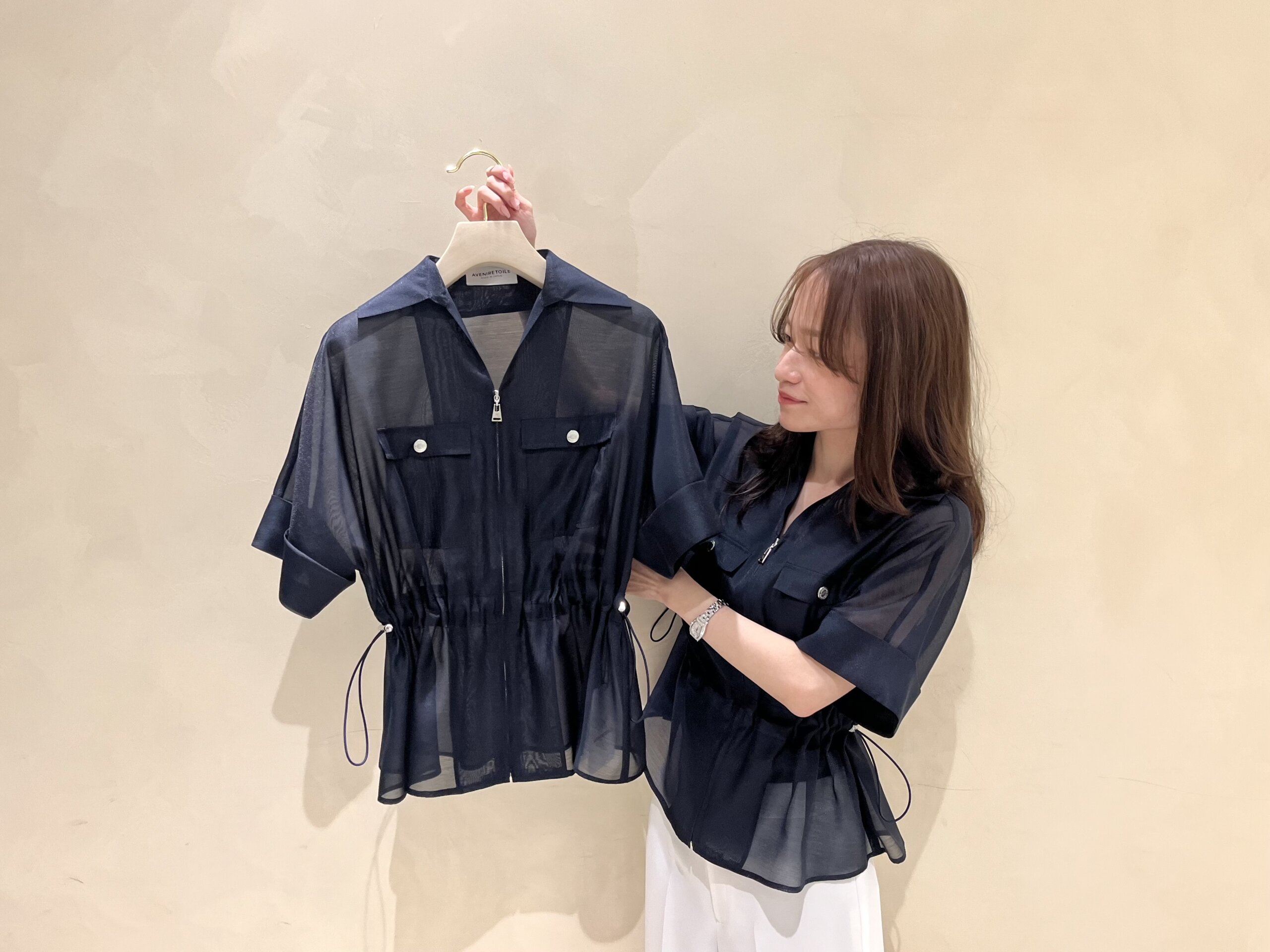 シアー素材のニュアンスを生かしたワンランク上の着こなしをおたのしみいただけます。