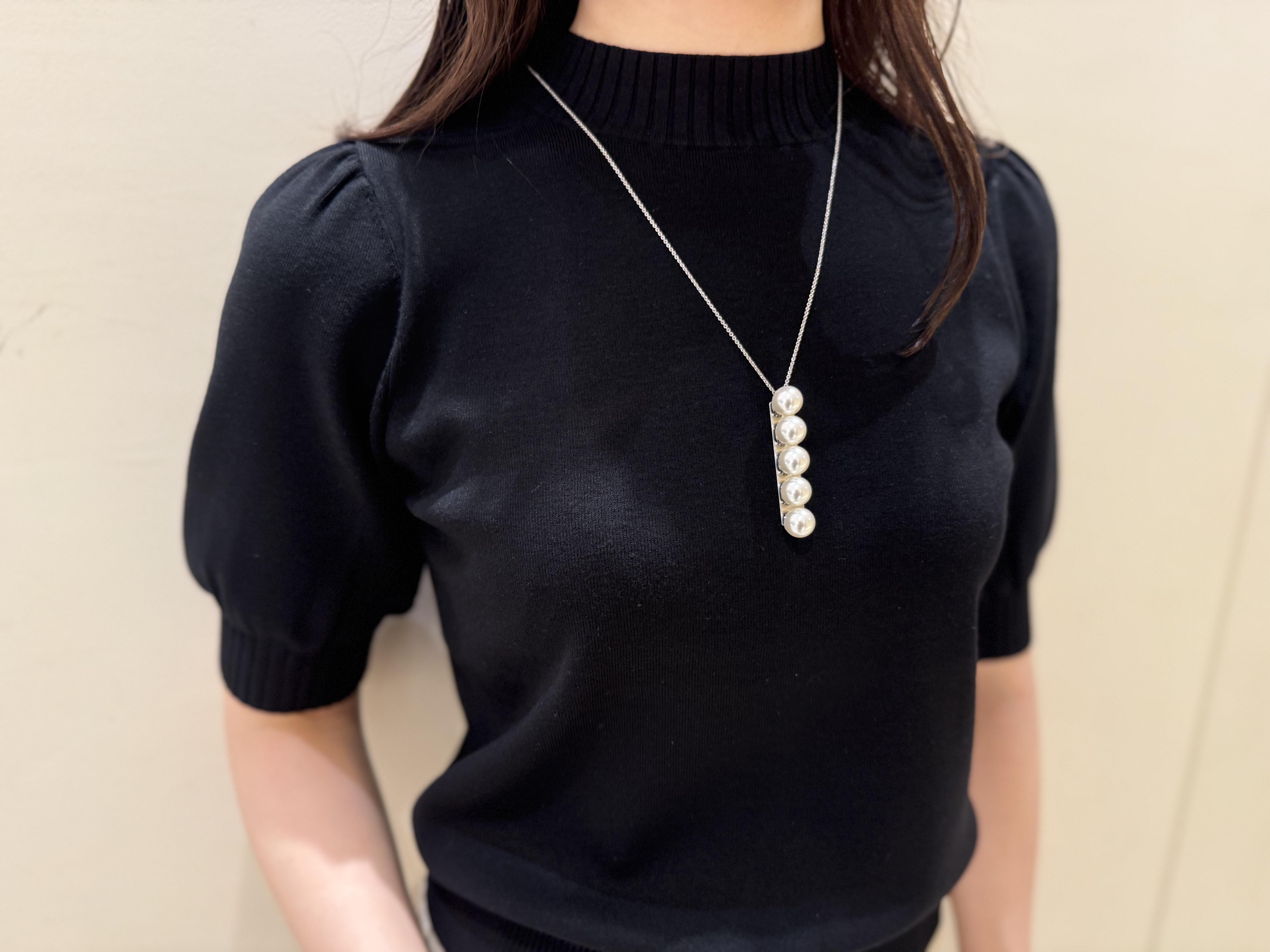 大きめのリボンタイとパールボタンが顔回りを華やかに。