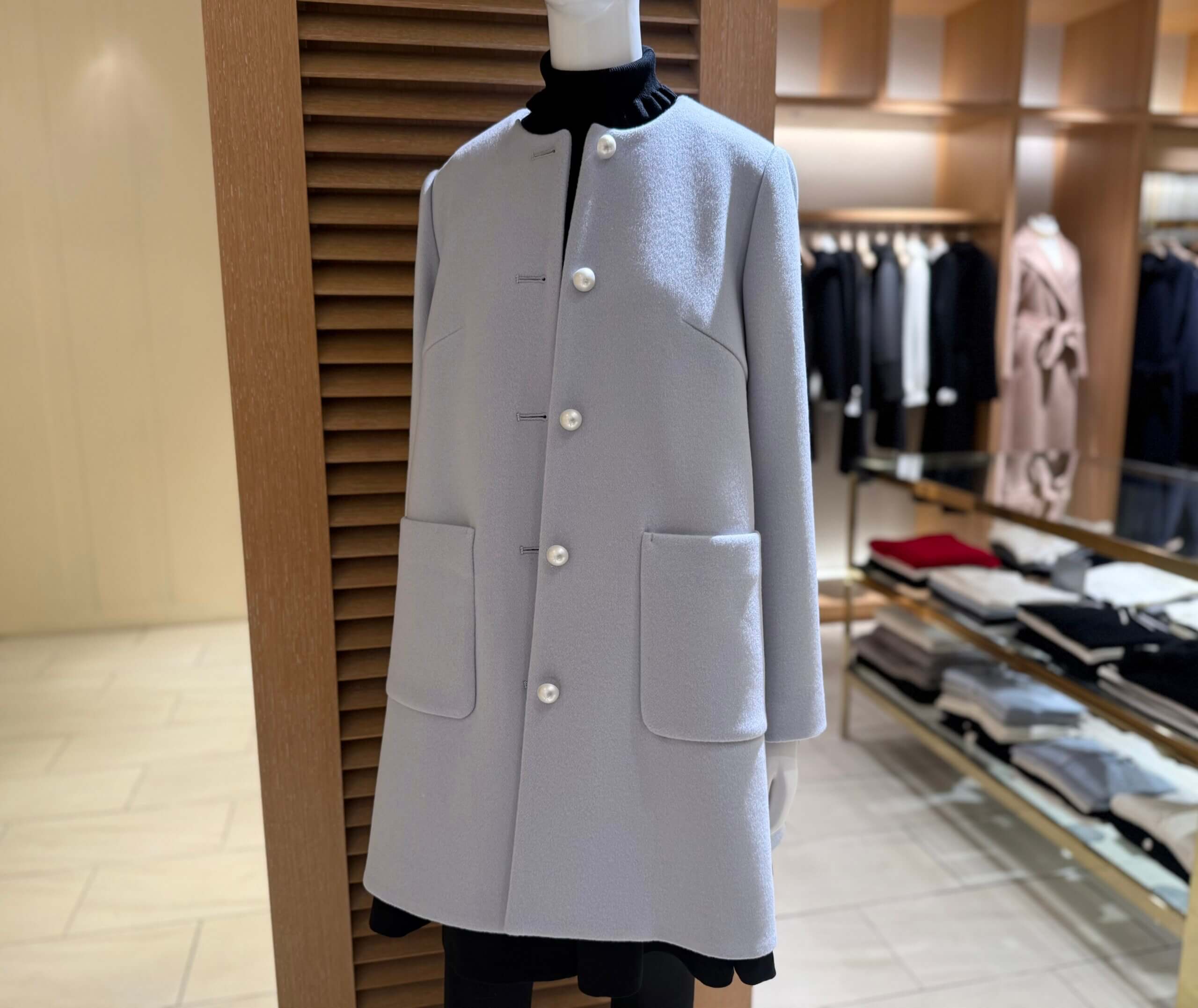 淡いペールブルーが目を惹くミドル丈のウールコートがランクイン!しなやかで上質なSuper170’sウールビーバー素材を使用しており、冬の装いをエレガントに彩ってくれる1着です。すっきりとした印象のノーカラーデザインと、大きめのパールボタンが女性らしい華やぎを添えます♡
