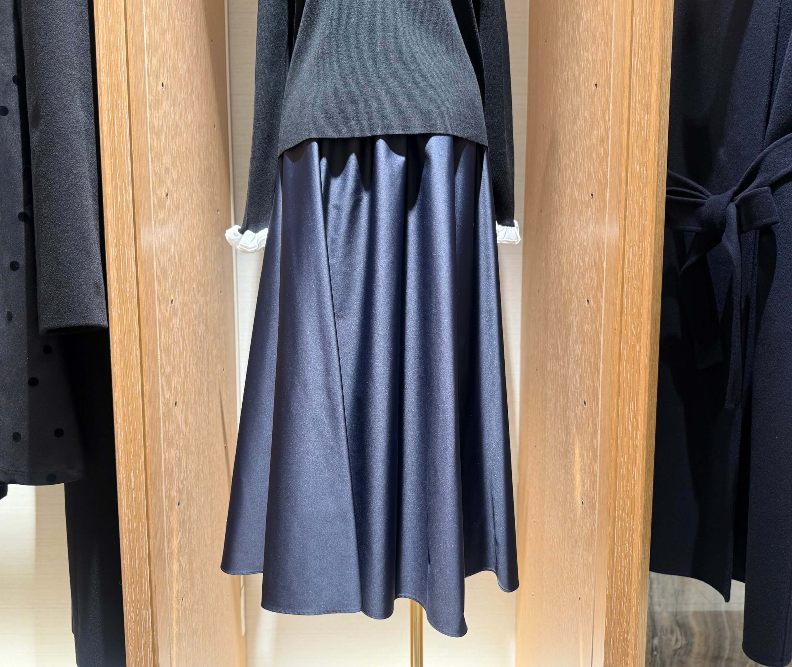程良い光沢感と美しいフレアシルエットが魅力的なフレアスカート!ふんわりとボリューム感のあるシルエットは、コンパクトなニットと好相性◎。軽やかな揺れ感と快適なウエストゴムで、オンオフ問わず活躍する優秀アイテムです。新宿店では、ネイビーが人気でした!