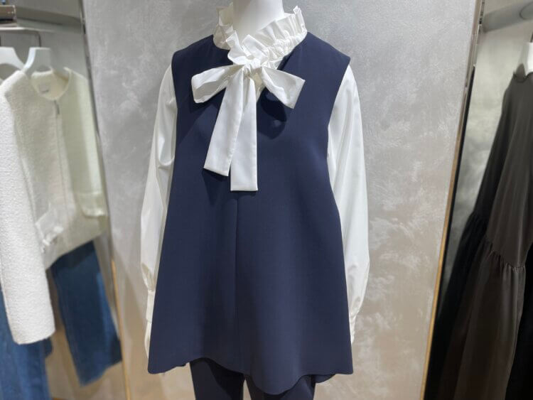 一枚でお召しいただくのはもちろん、写真のようにジレと合わせてレイヤードコーディを楽しんでいただくのもおすすめです◎