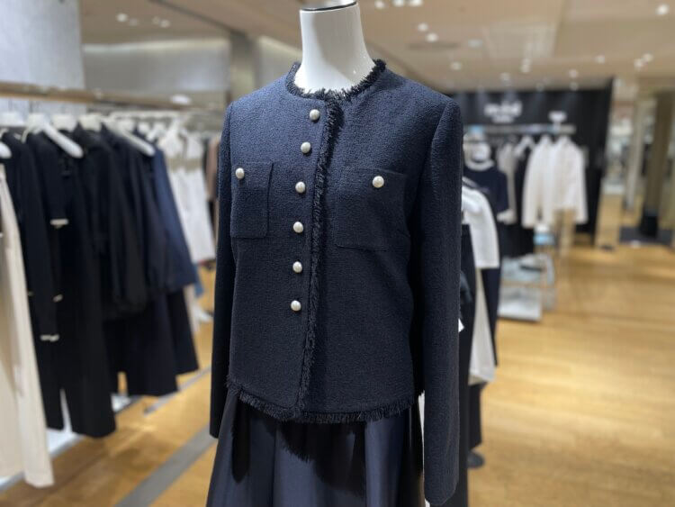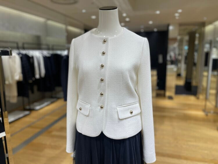 ニットジャケットやツイードジャケットに合わせて華やかなコーディネートに仕上げるのがおすすめです◎