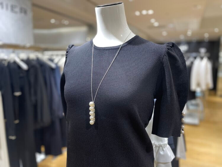 直線に並ぶパールがコーディネートをエレガントに昇華してくれる逸品。