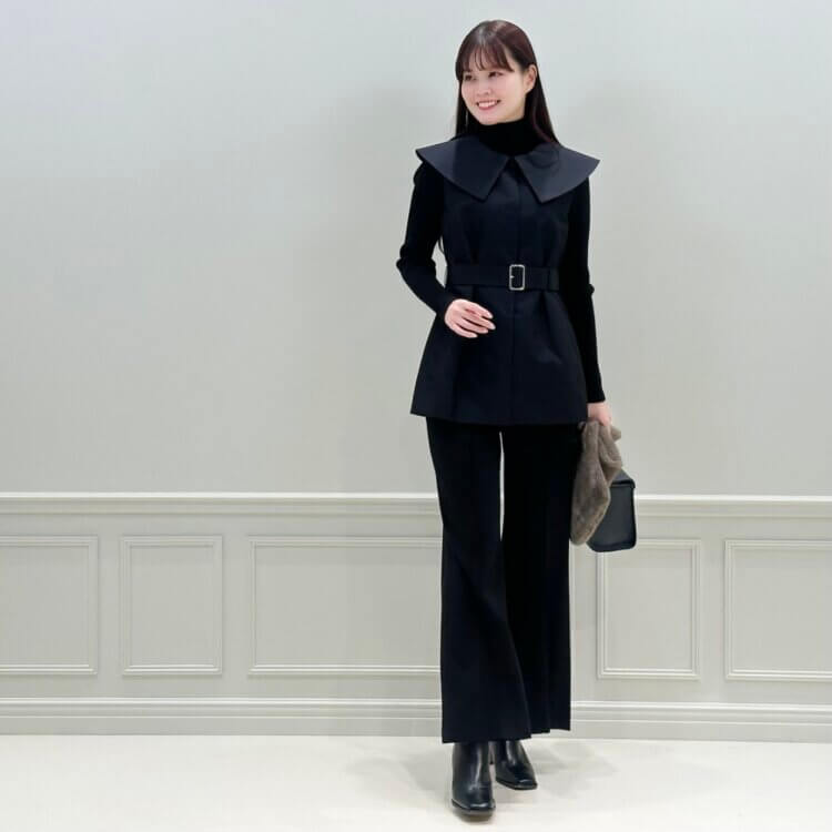 スリットネックが首元をスッキリ見せてくれ、女性らしいデコルテラインが際立ちますね。
