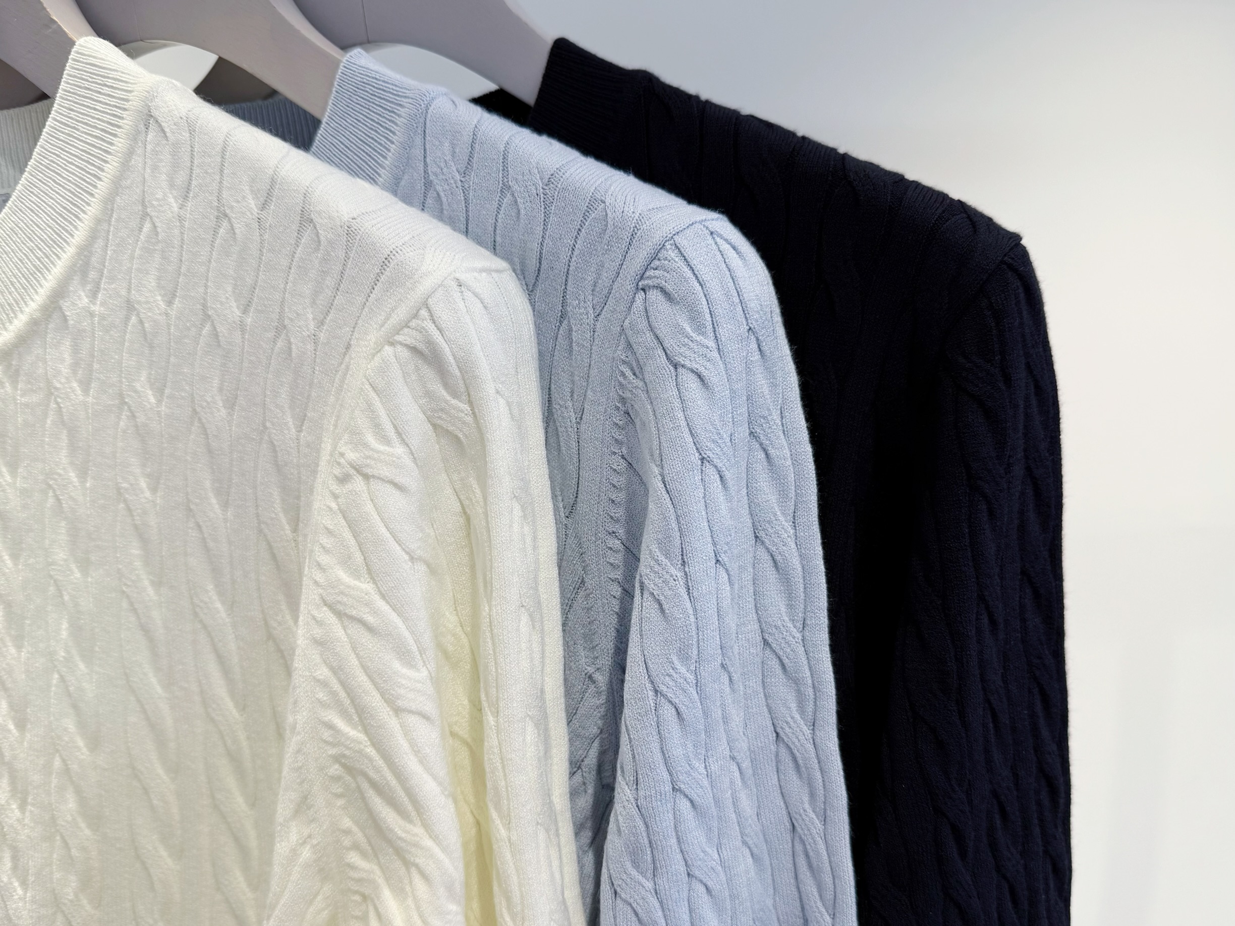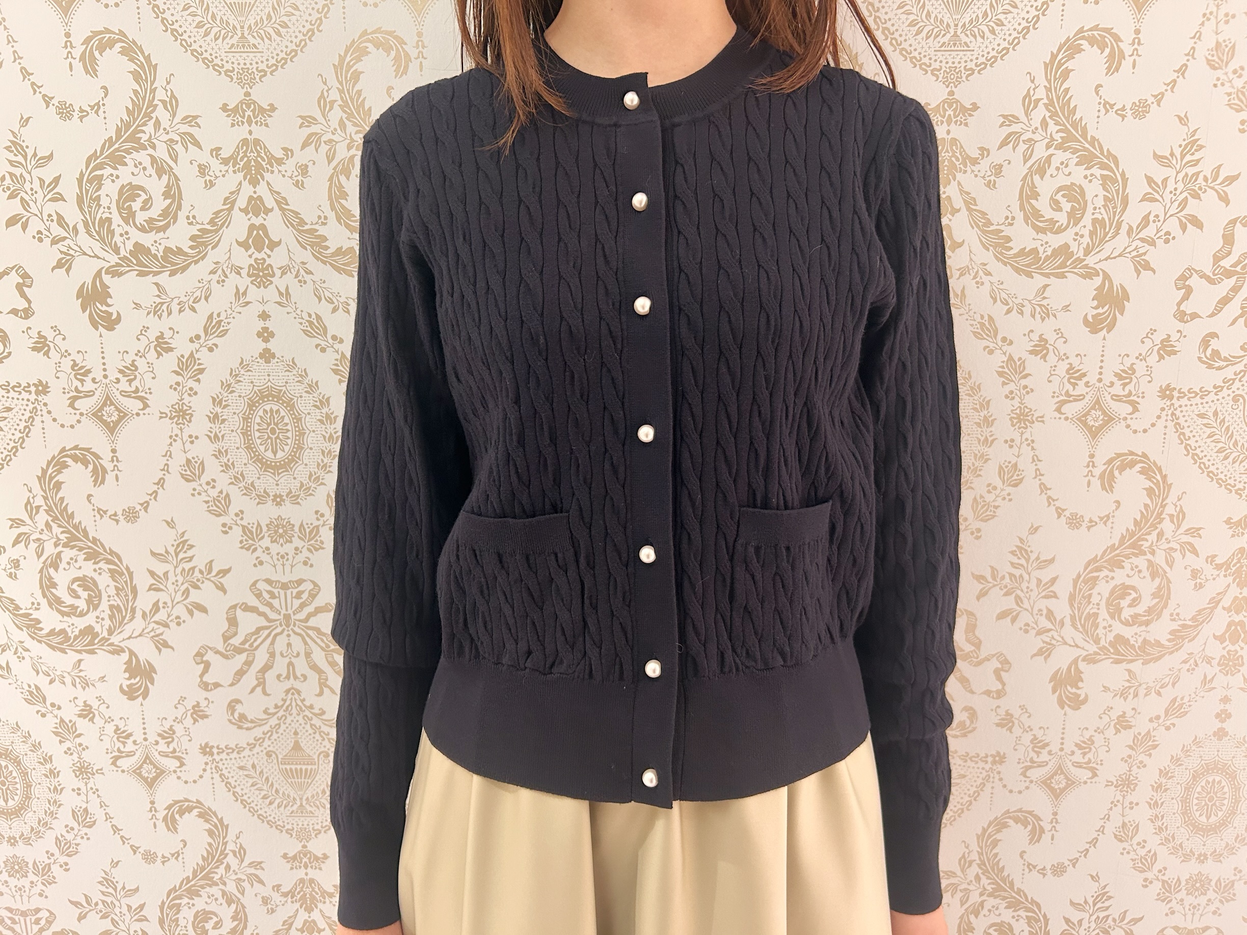 上品なケーブル編みが際立つ、エレガントなニットカーディガン。
