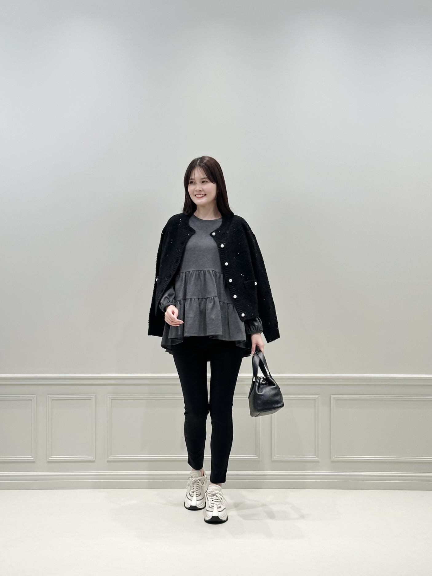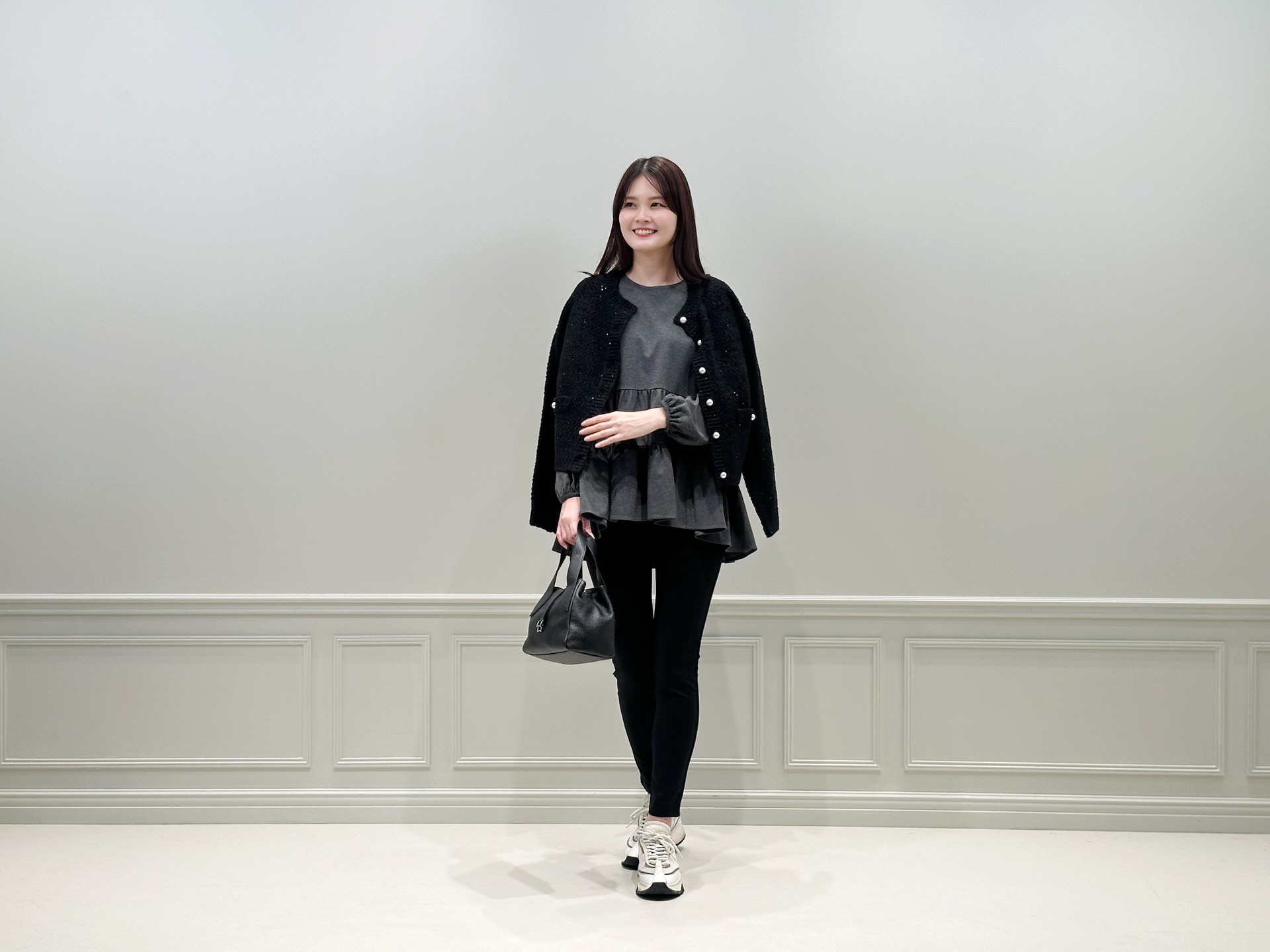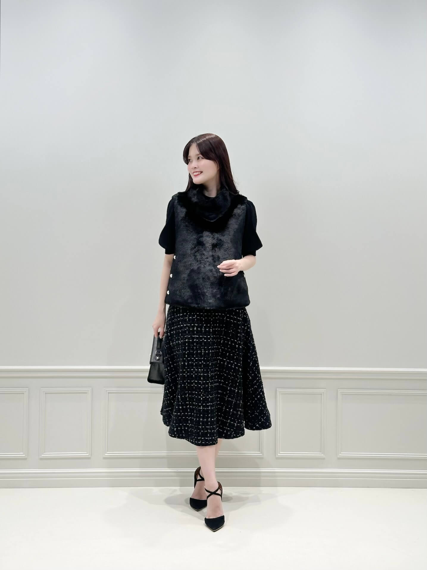 少しゆとりのあるフレアシルエットがエレガントで、シンプルなニット等にジレ風に重ねるだけで洗練された着こなしを完成させてくれます。